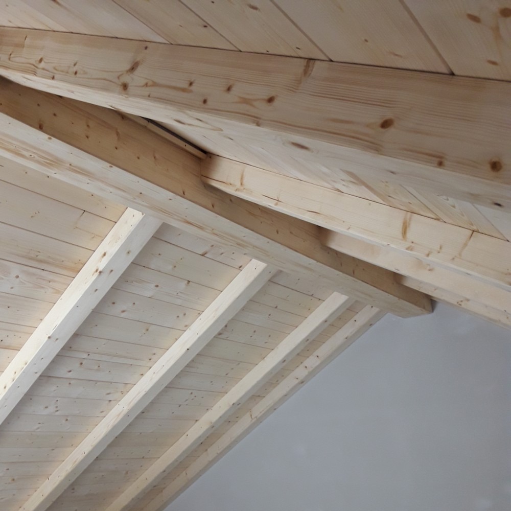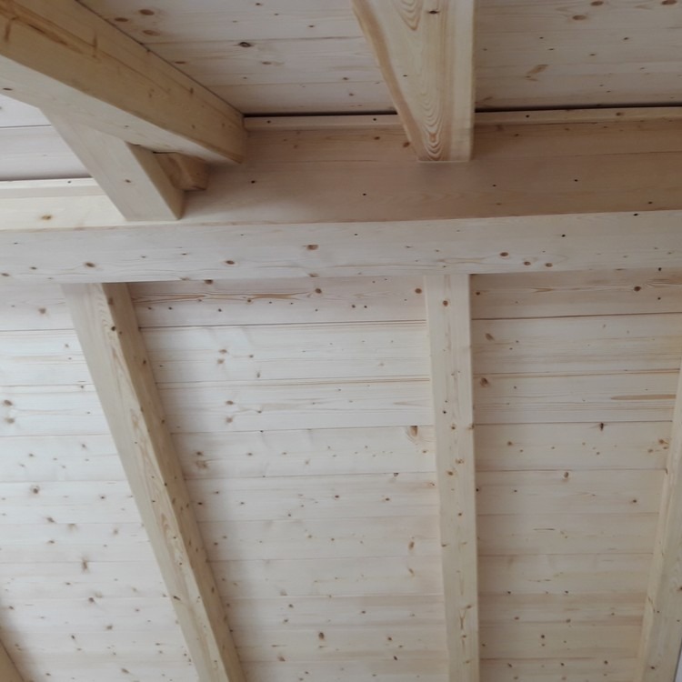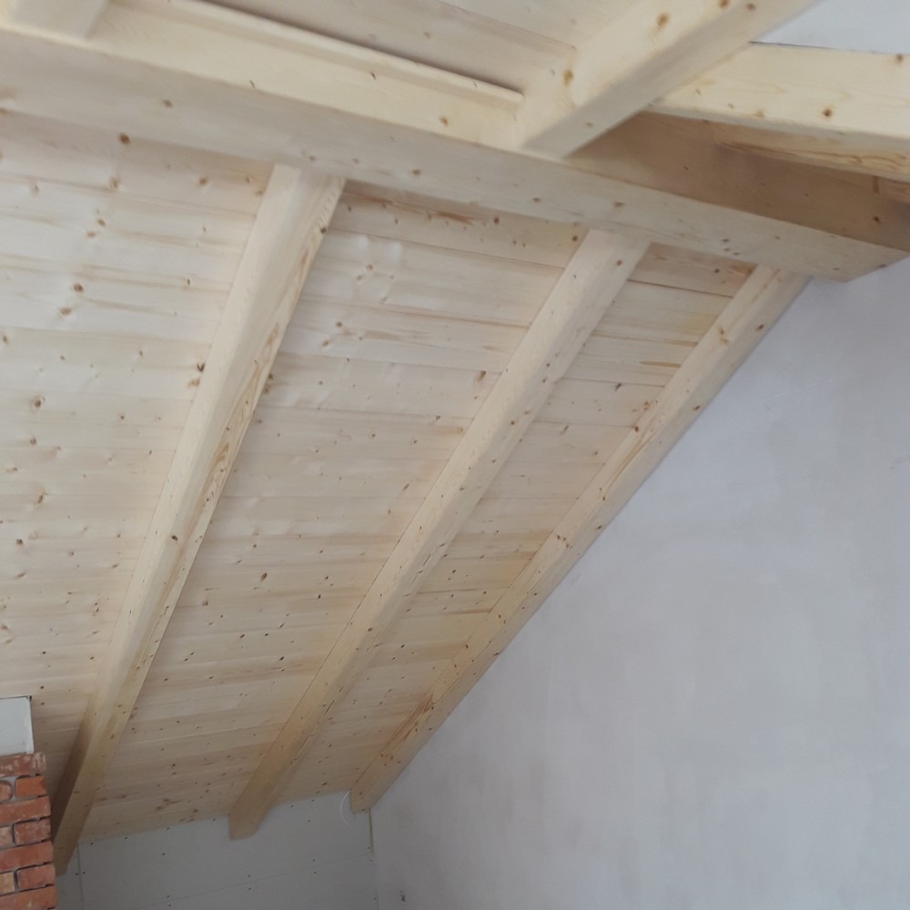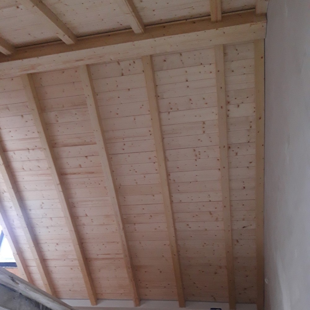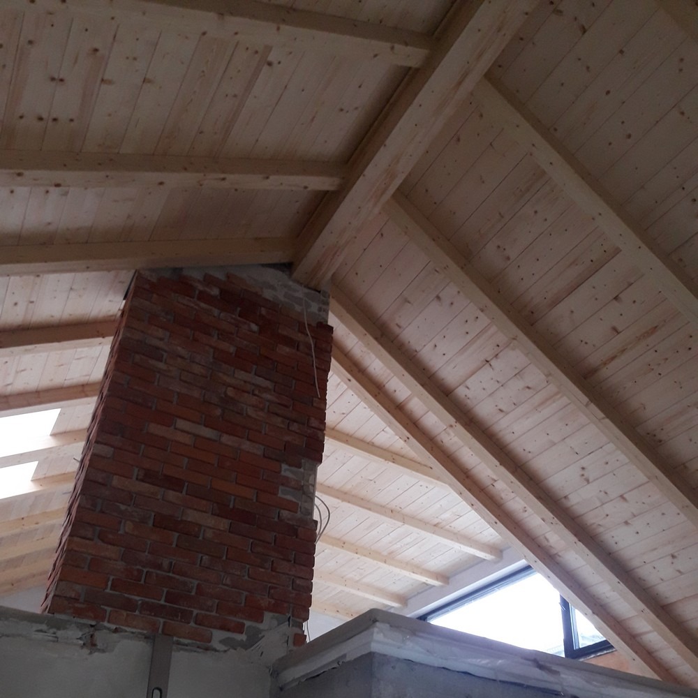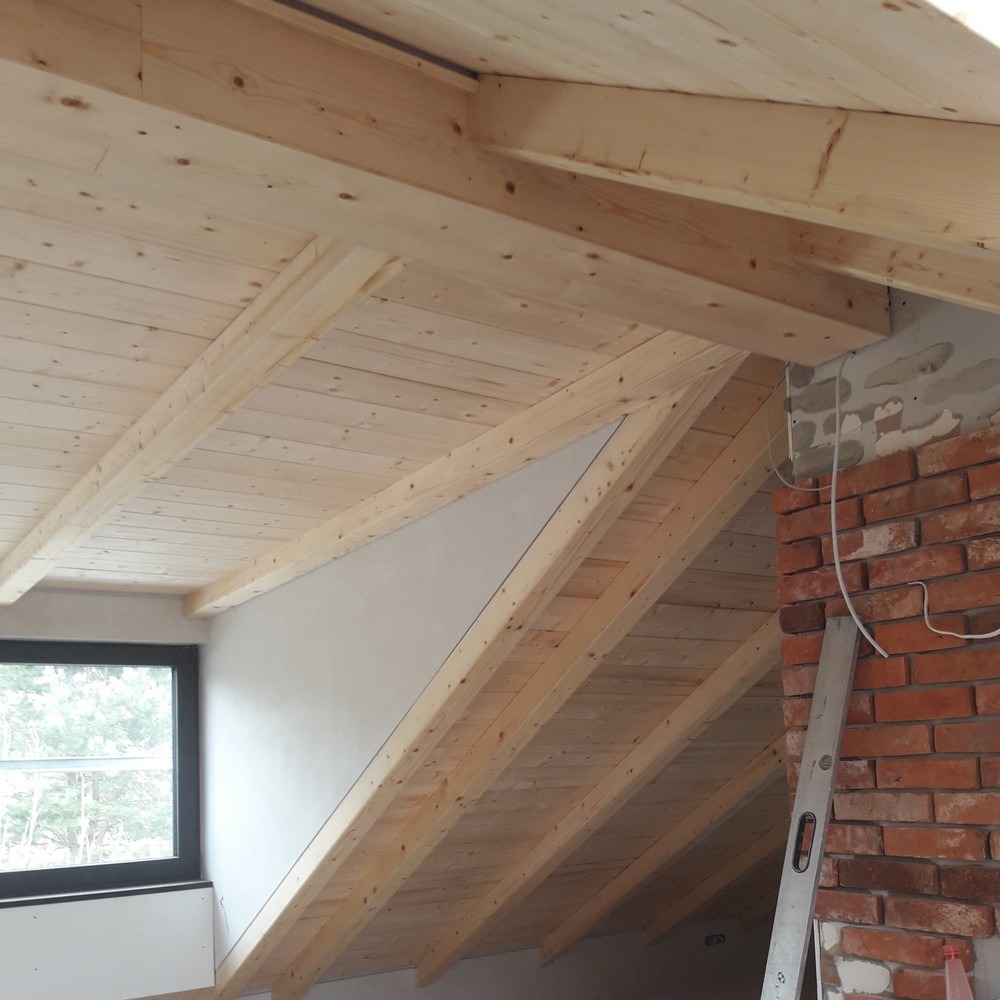 Zakres prac: naturalna boazeria drewniana na poddaszu, zamontowali deski oraz drewnianą imitację krokwi.