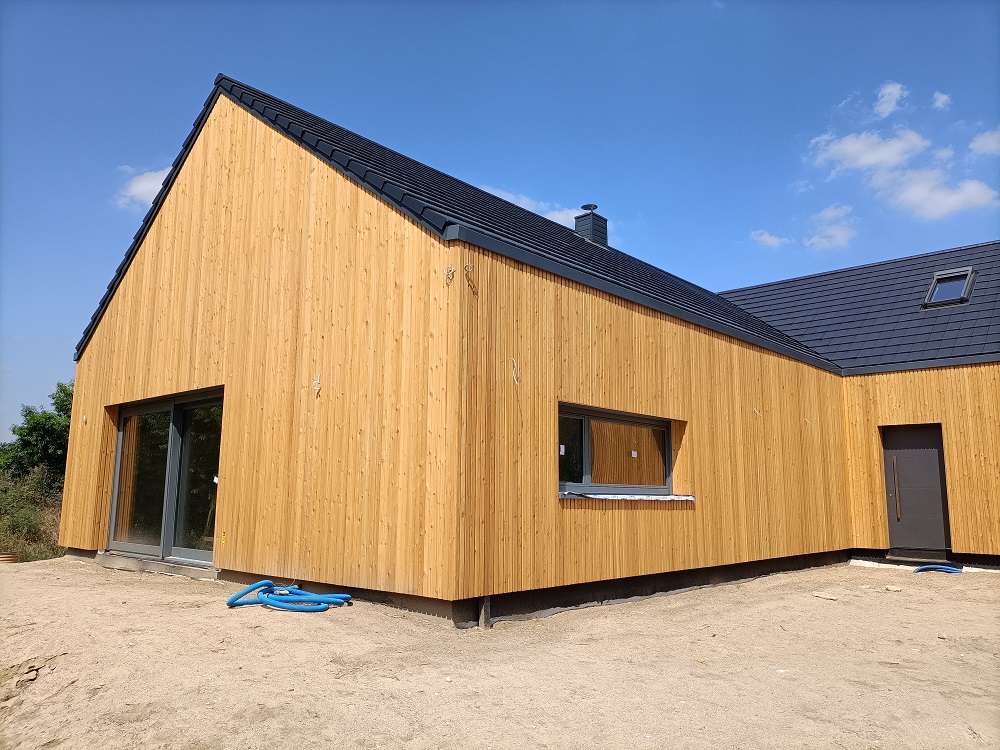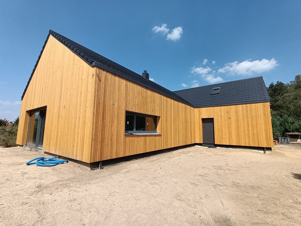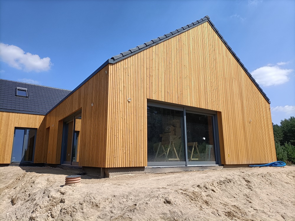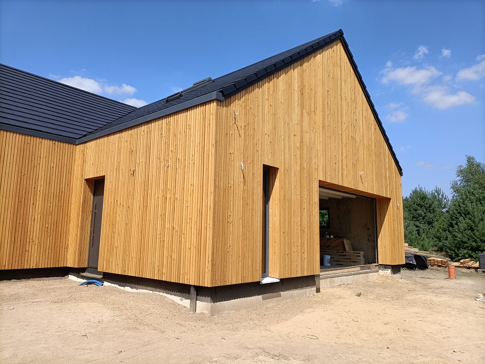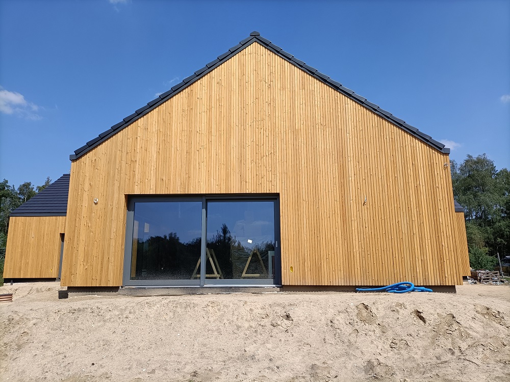 • pełna elewacja domu wykonana z desek drewnianych w naturalnej kolorystyce.