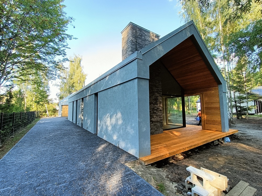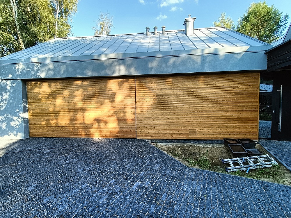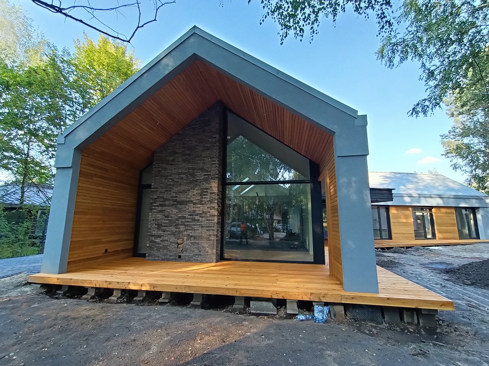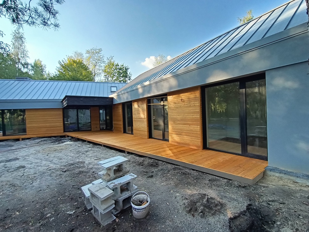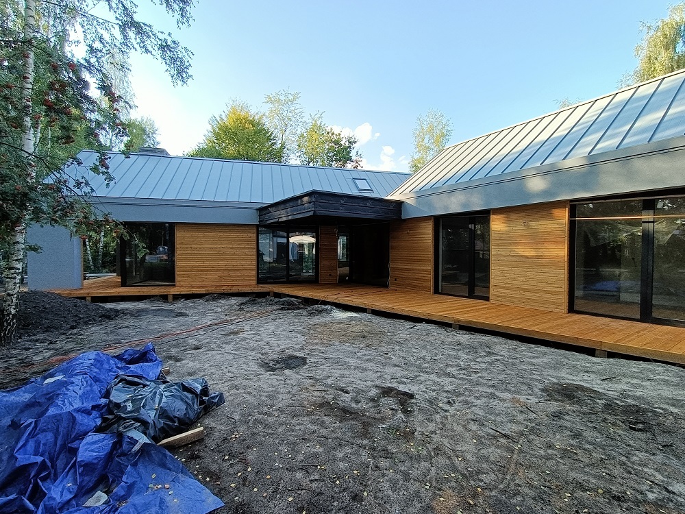 - montaż desek z modrzewia syberyjskiego na elewacji, tarasie i podbitce dachowej,
