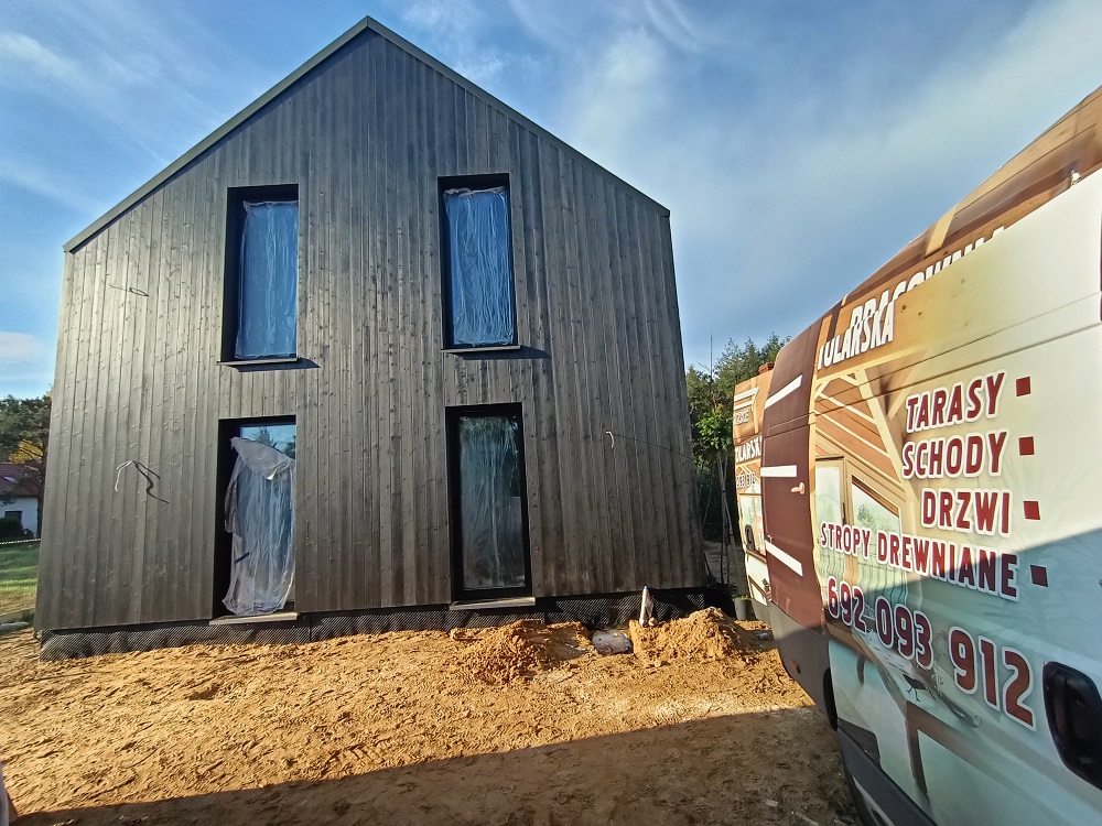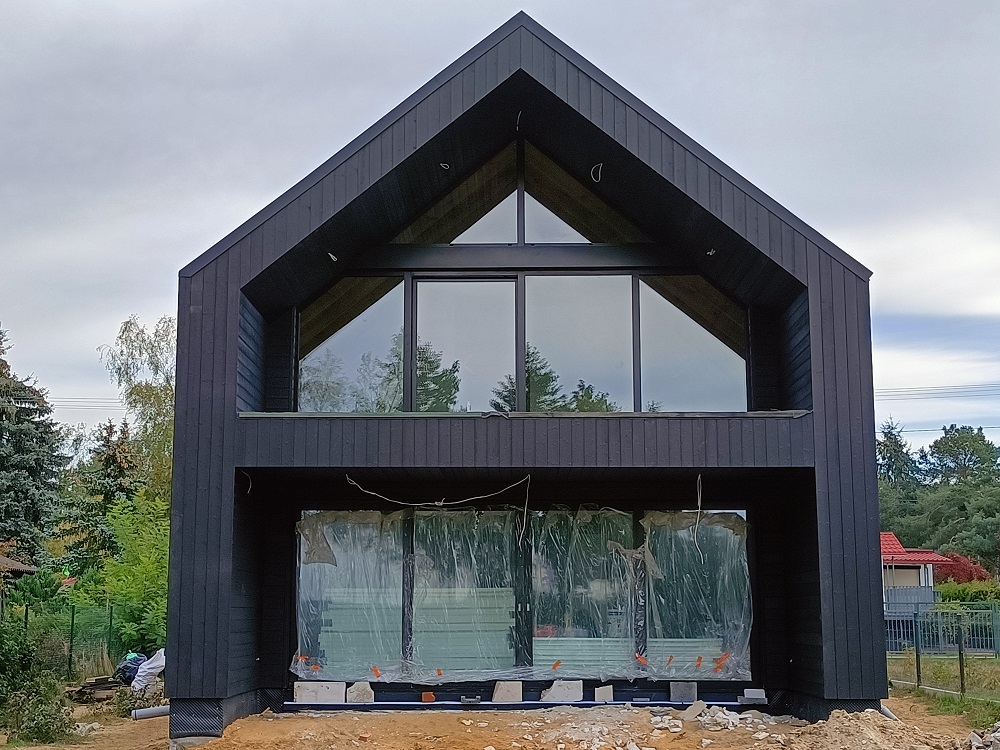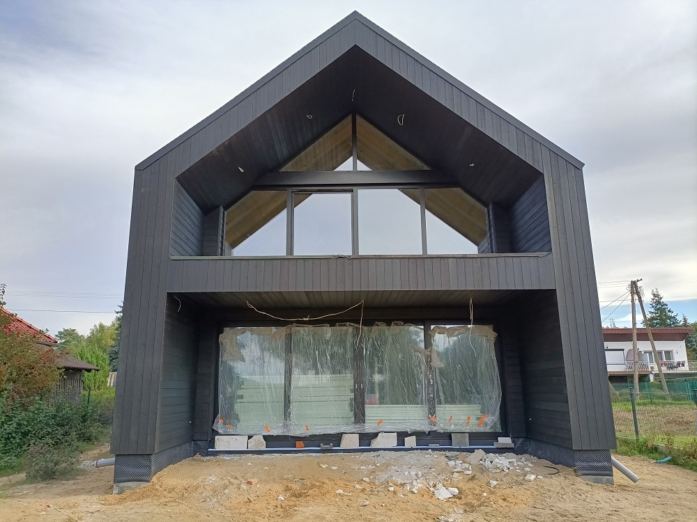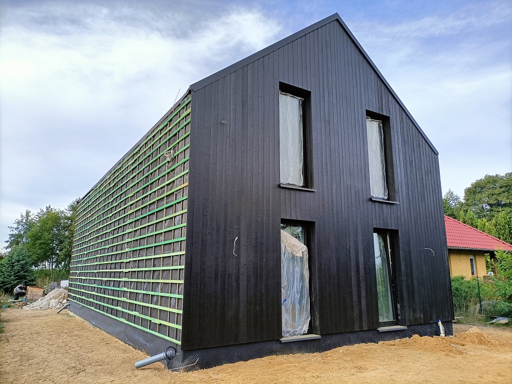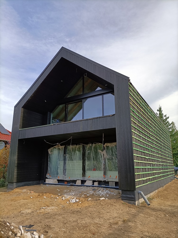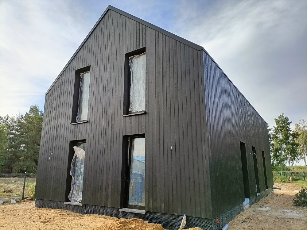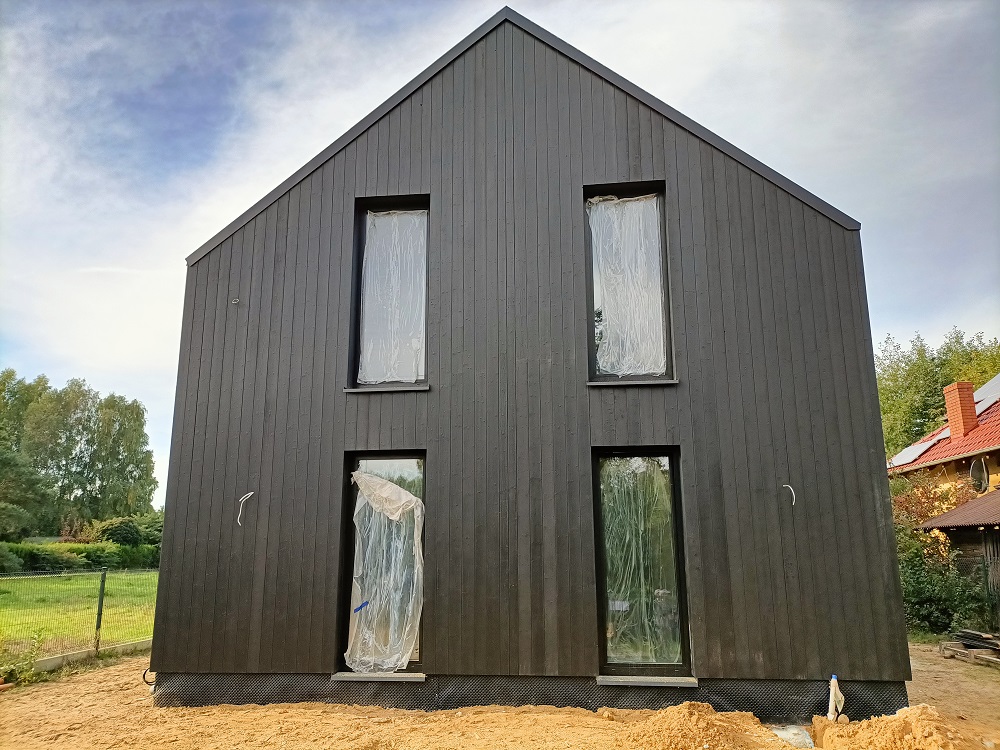 • elewacja wykonana z czarnych desek, opalanych fabrycznie w sposób wzorowany na tradycyjnej japońskiej metodzie Shou Sugi
