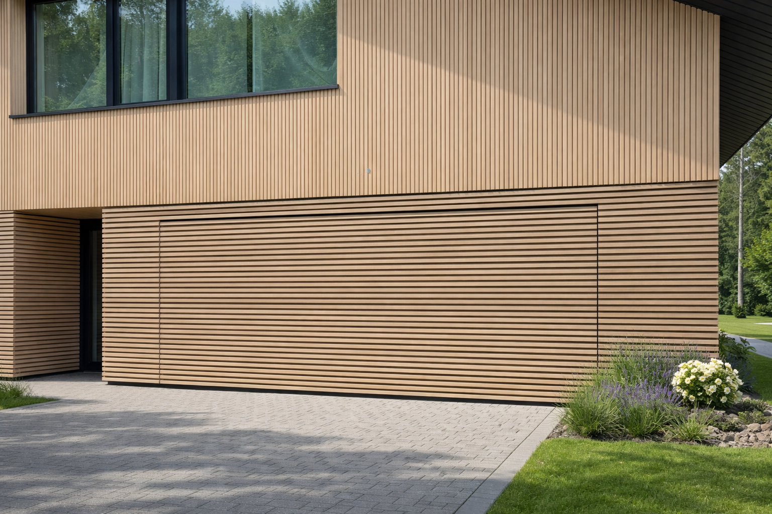Zakres prac: montaż drewnianych lameli na elewacji domu jednorodzinnego,lamele z modrzewia kanadyjskiego,elewacja drewniana pionowa i pozioma,zamocowaliśmy lamele również na bramie garażowej fasadowej.