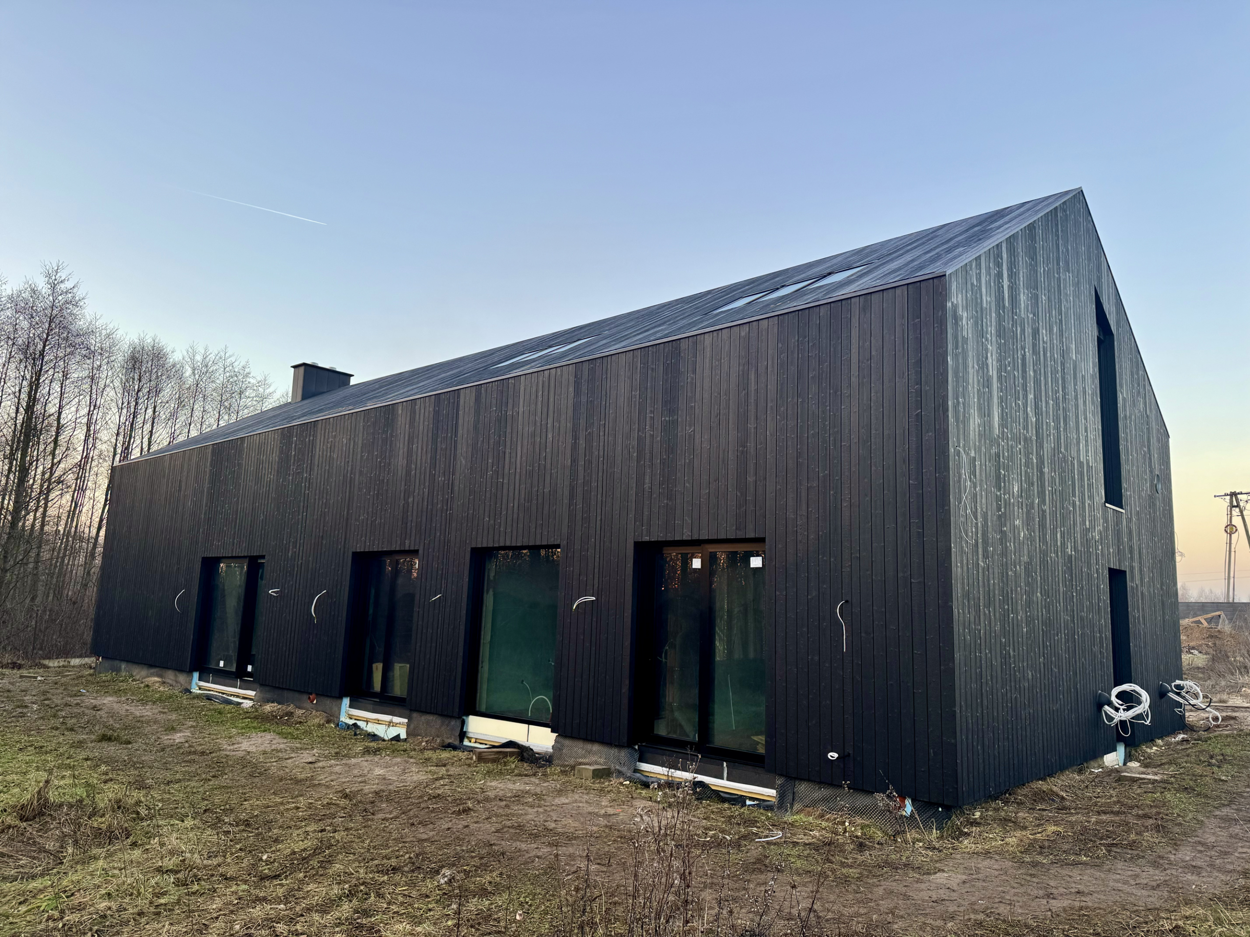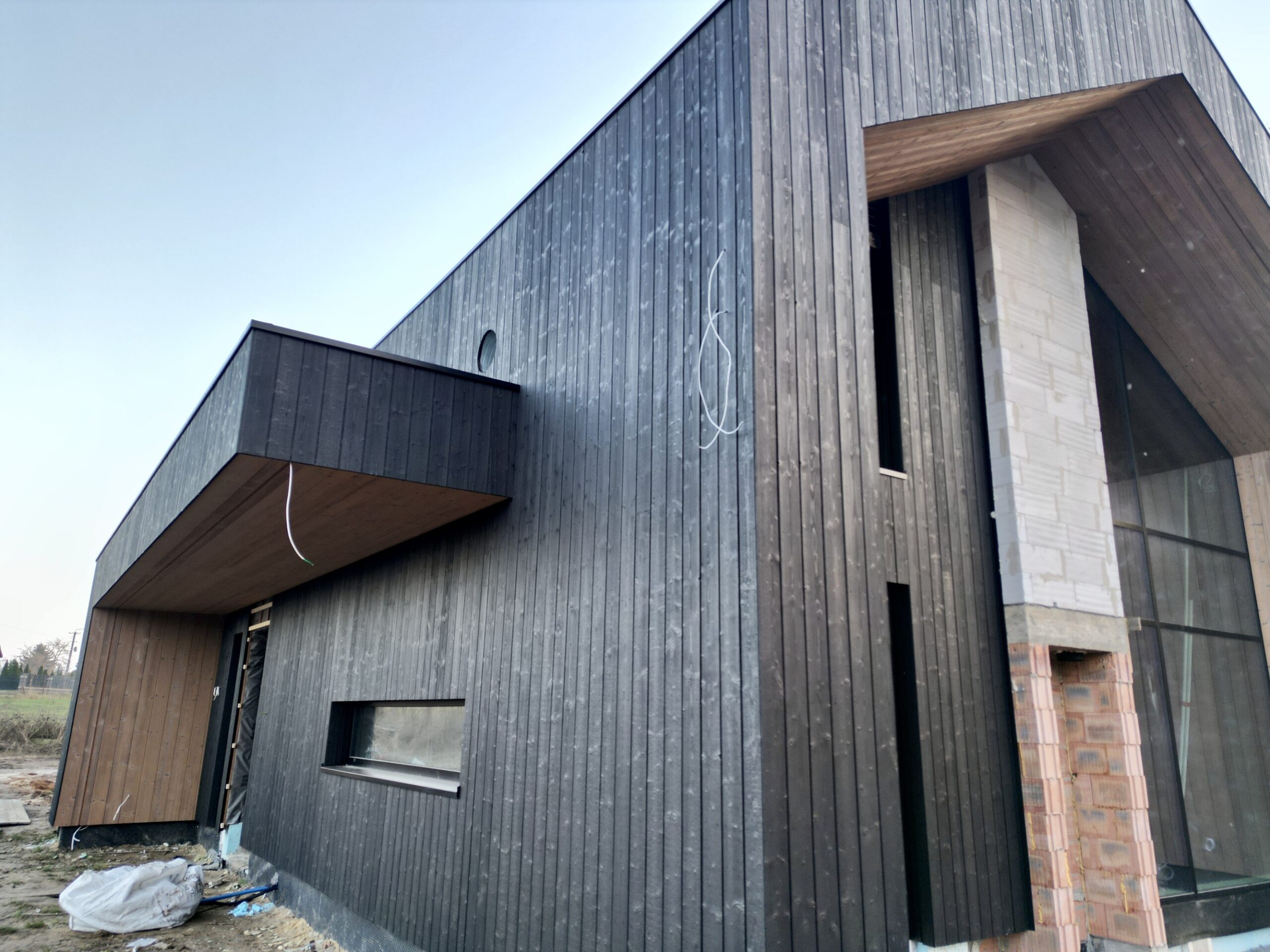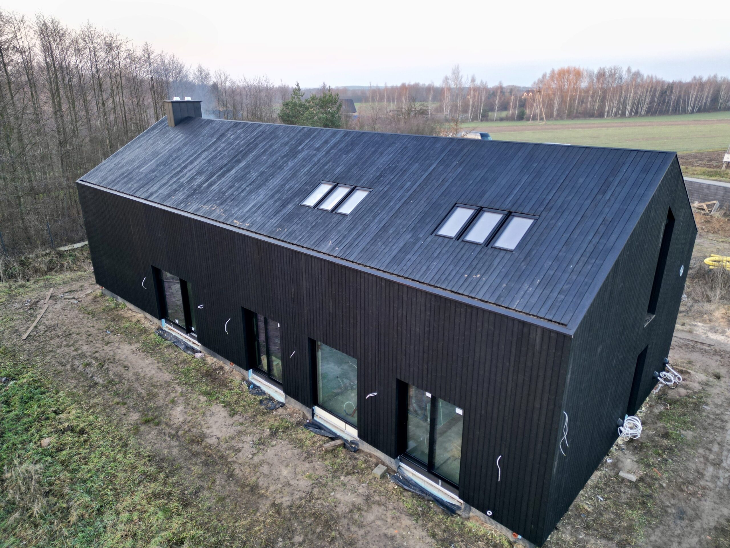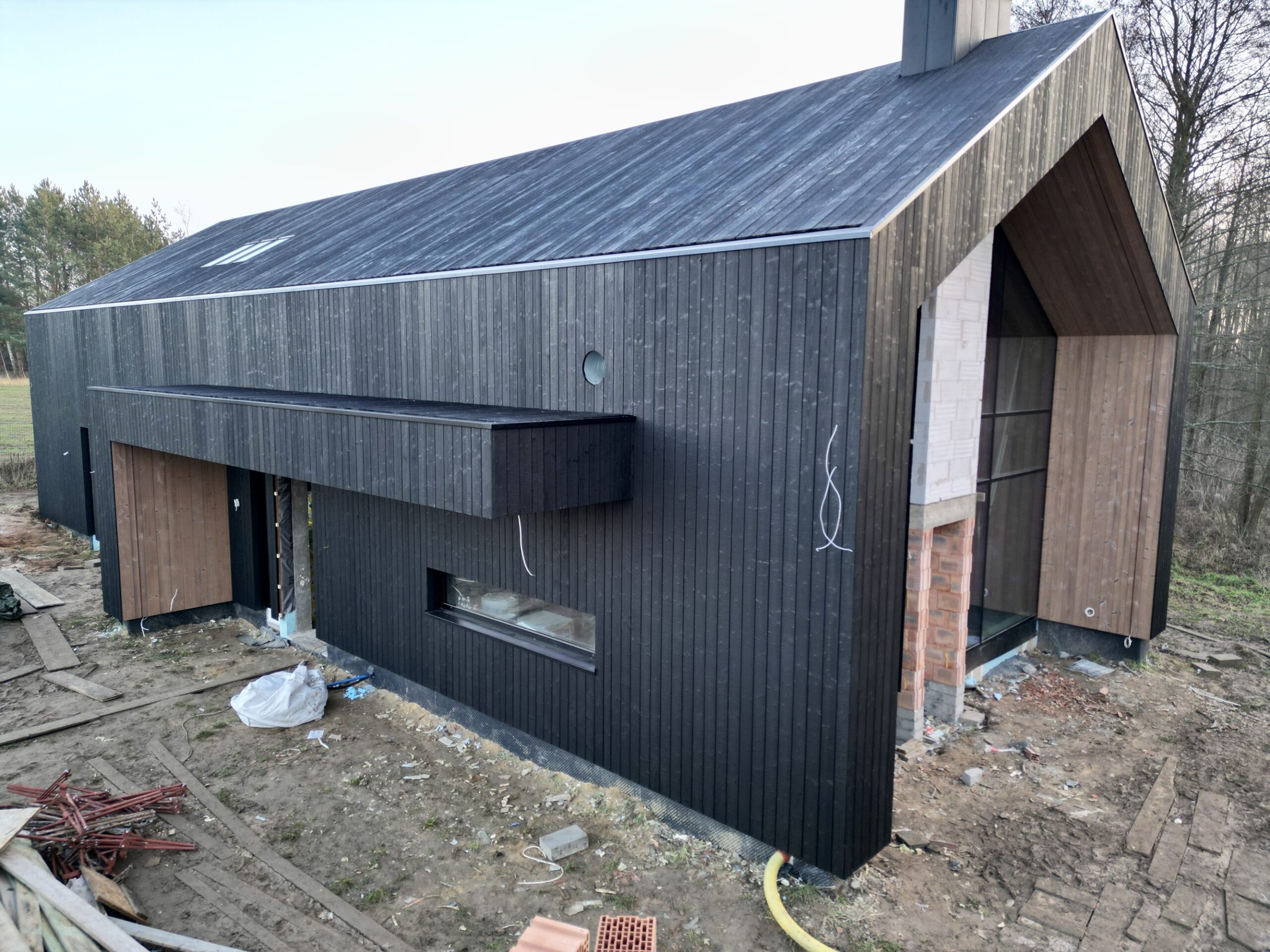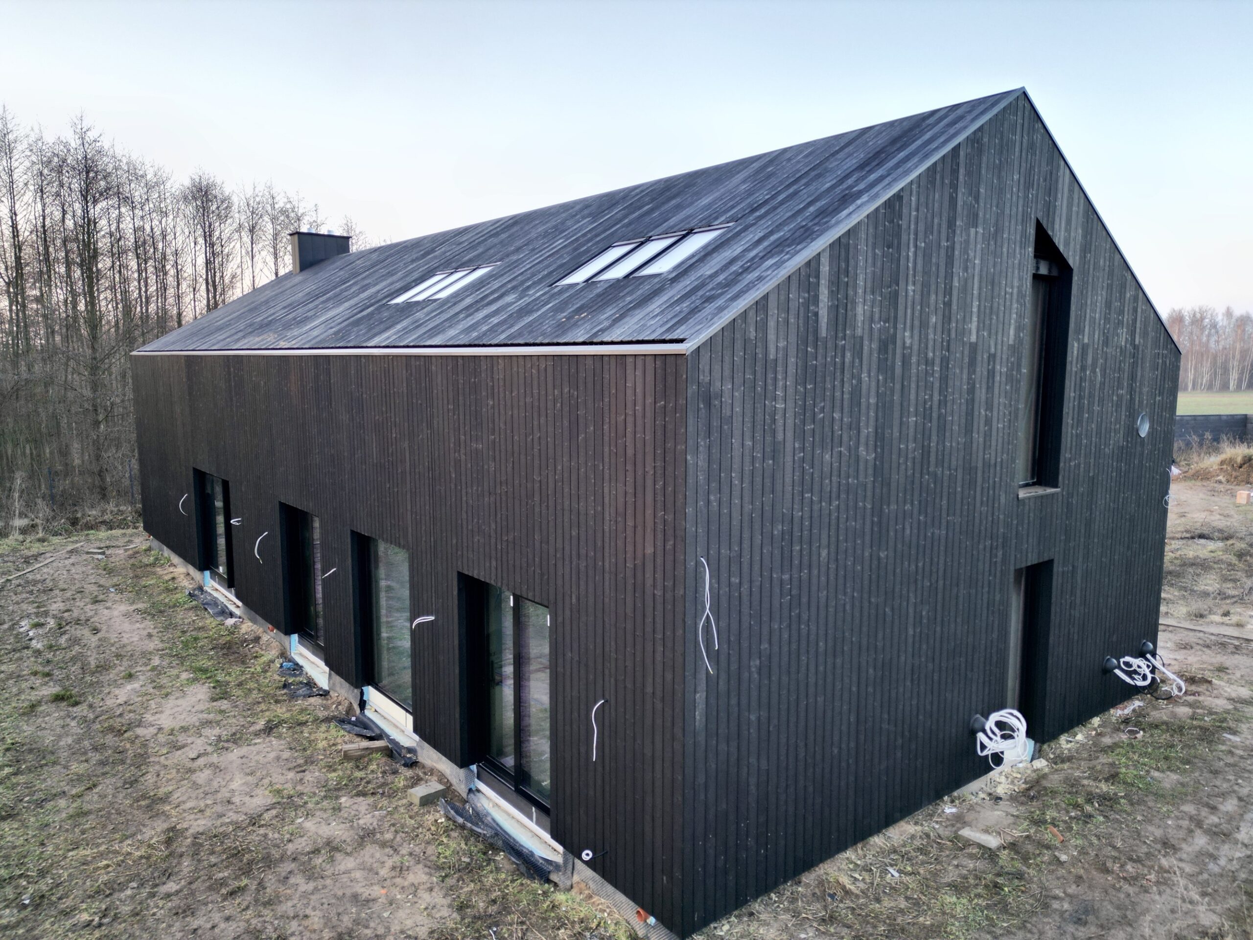 Zakres prac: dom typu stodoła z elewacją z desek opalanych i elementami z thermo świerku,deski opalane Shou Sugi Ban zamontowaliśmy też na dachu domu jako końcowe pokrycie.