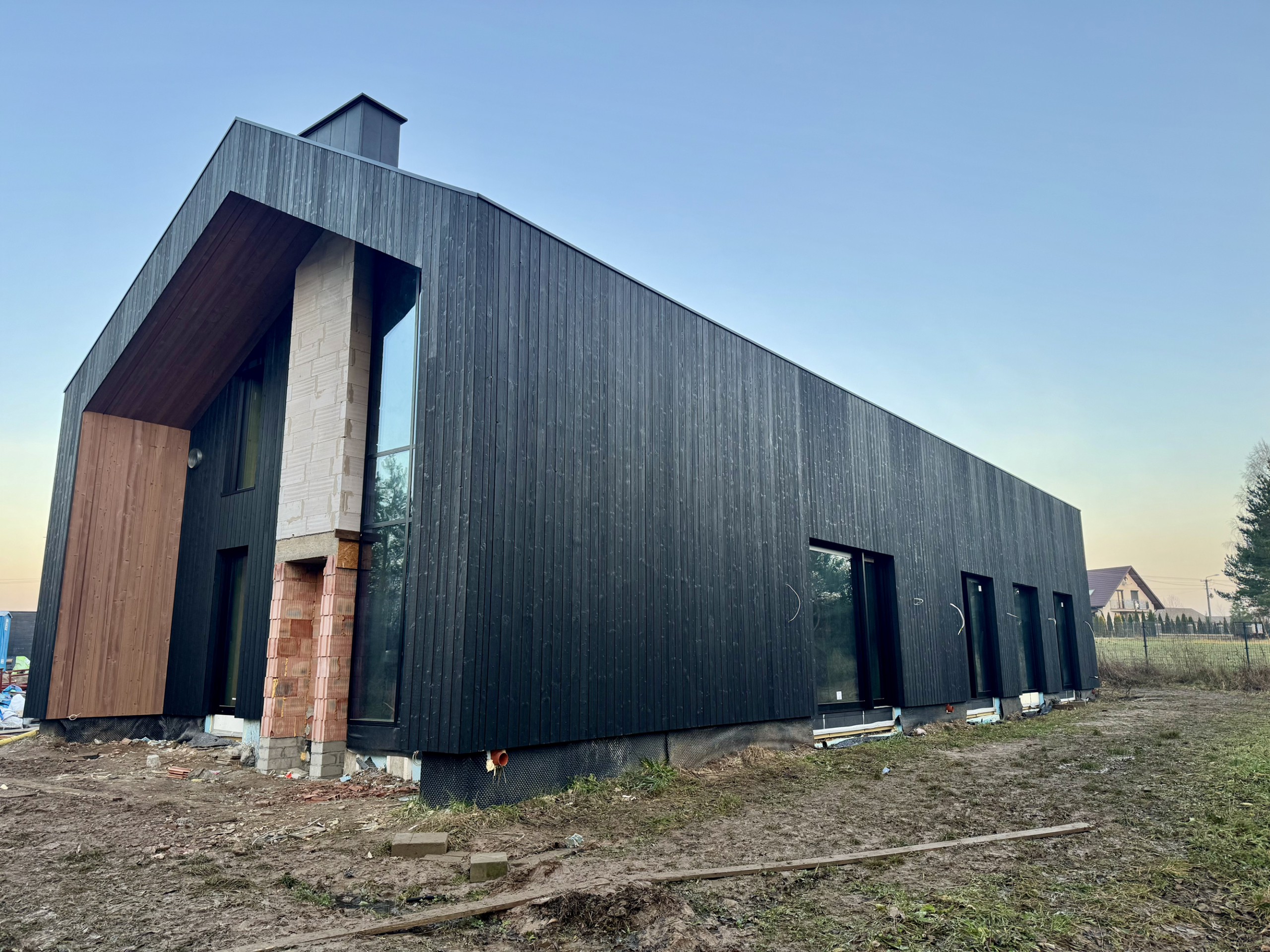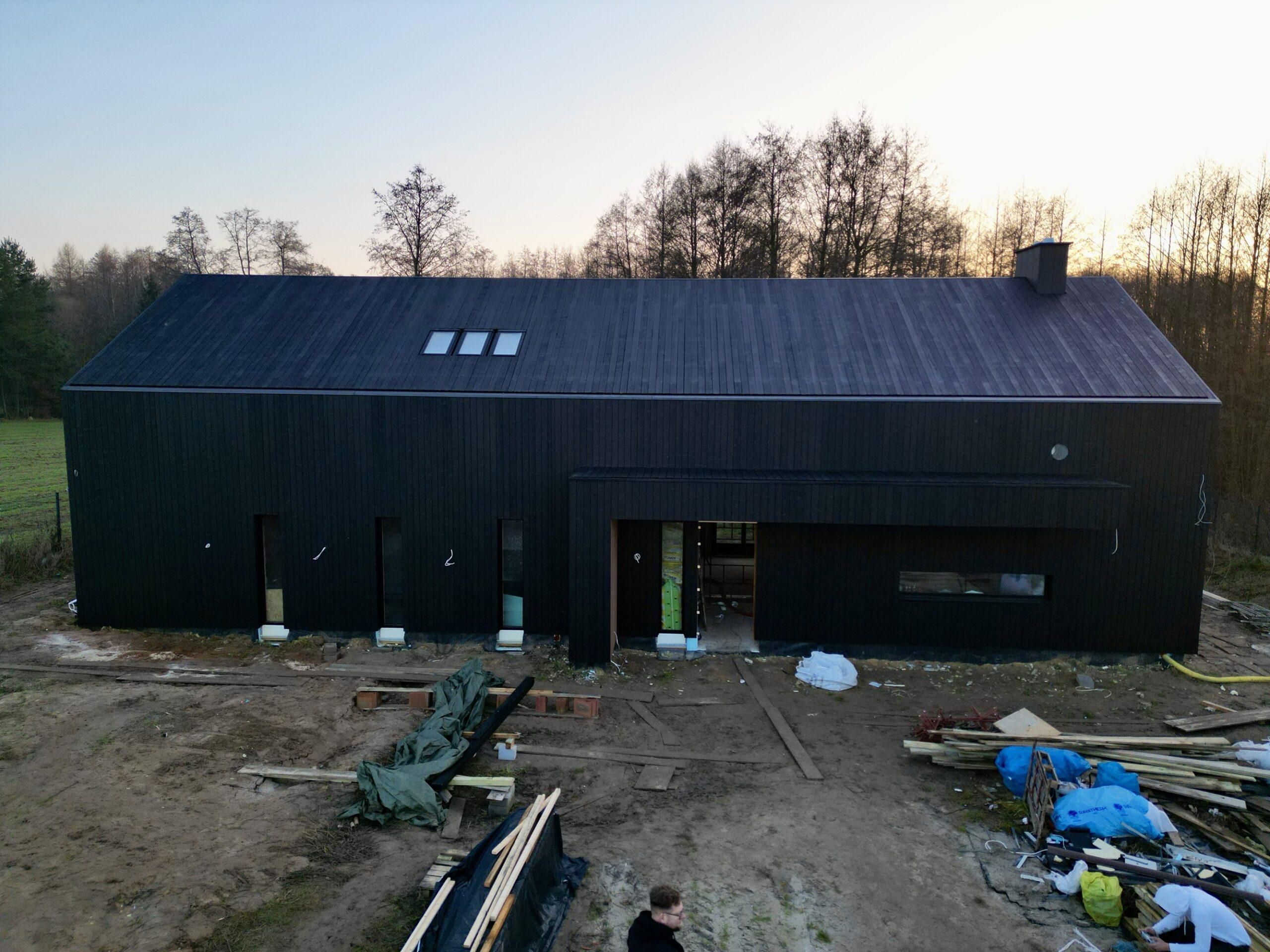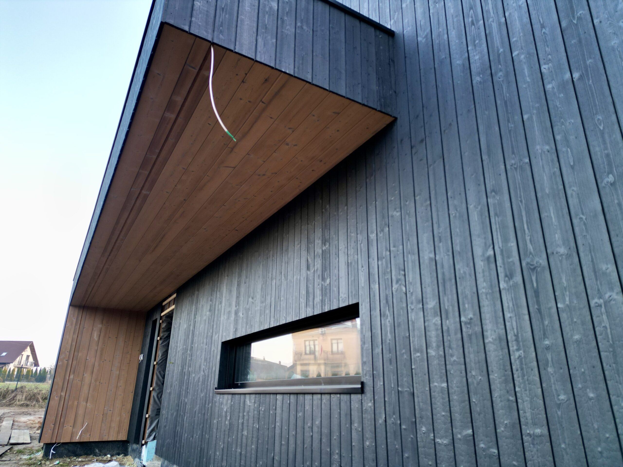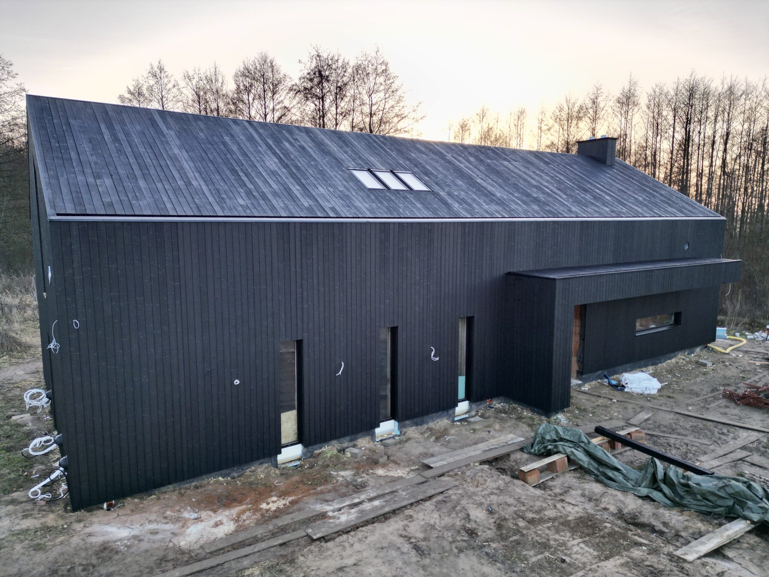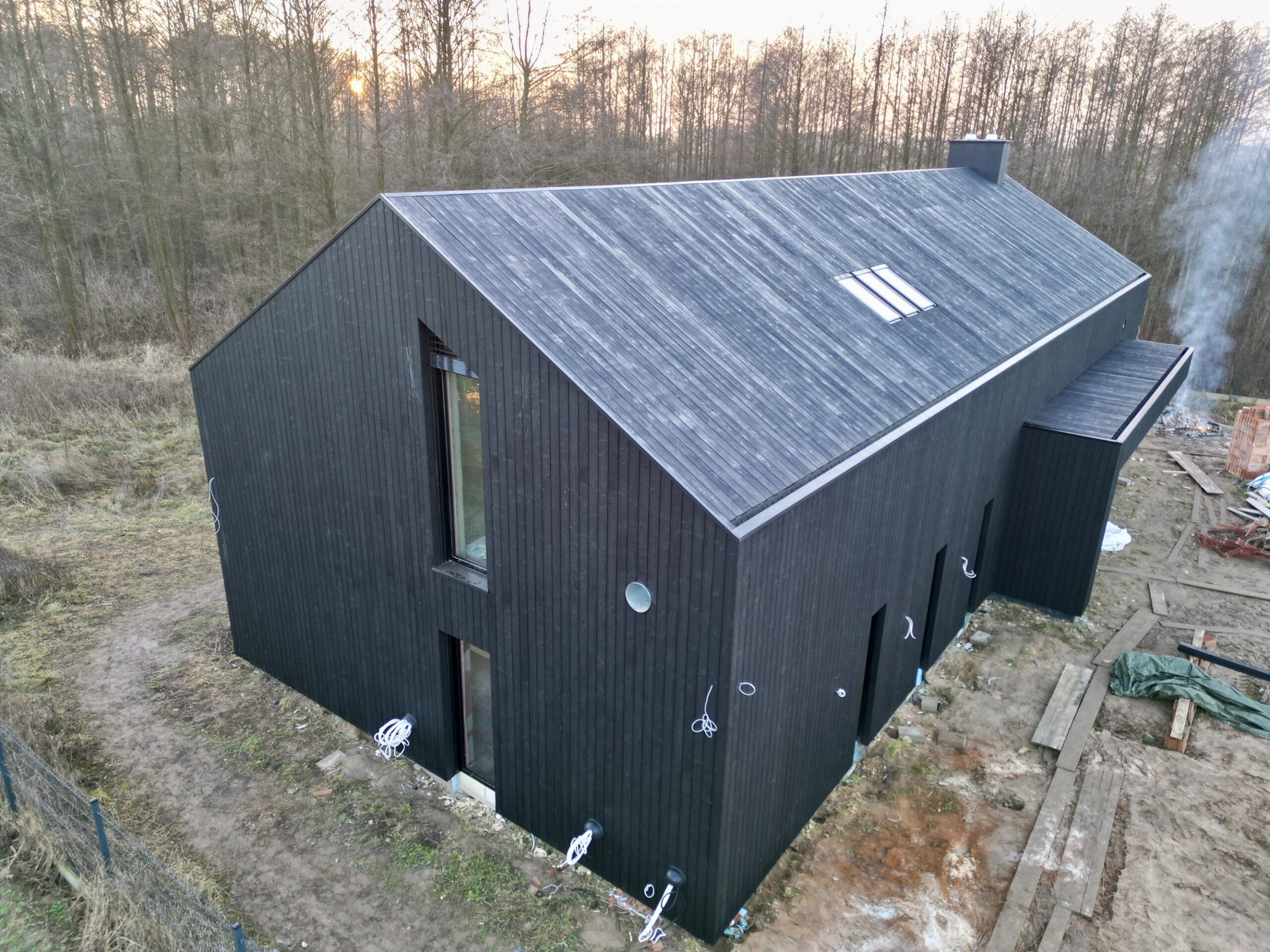 Zakres prac: dom typu stodoła z elewacją z desek opalanych i elementami z thermo świerku,deski opalane Shou Sugi Ban zamontowaliśmy też na dachu domu jako końcowe pokrycie.