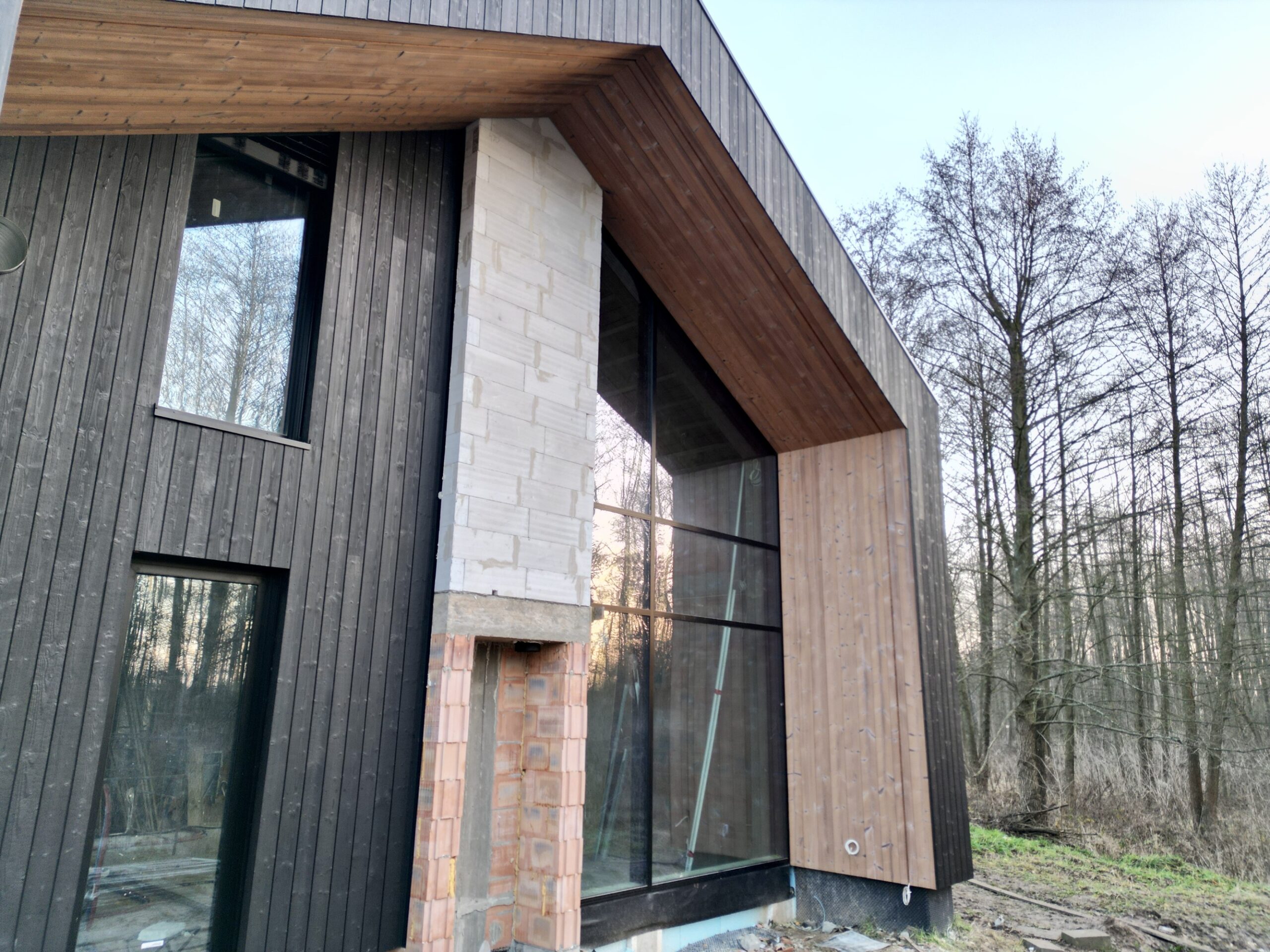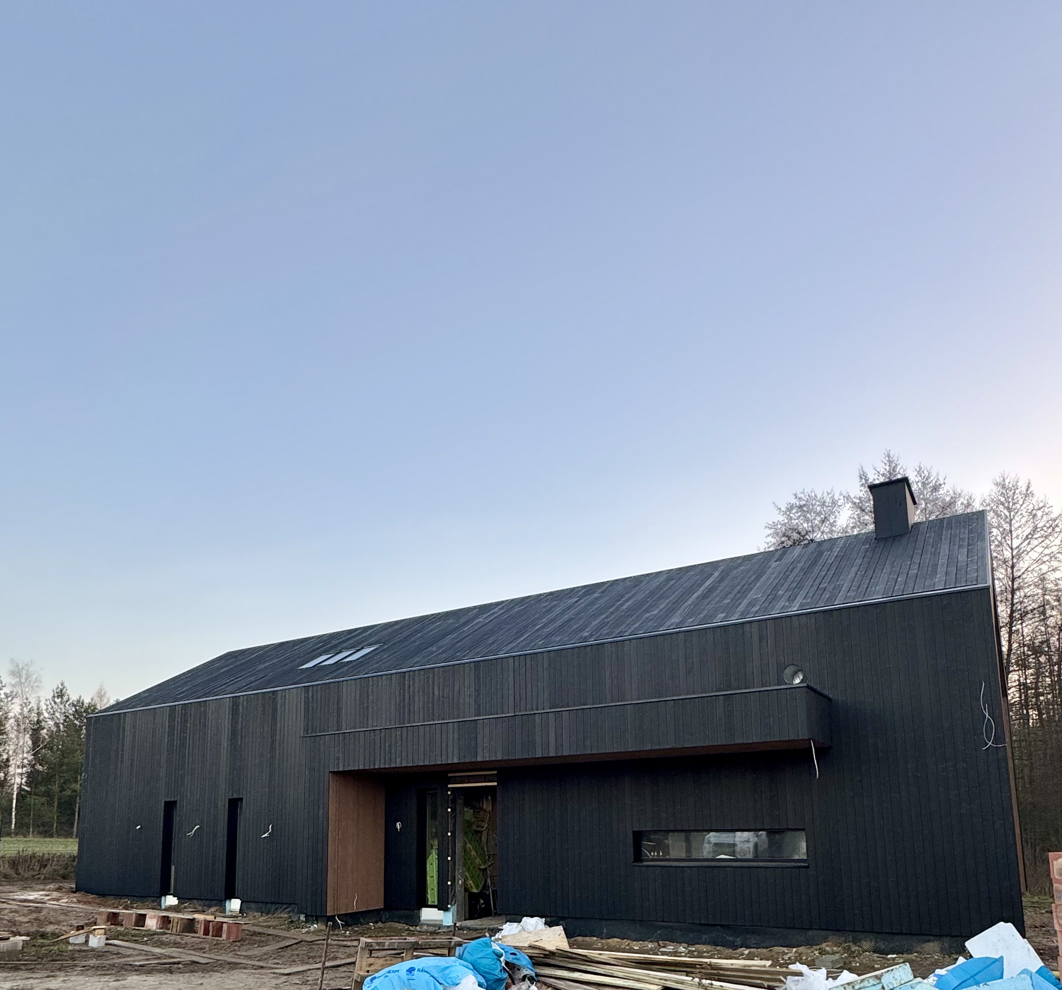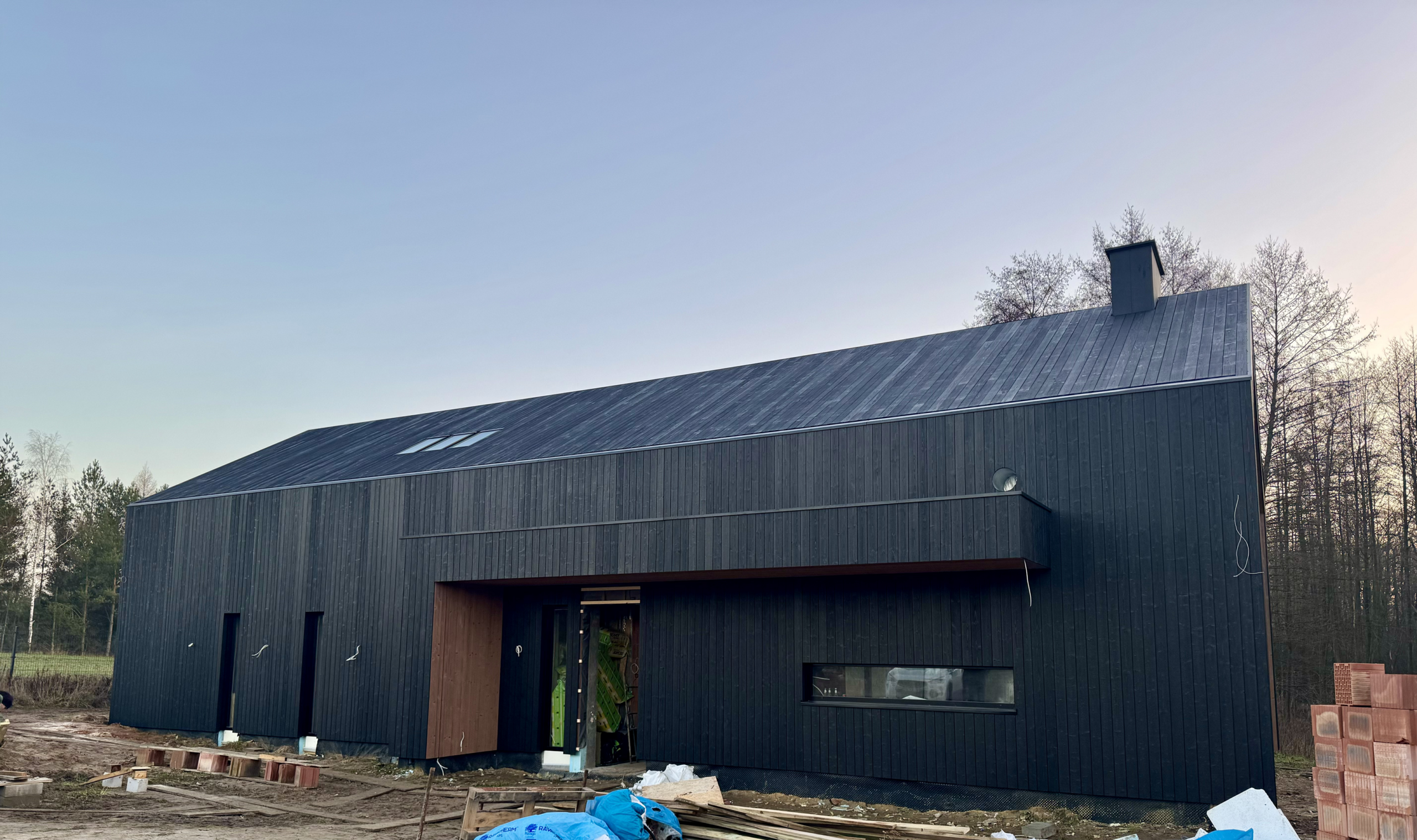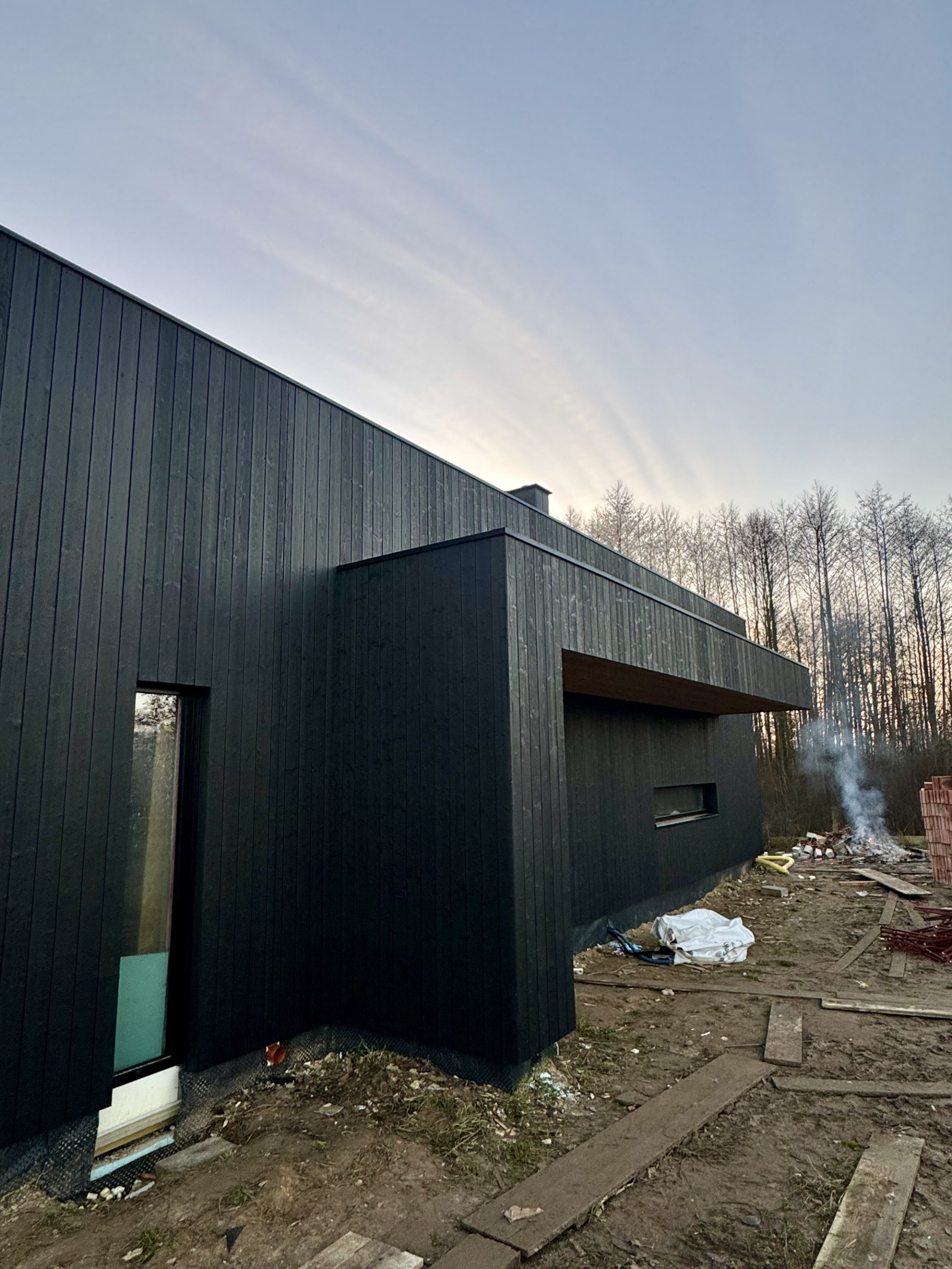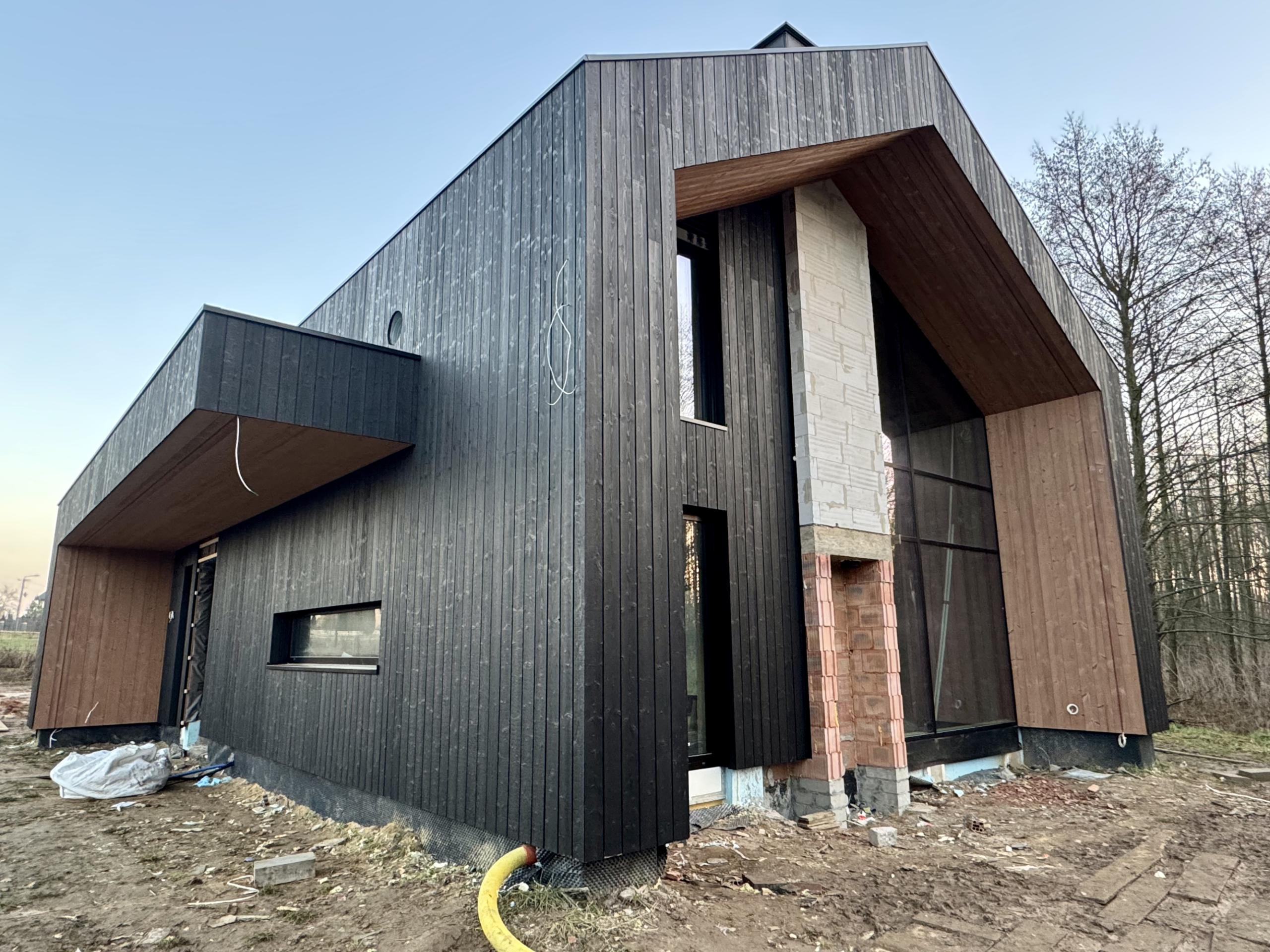Zakres prac: dom typu stodoła z elewacją z desek opalanych i elementami z thermo świerku,deski opalane Shou Sugi Ban zamontowaliśmy też na dachu domu jako końcowe pokrycie.