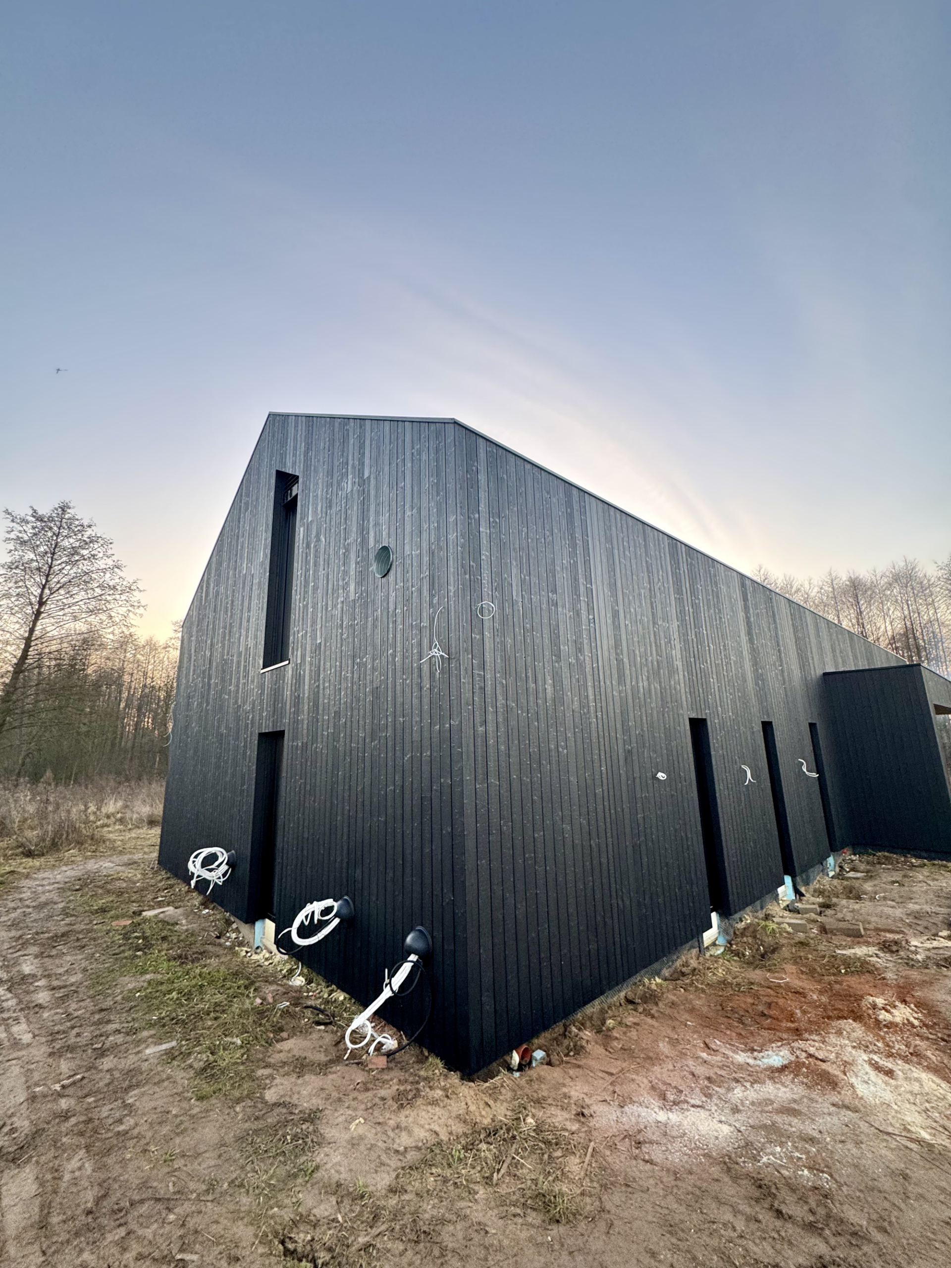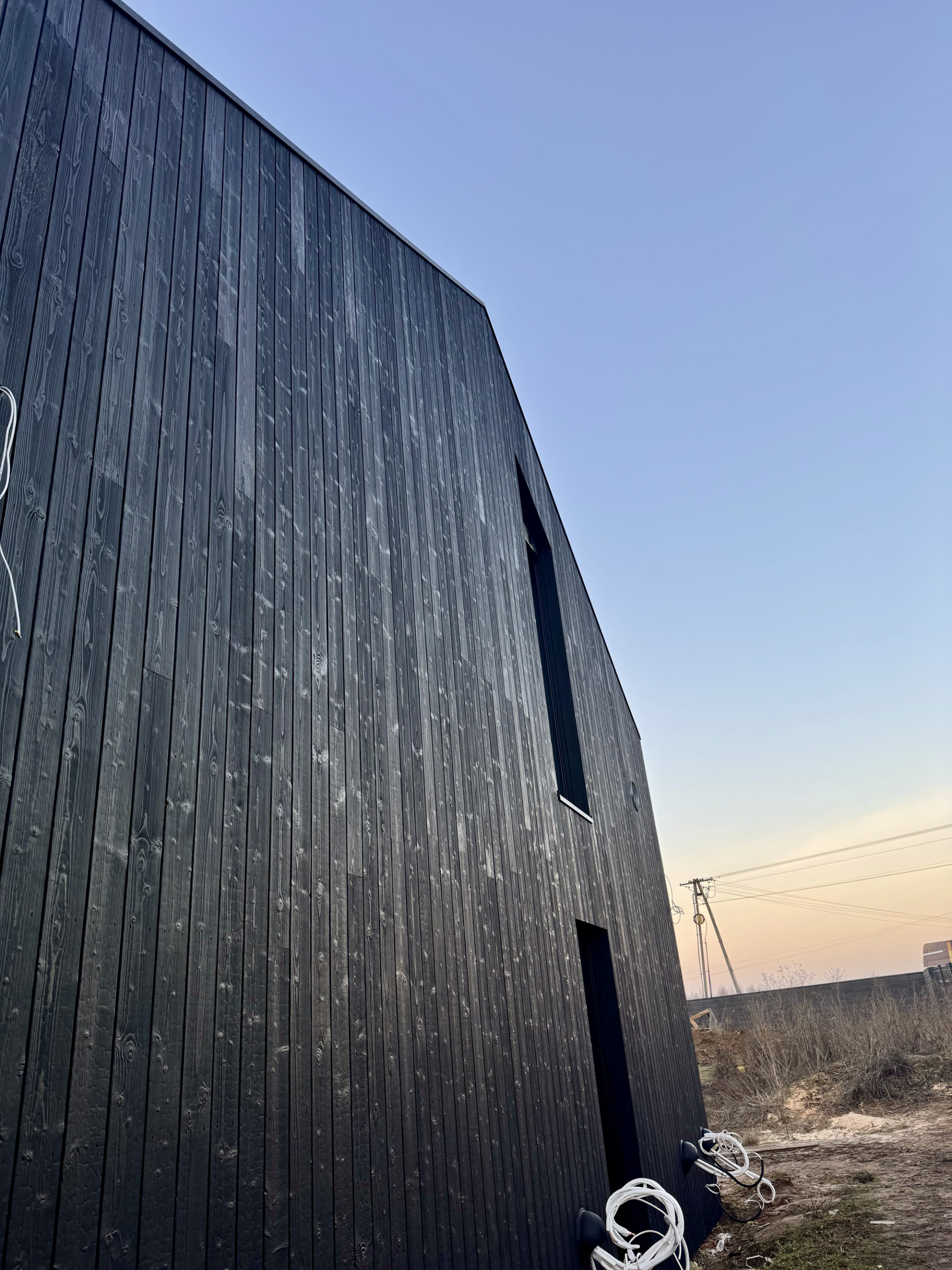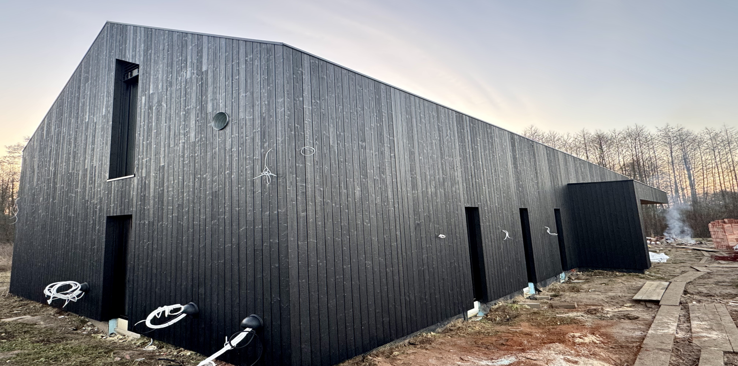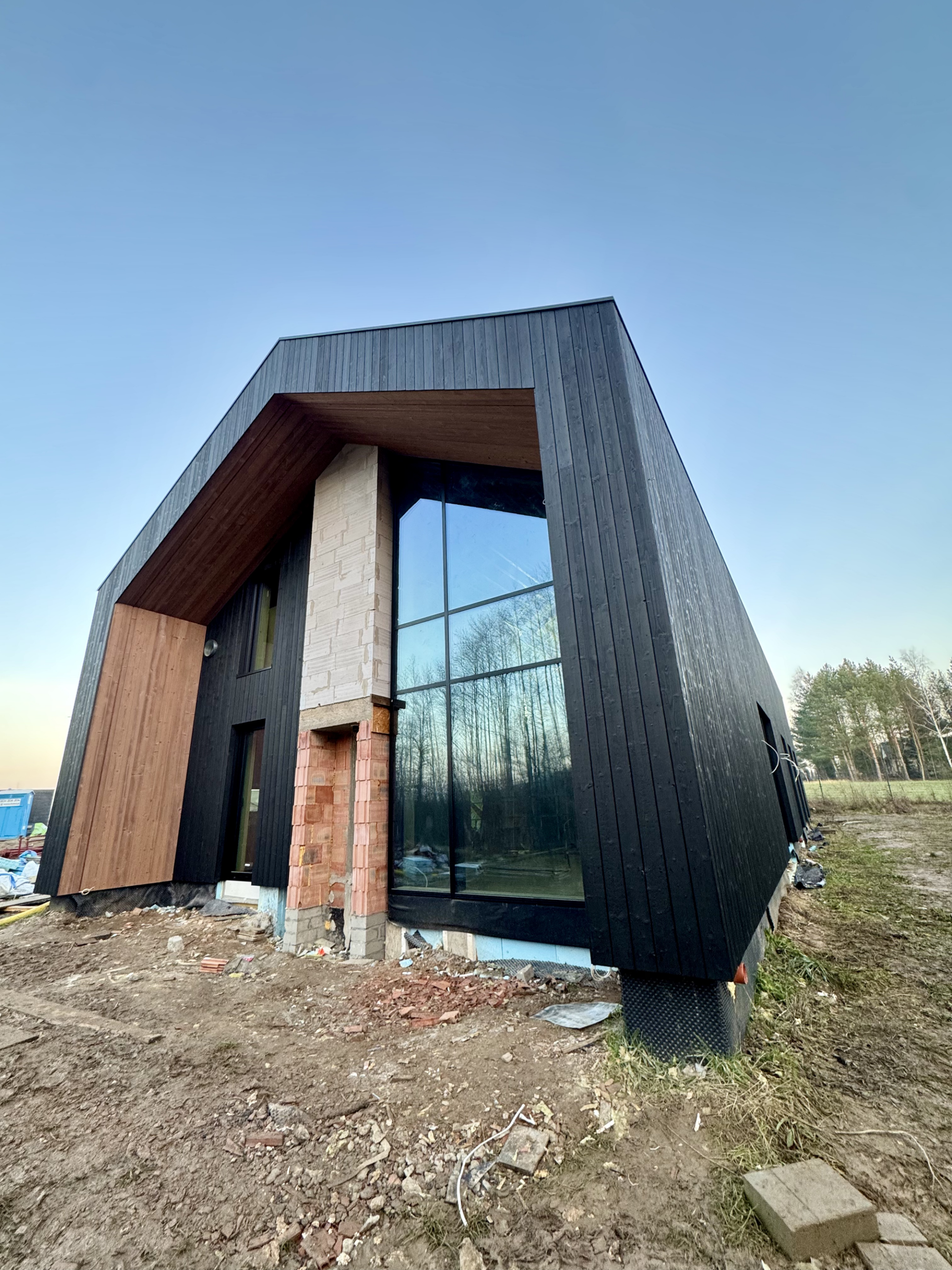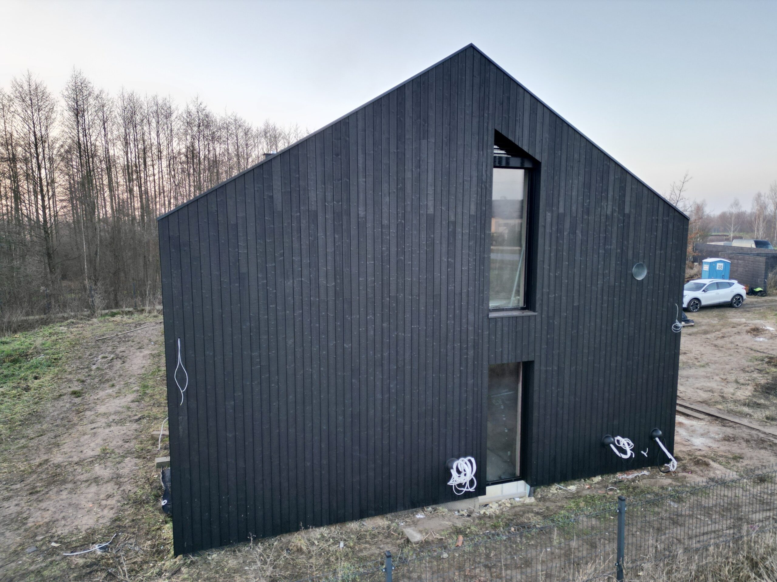 Zakres prac: dom typu stodoła z elewacją z desek opalanych i elementami z thermo świerku,deski opalane Shou Sugi Ban zamontowaliśmy też na dachu domu jako końcowe pokrycie.