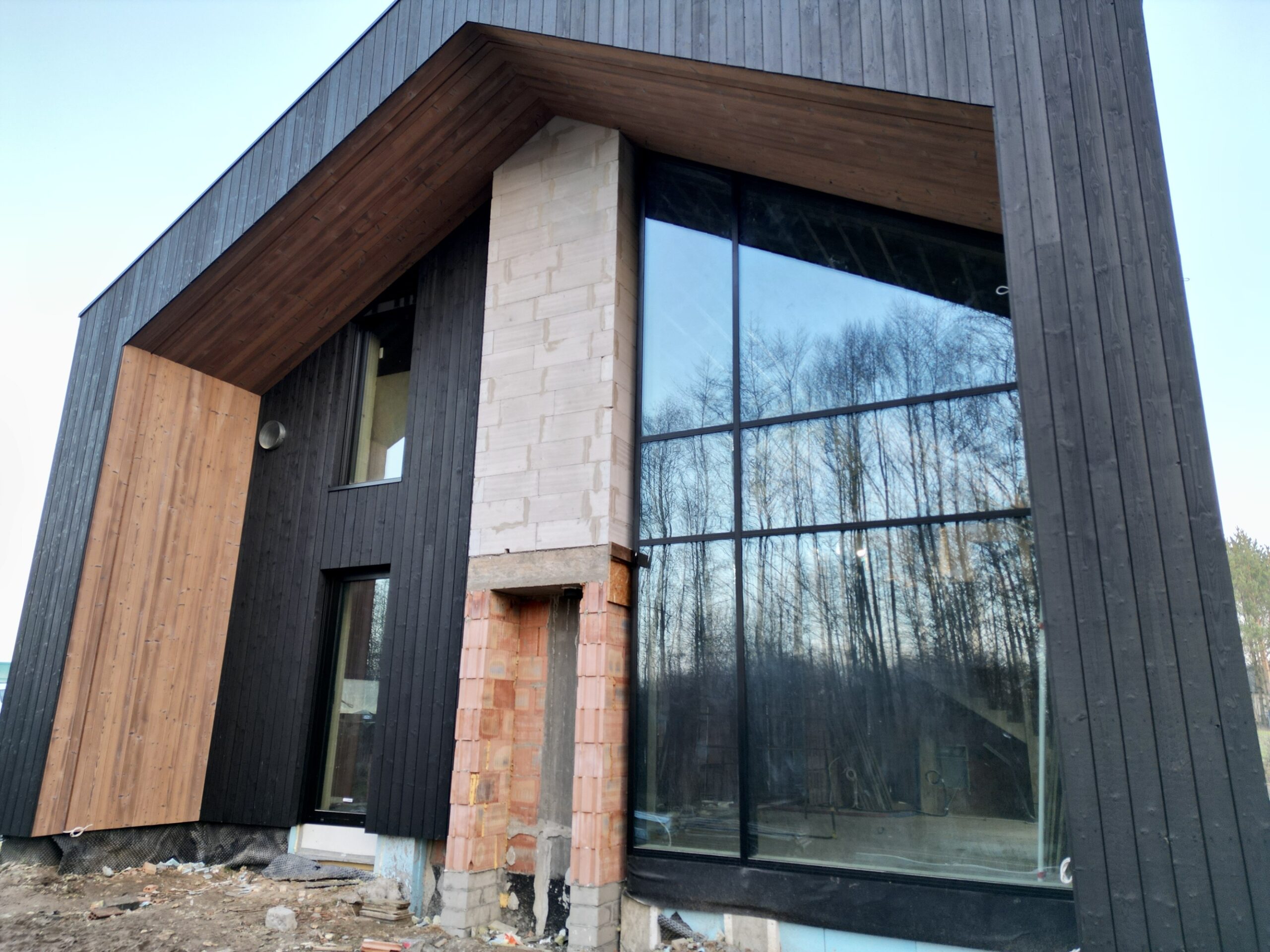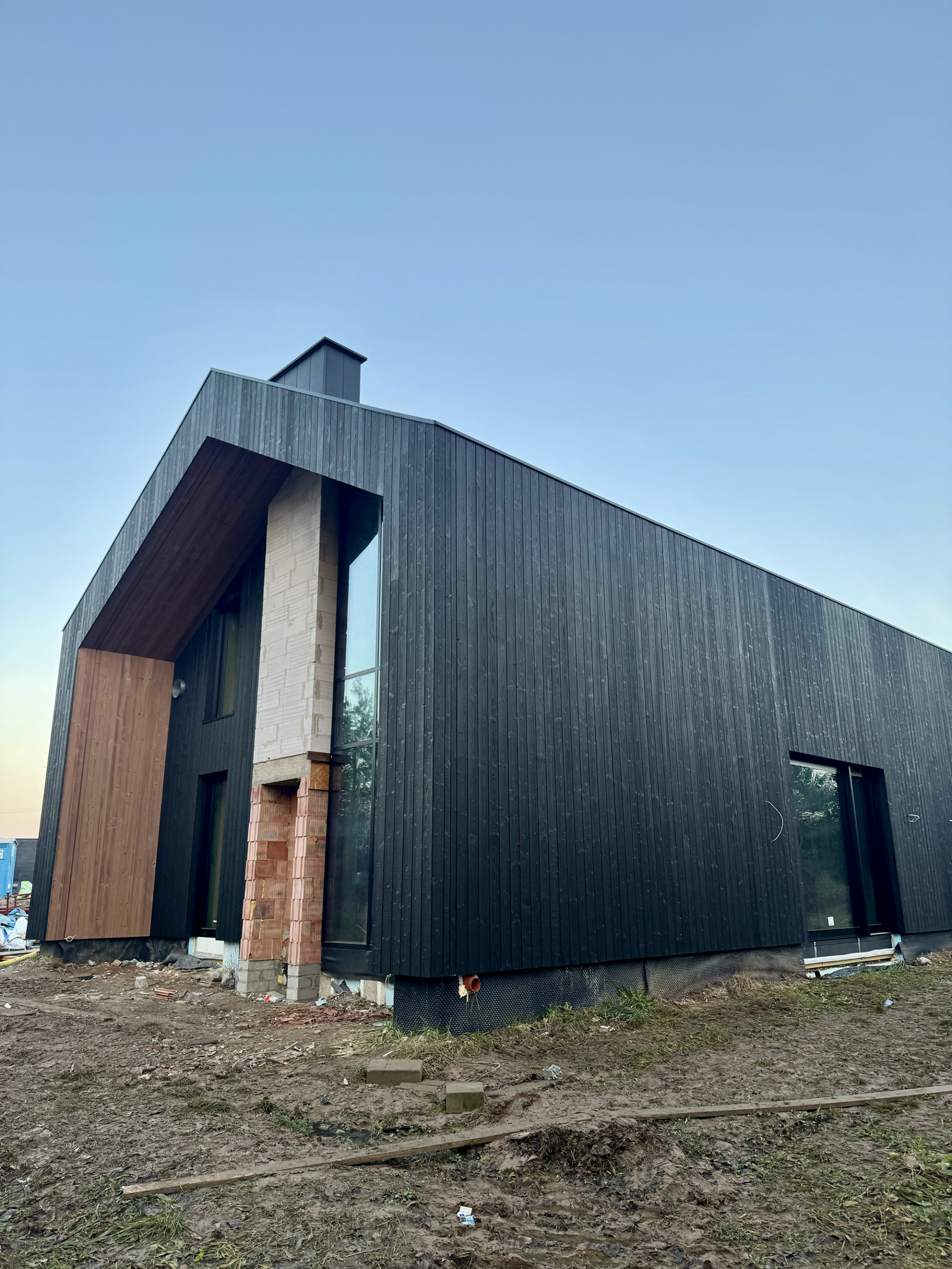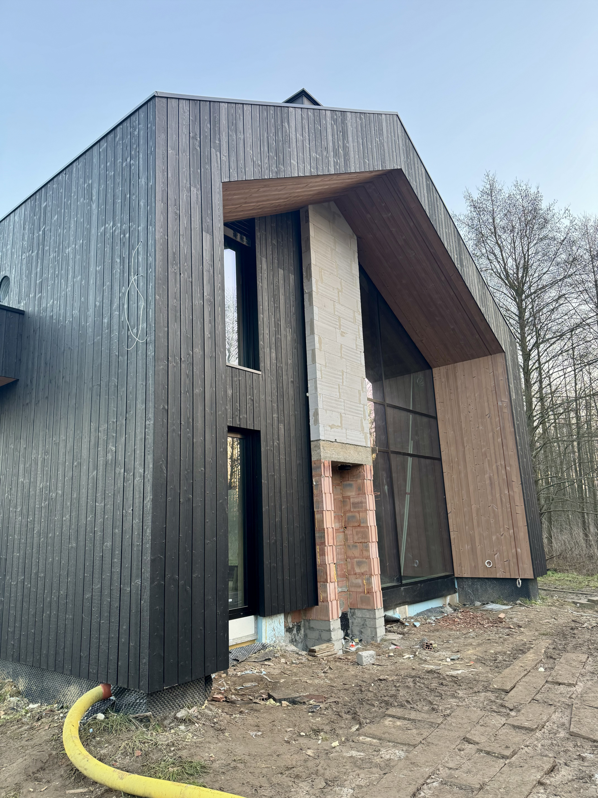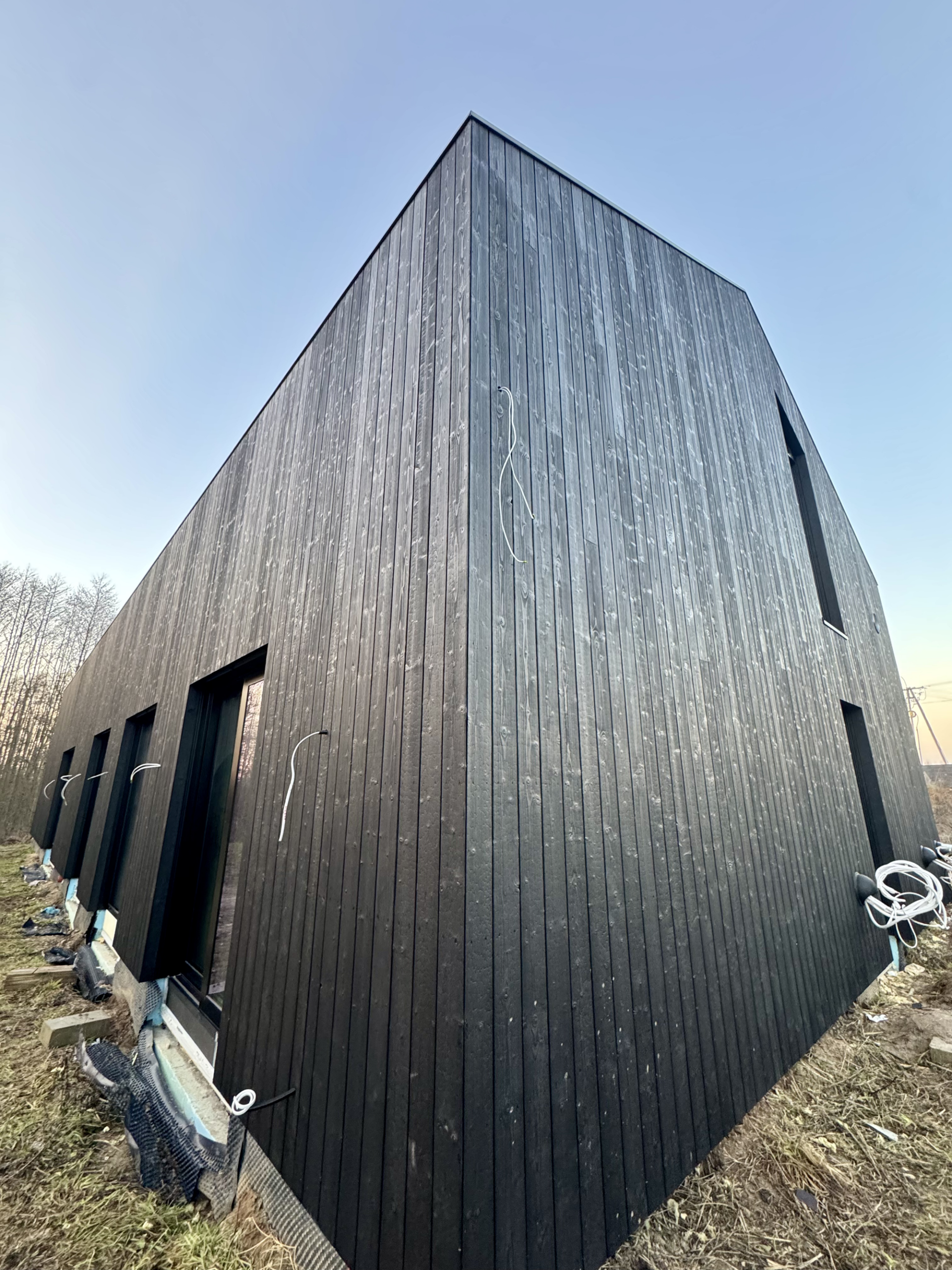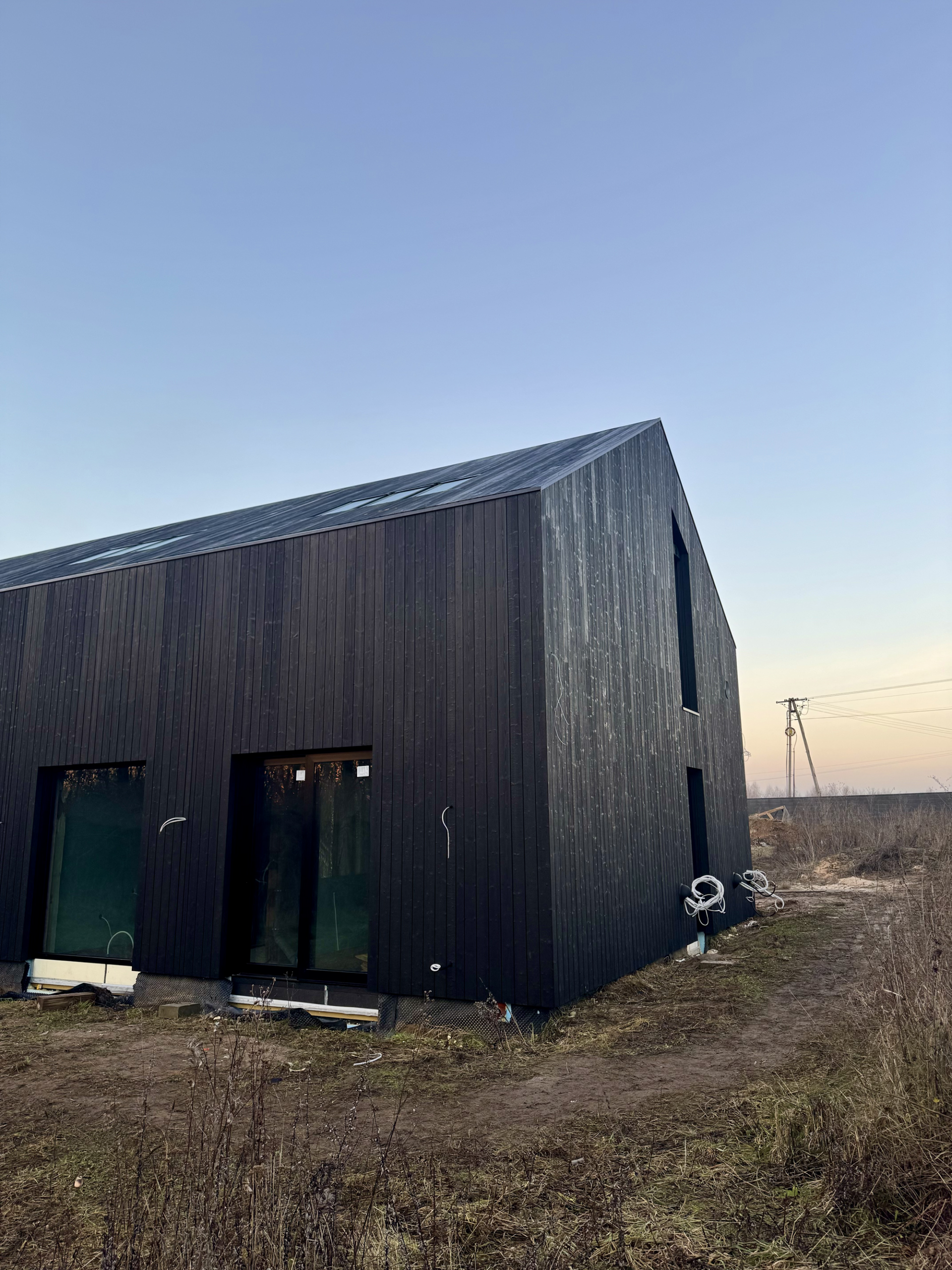 Zakres prac: dom typu stodoła z elewacją z desek opalanych i elementami z thermo świerku,deski opalane Shou Sugi Ban zamontowaliśmy też na dachu domu jako końcowe pokrycie.