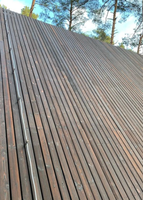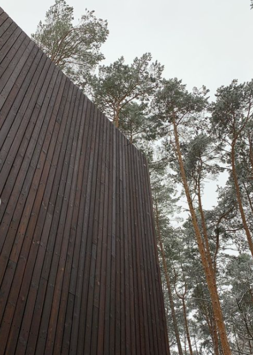Zakres prac: nowoczesny dom typu stodoła w okolicach Warszawy,drewniana elewacja wykonana z wąskich desek.