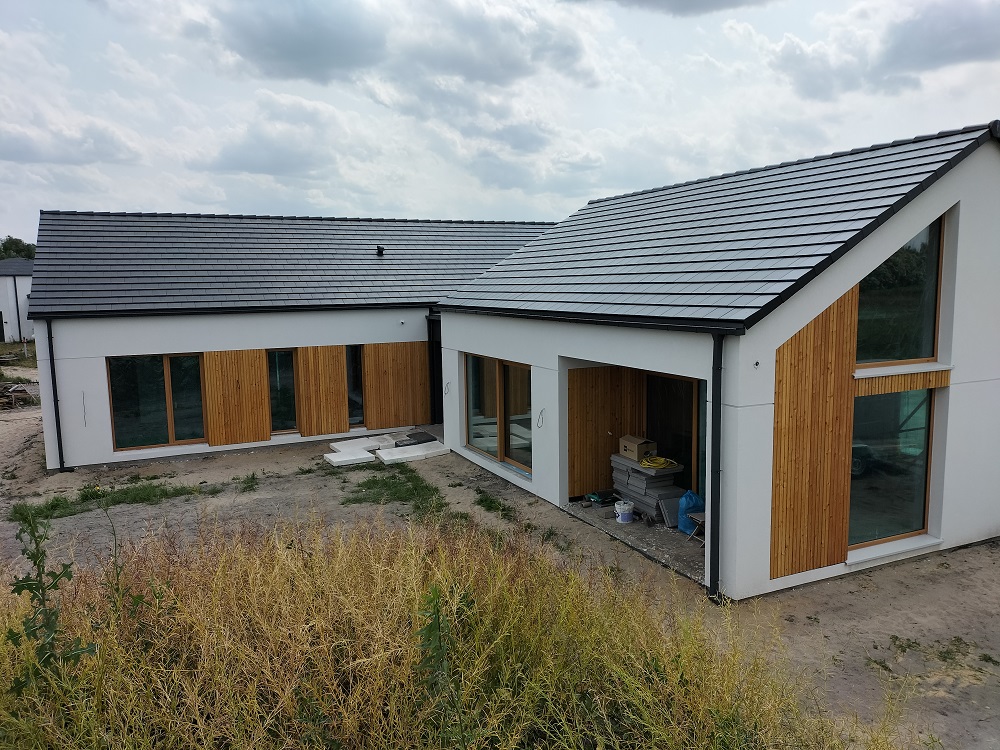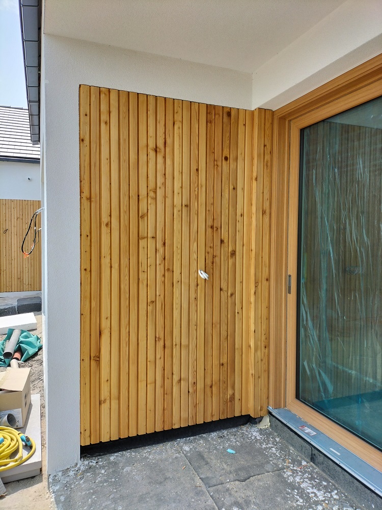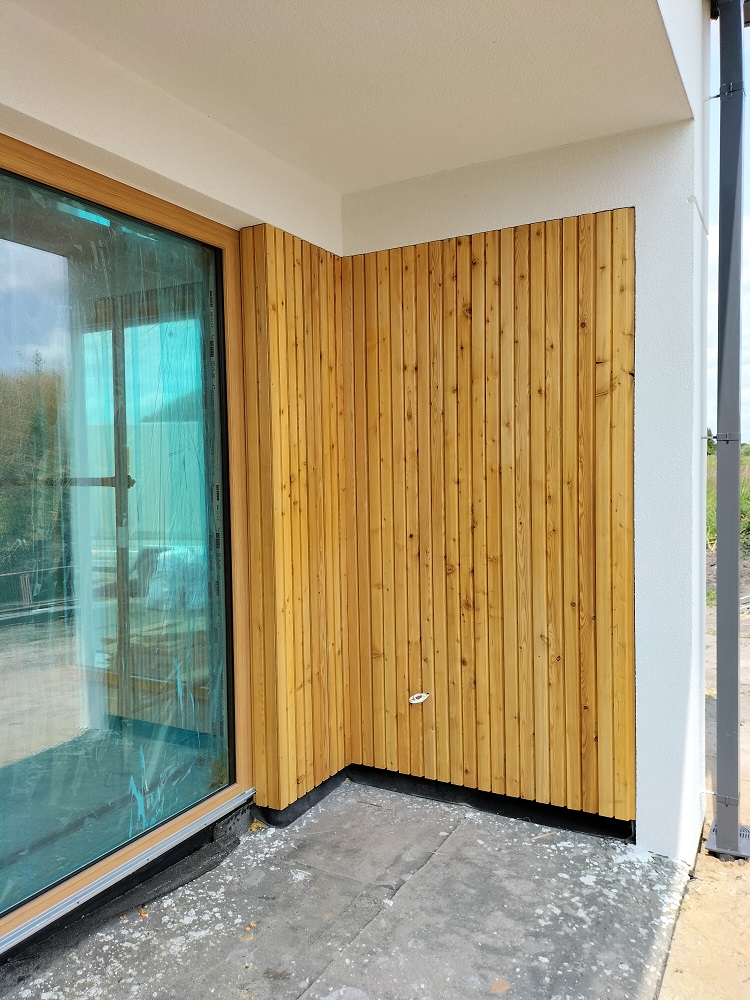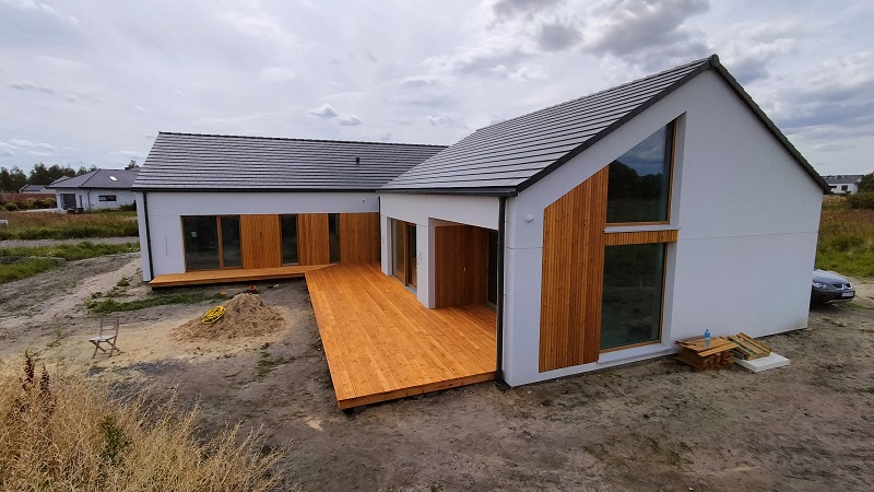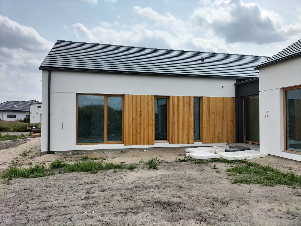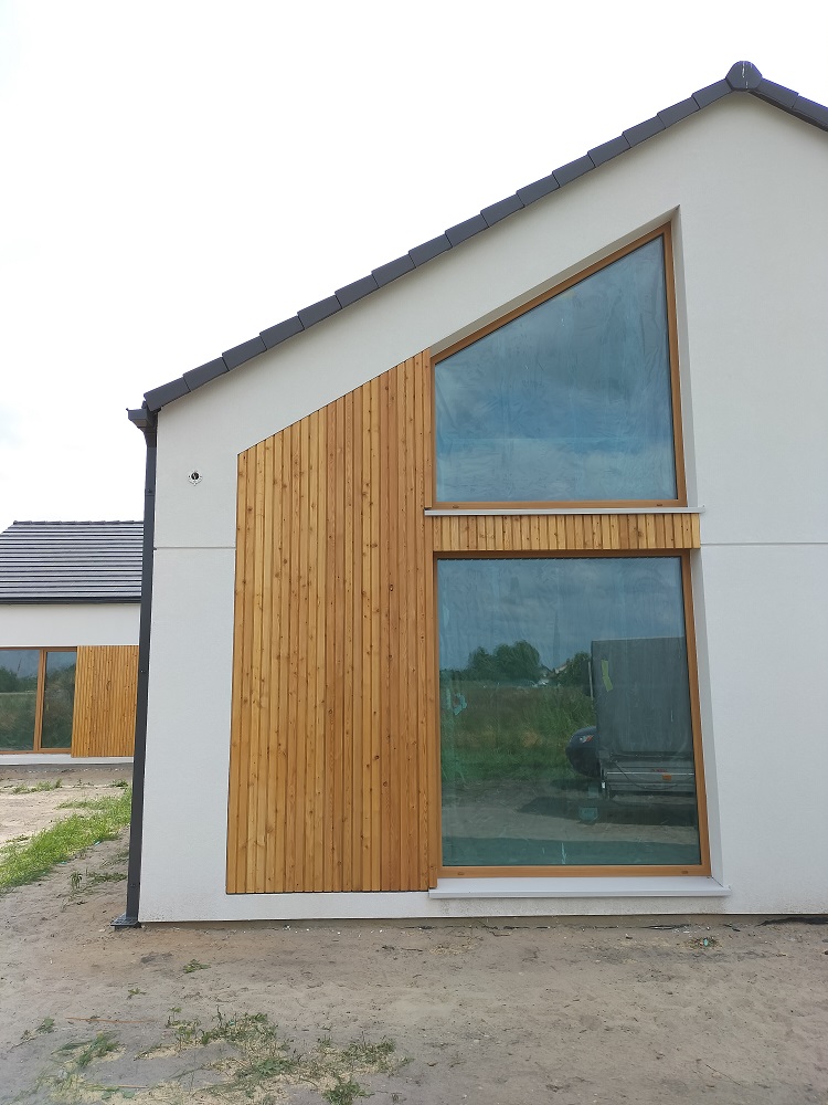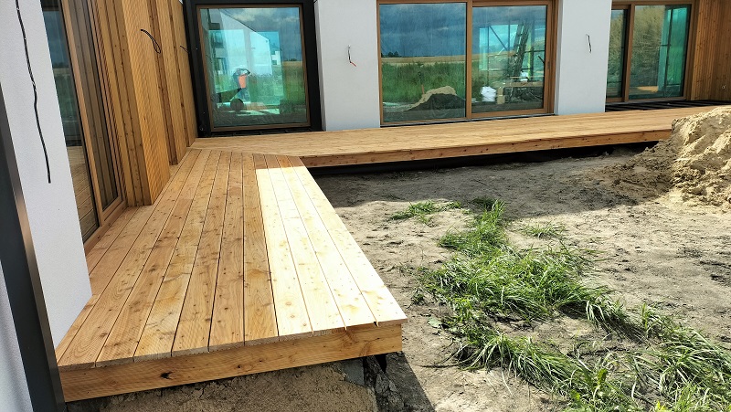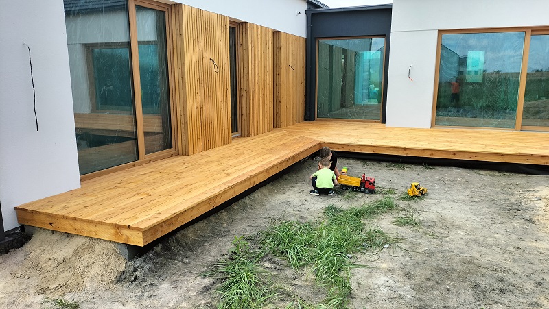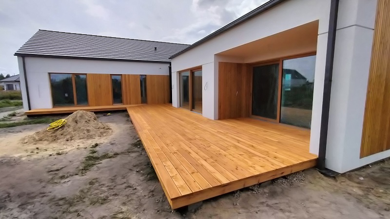 Zakres prac: na domu zamontowaliśmy deski elewacyjne modrzew syberyjski duo romb,taras wykonaliśmy z desek z modrzewia syberyjskiego,elewacja i taras w kolorze naturalnym.