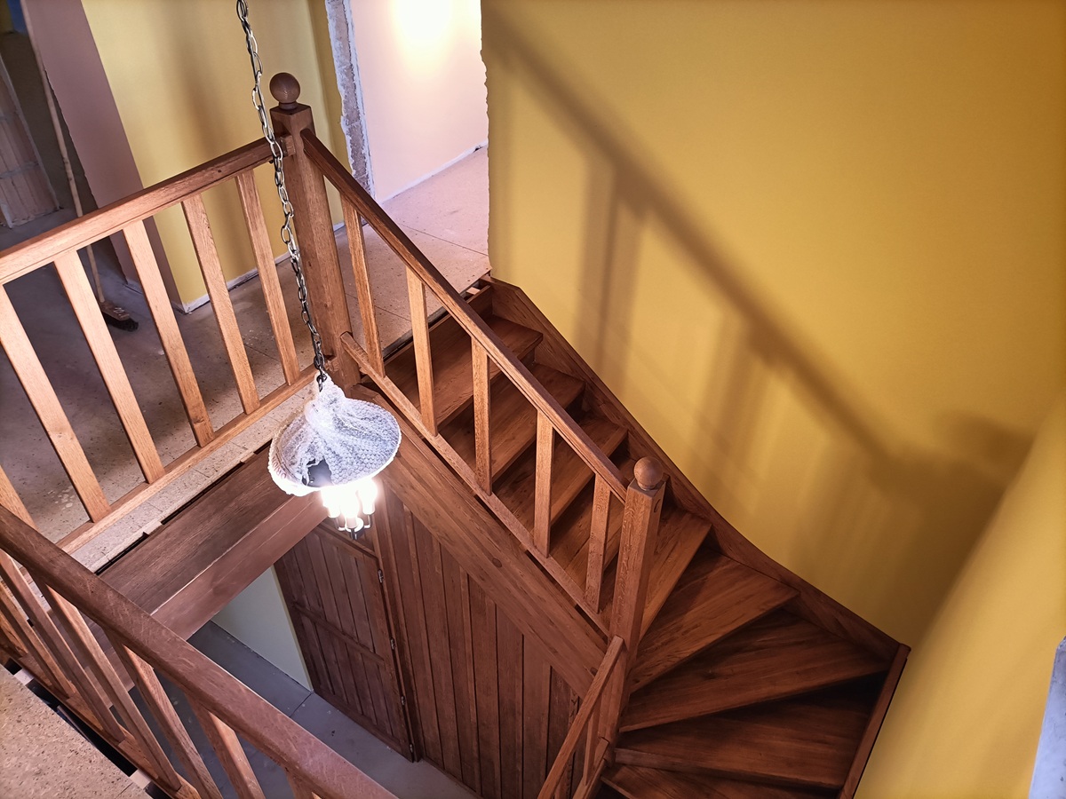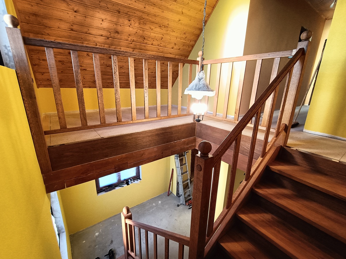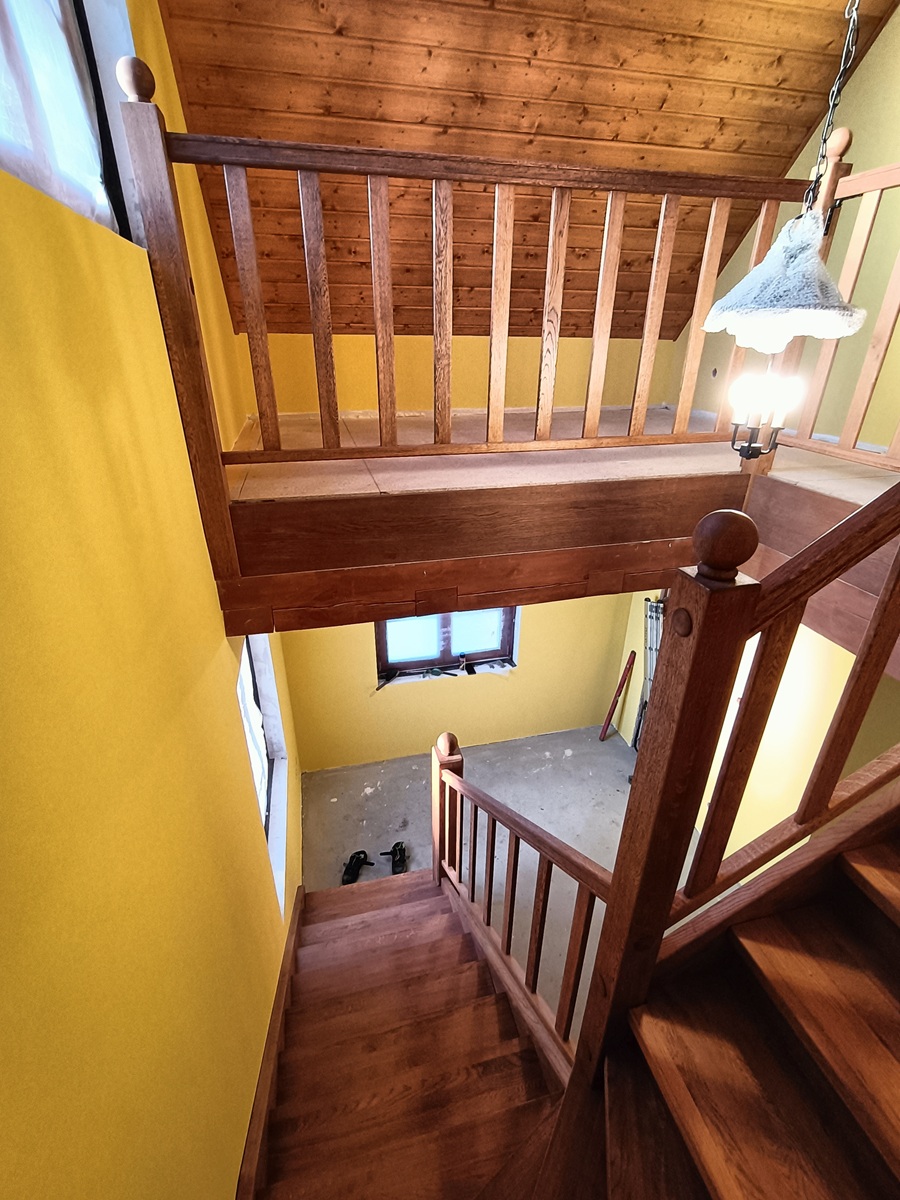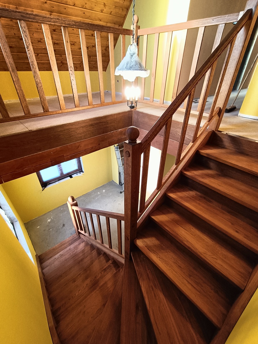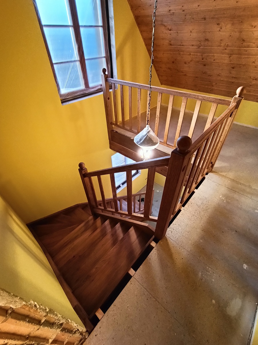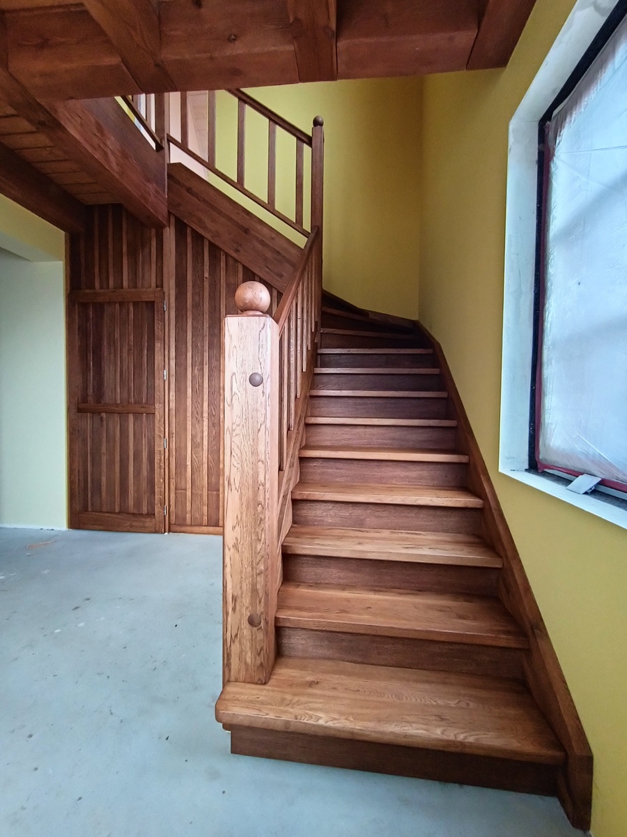 • drewniane schody zabiegowe i klatka schodowa wewnątrz domu
