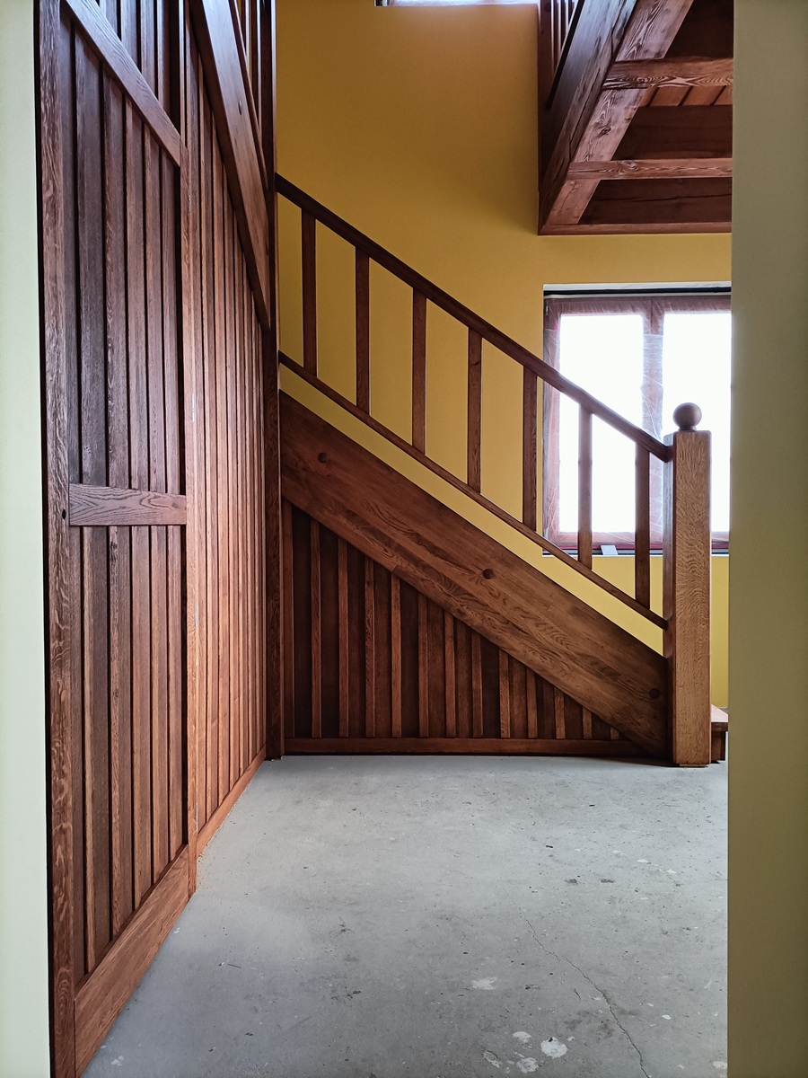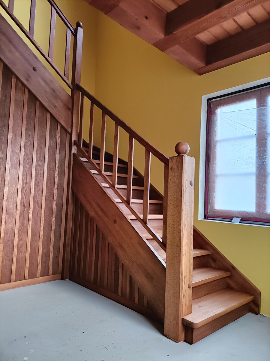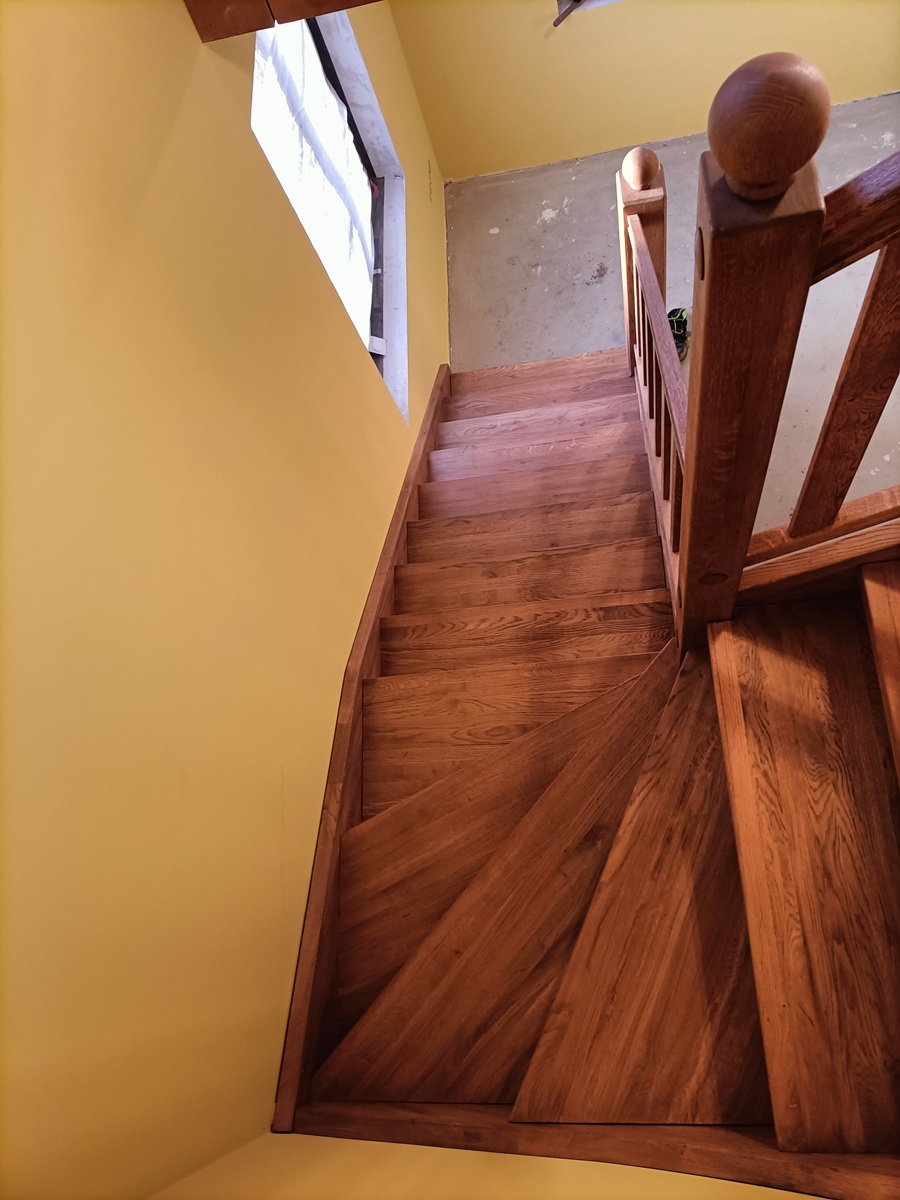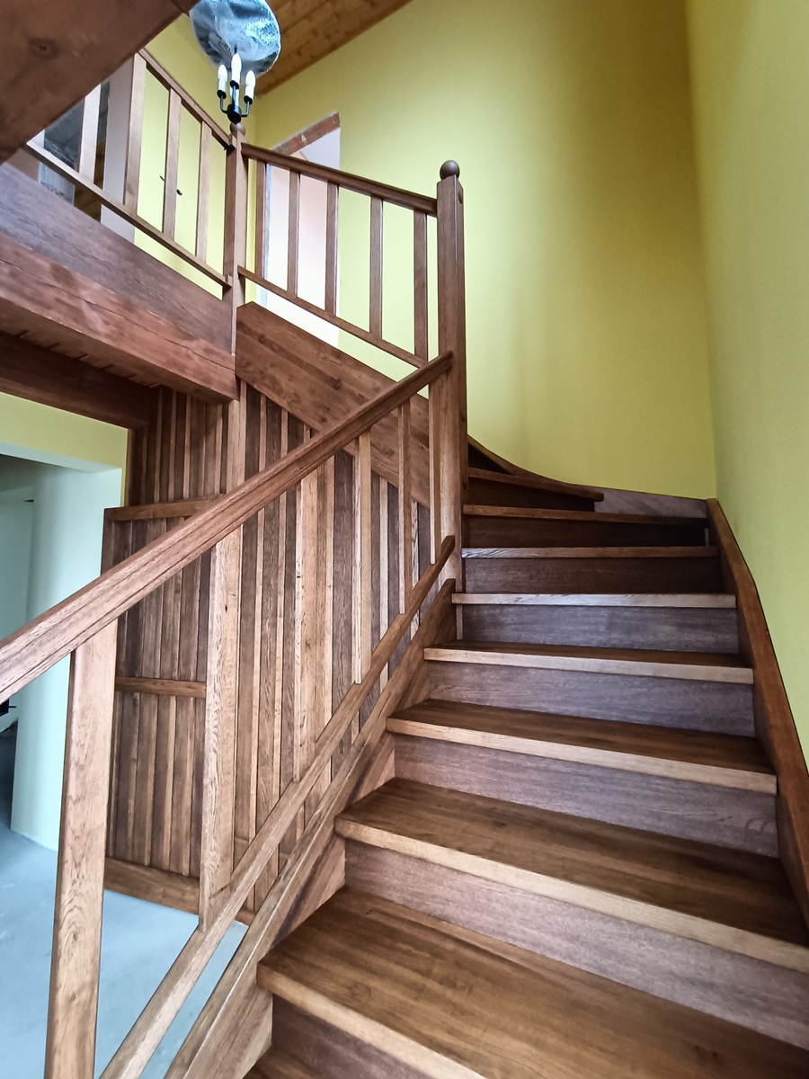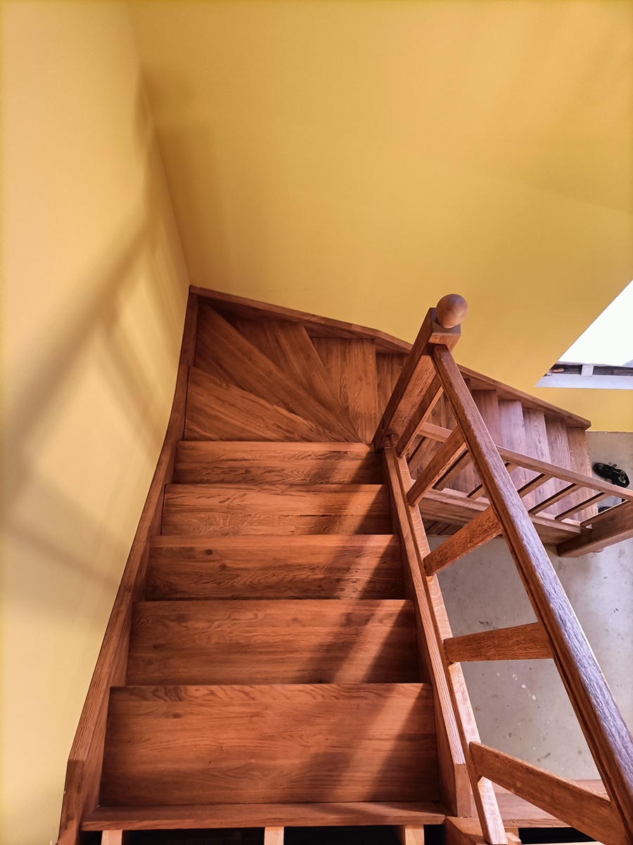 • drewniane schody zabiegowe i klatka schodowa wewnątrz domu