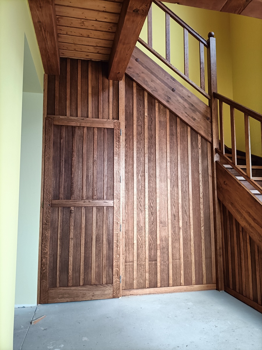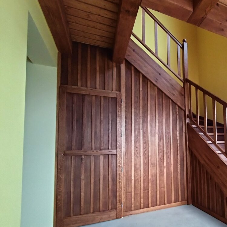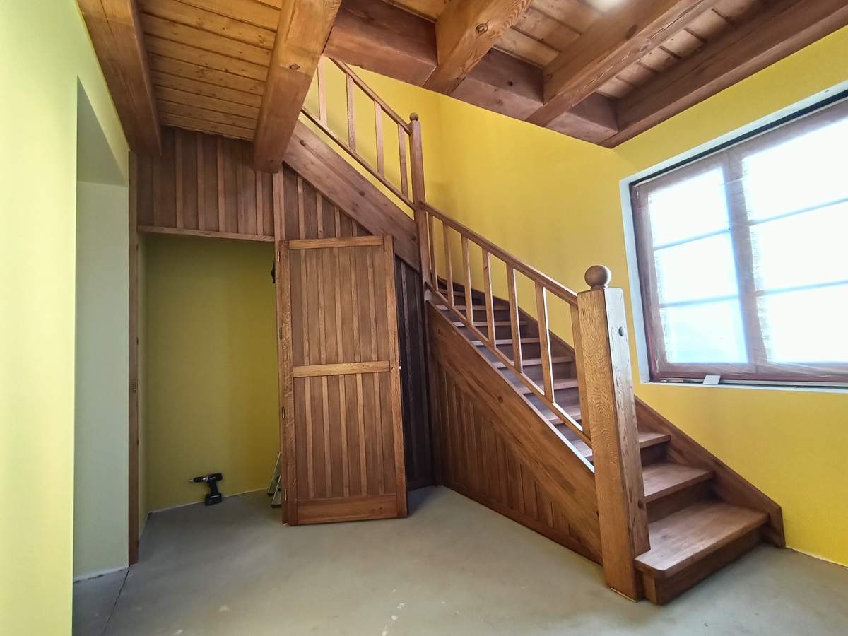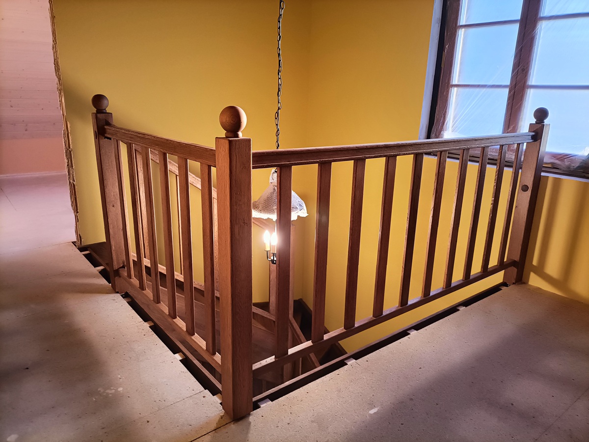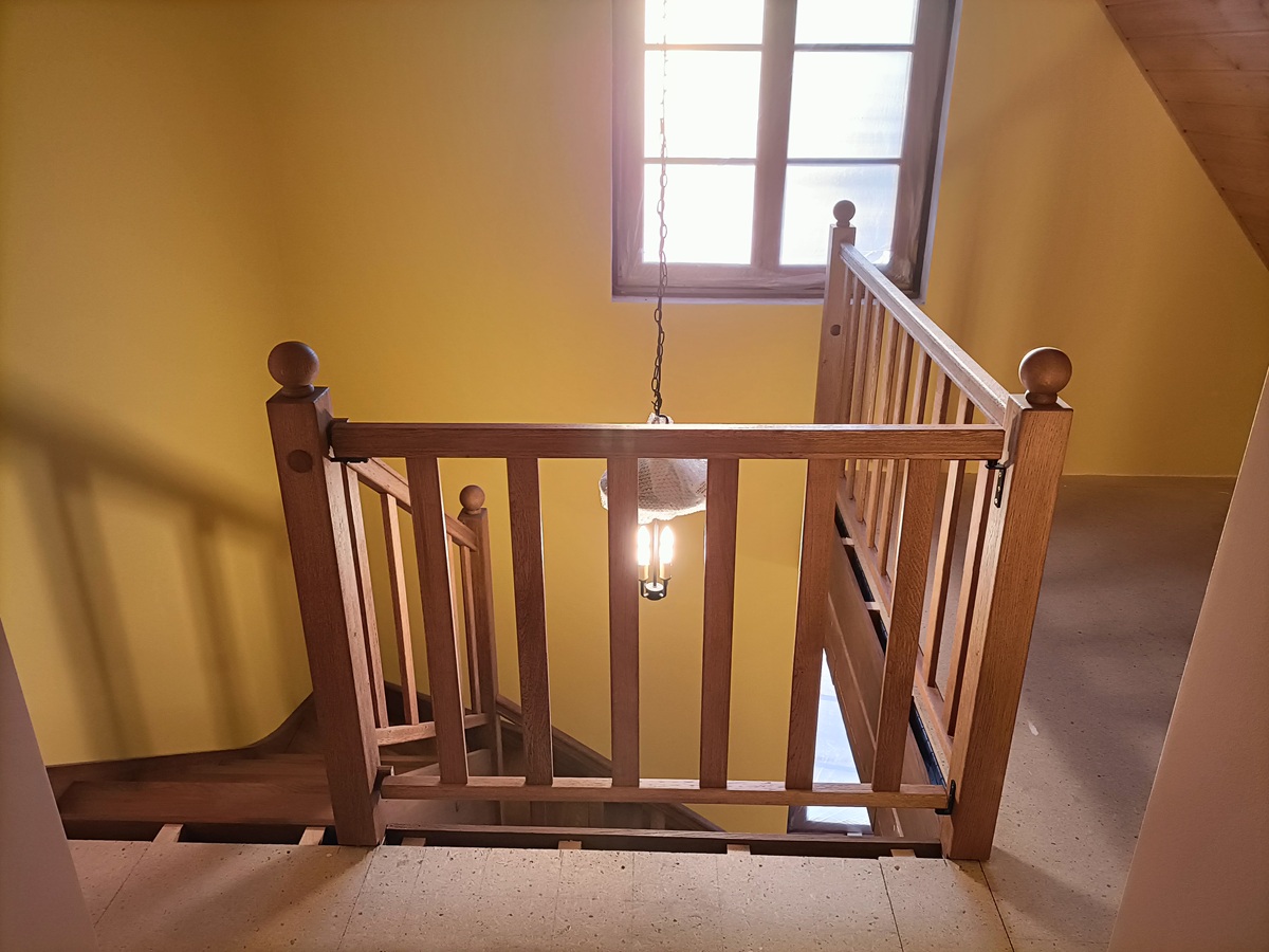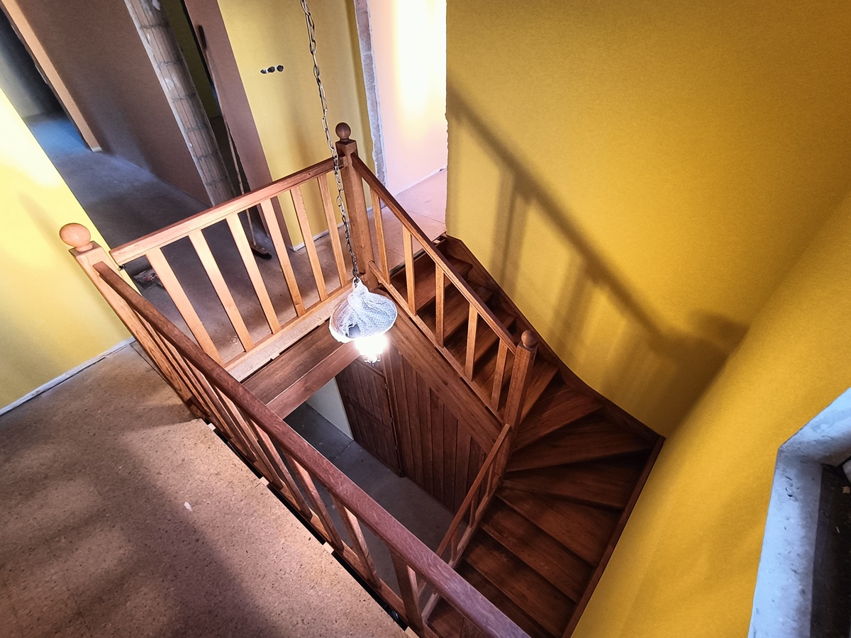 • drewniane schody zabiegowe i klatka schodowa wewnątrz domu