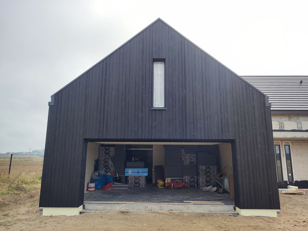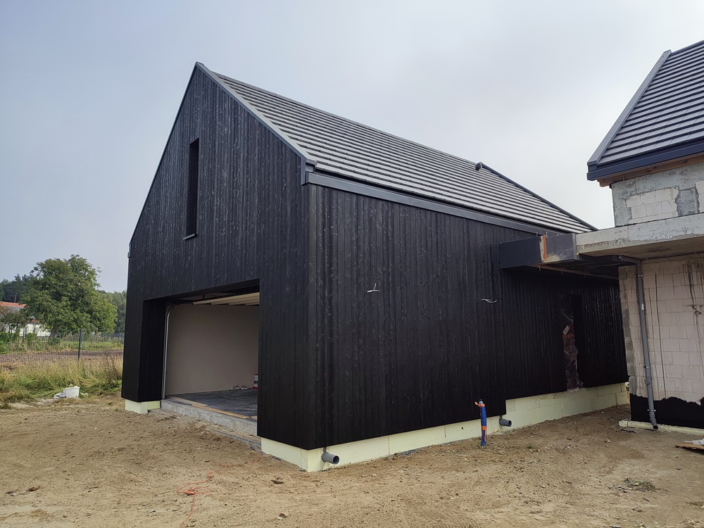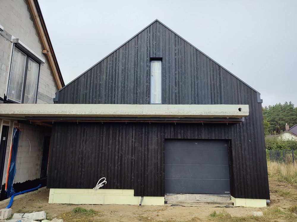 Zakres prac: montaż elewacji drewnianej wentylowanej,deska elewacyjna palona i impregnowana na czarno.