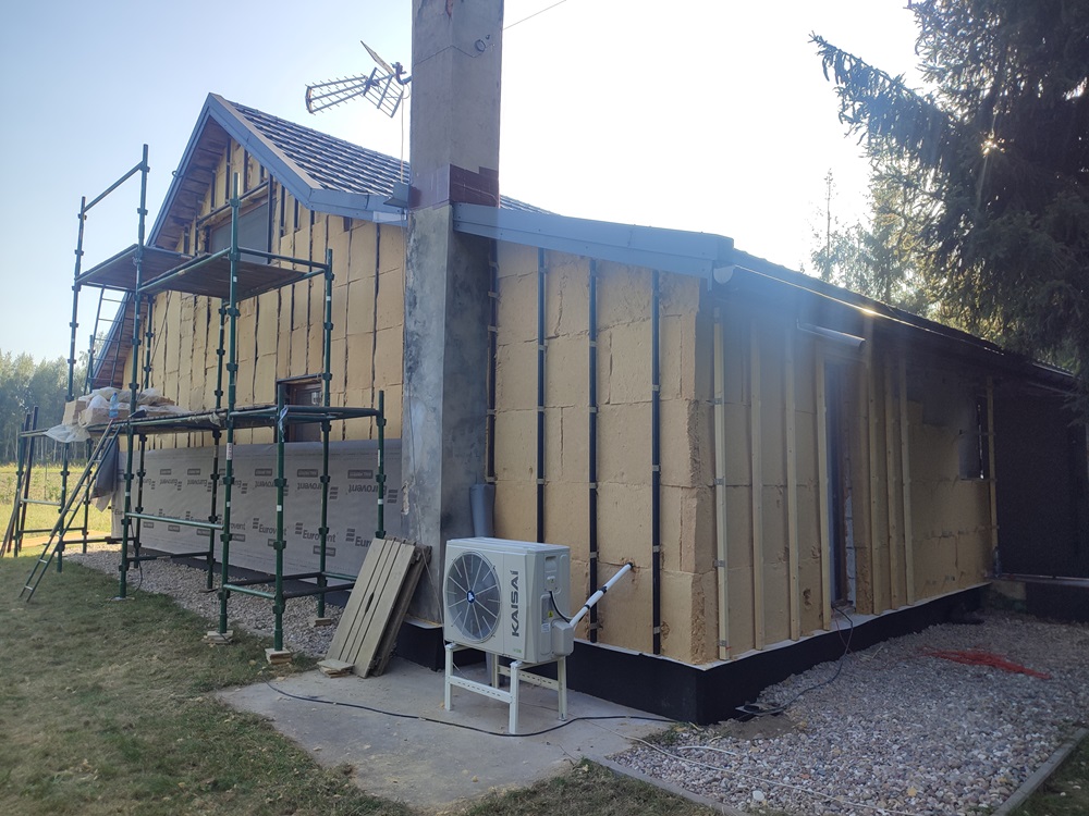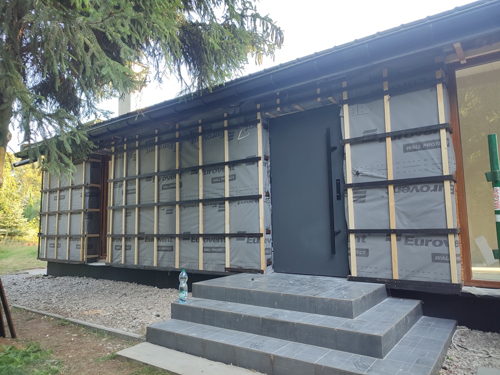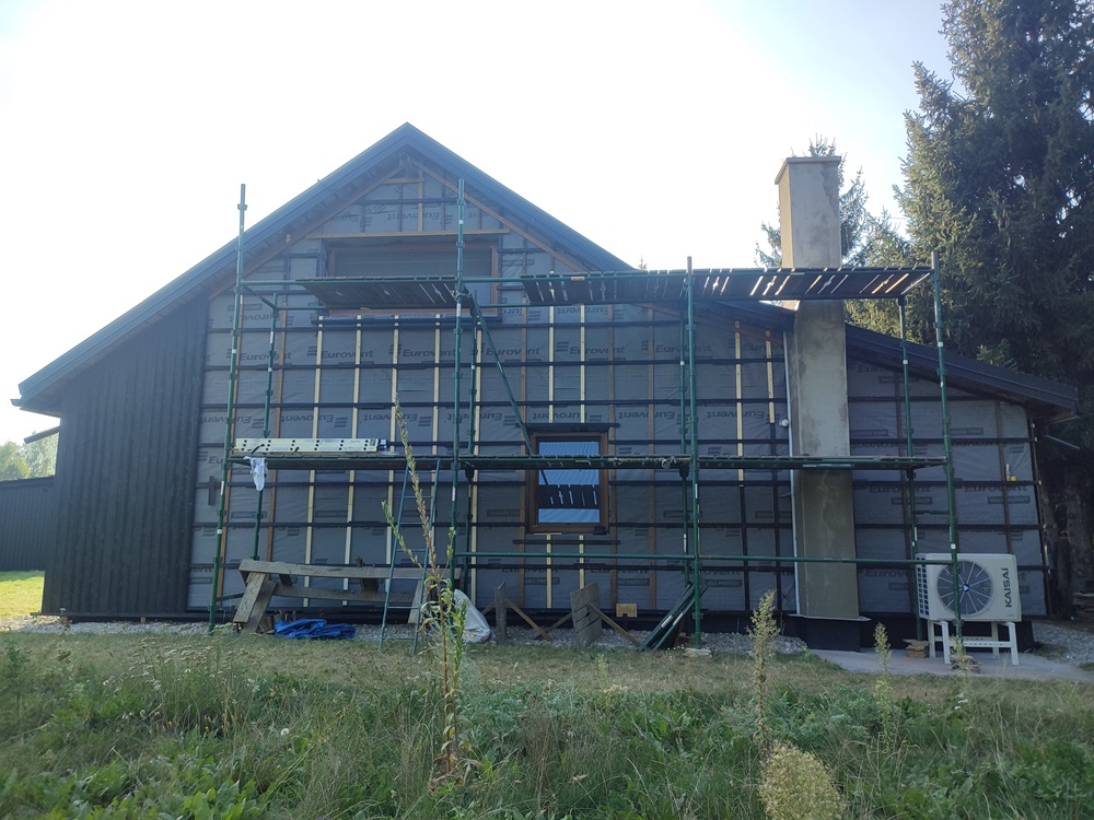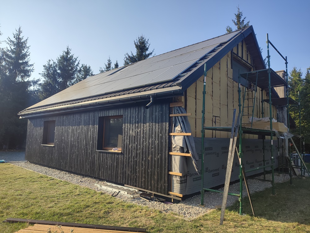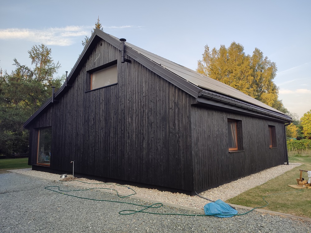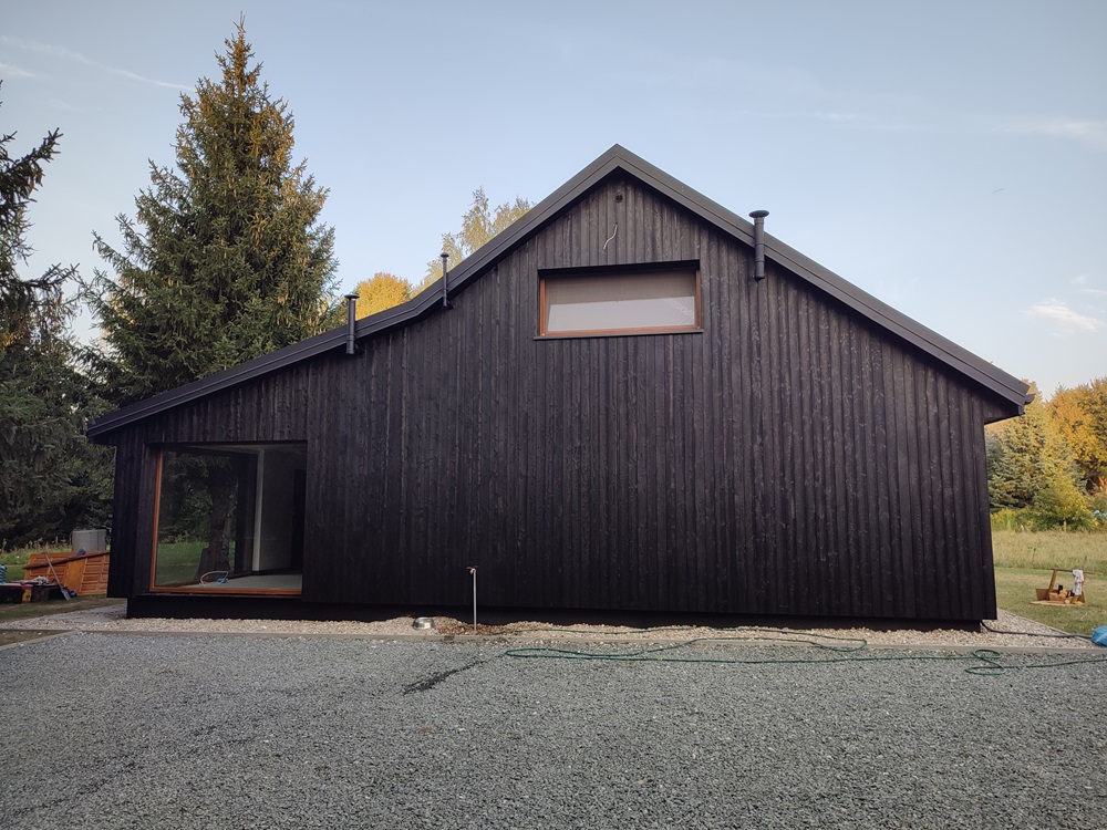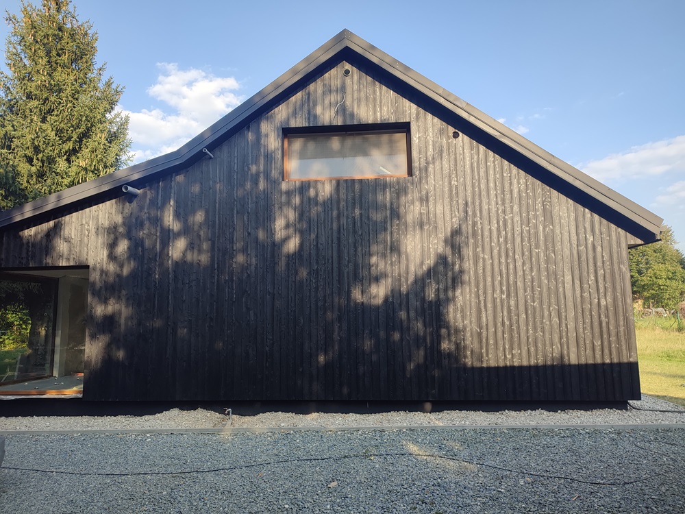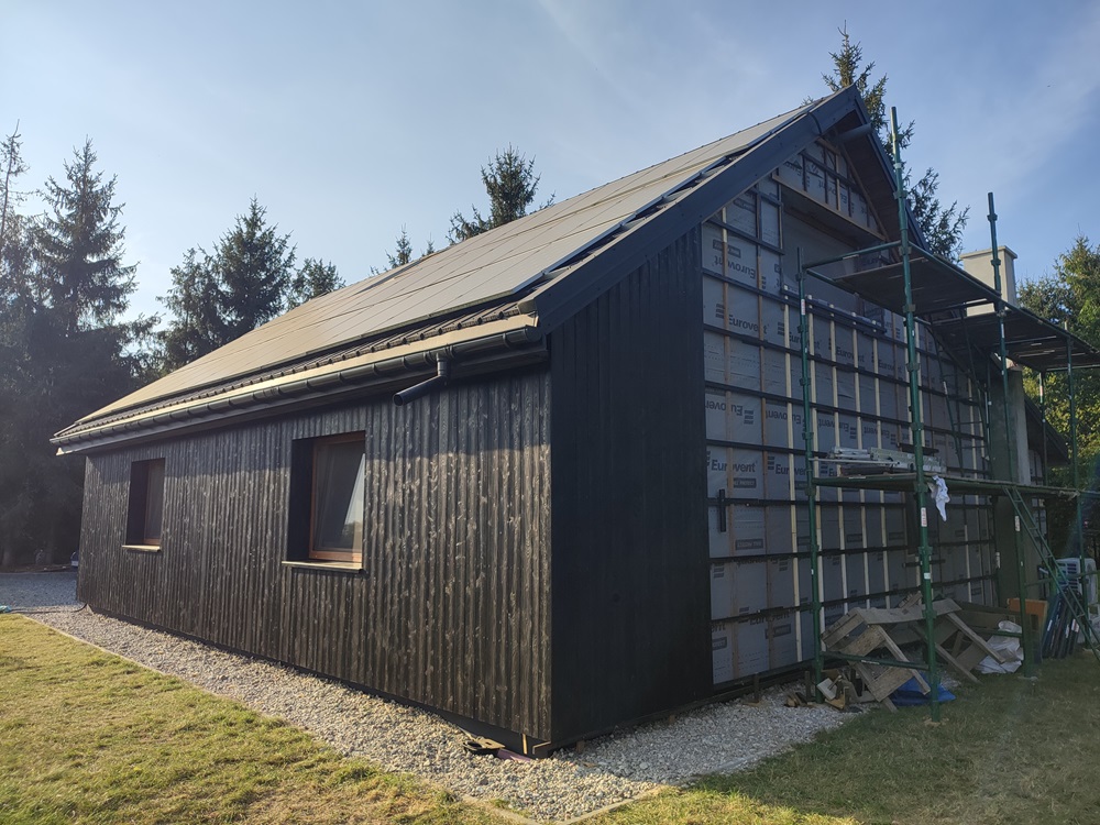 - montaż termoizolacji zewnętrznej oraz czarnych opalanych desek elewacyjnych, nawiązujących barwą do oryginalnego wyglądu domu,
