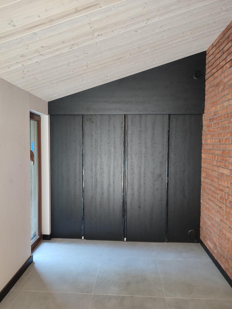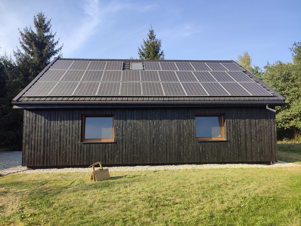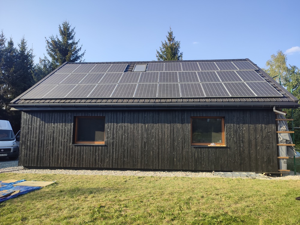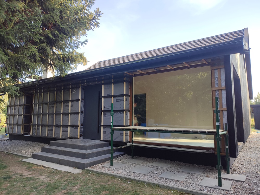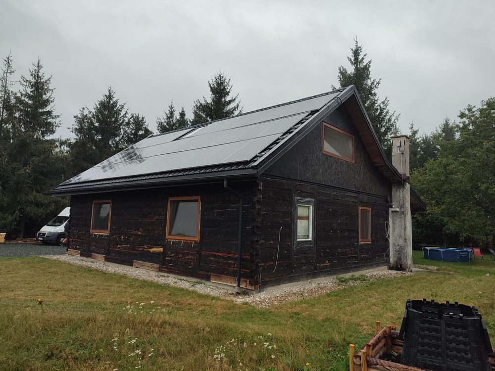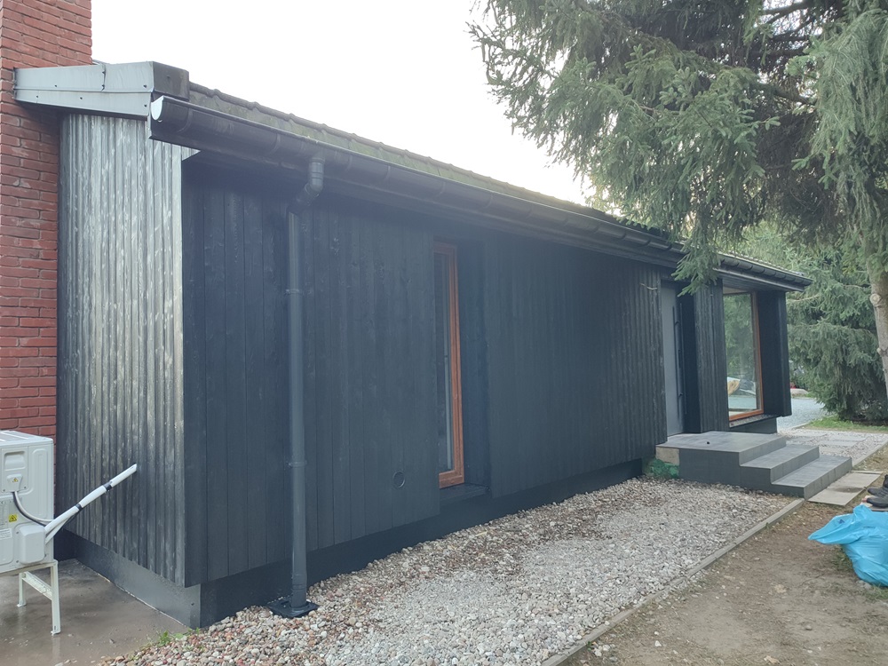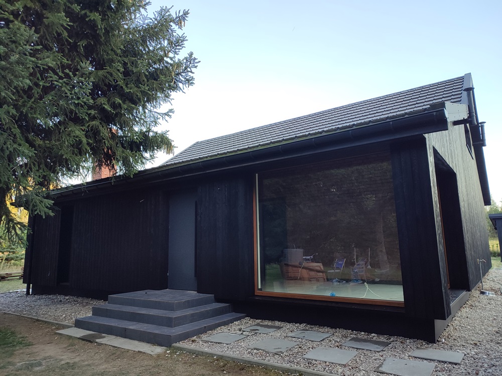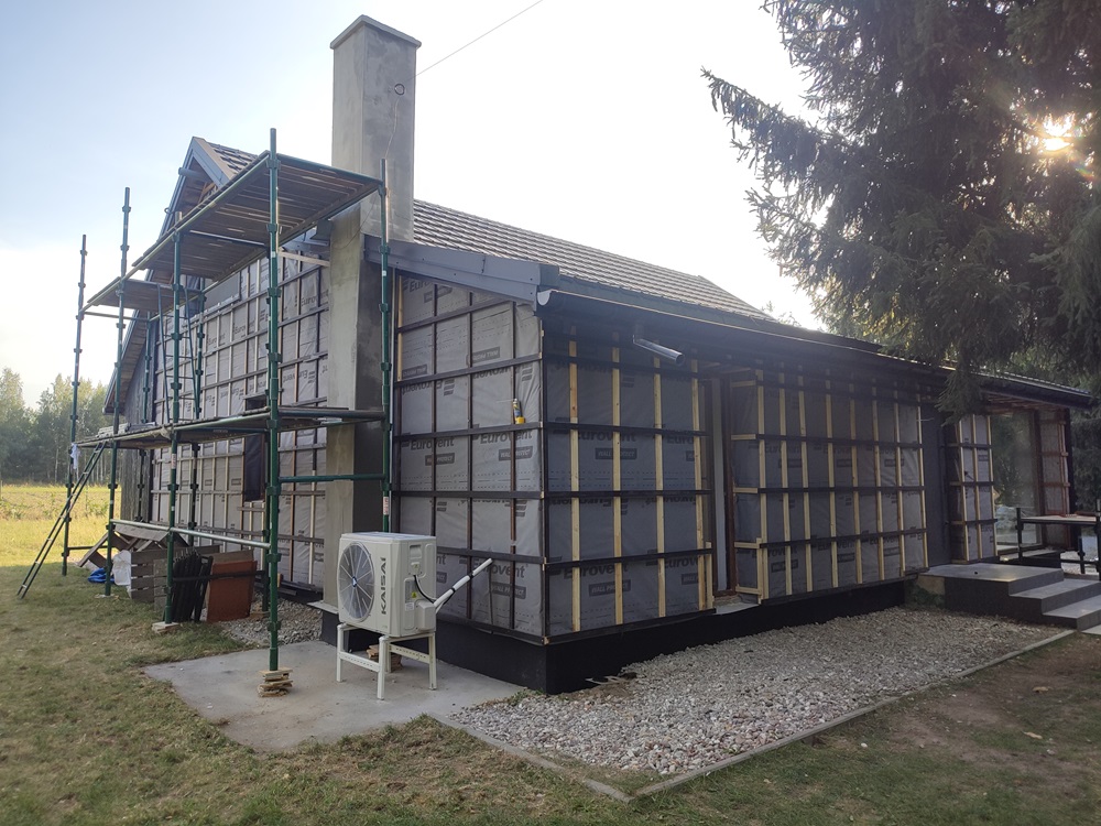 - montaż termoizolacji zewnętrznej oraz czarnych opalanych desek elewacyjnych, nawiązujących barwą do oryginalnego wyglądu domu,