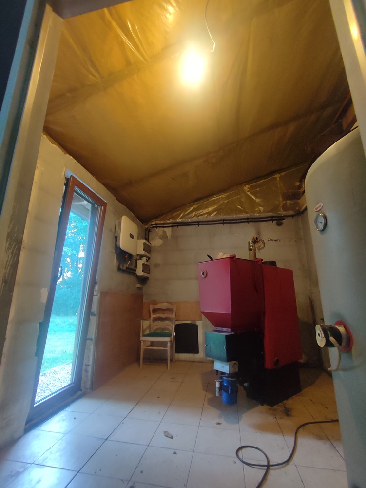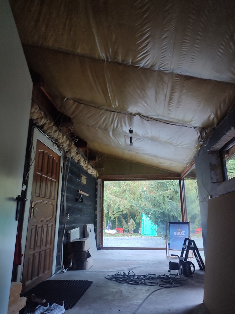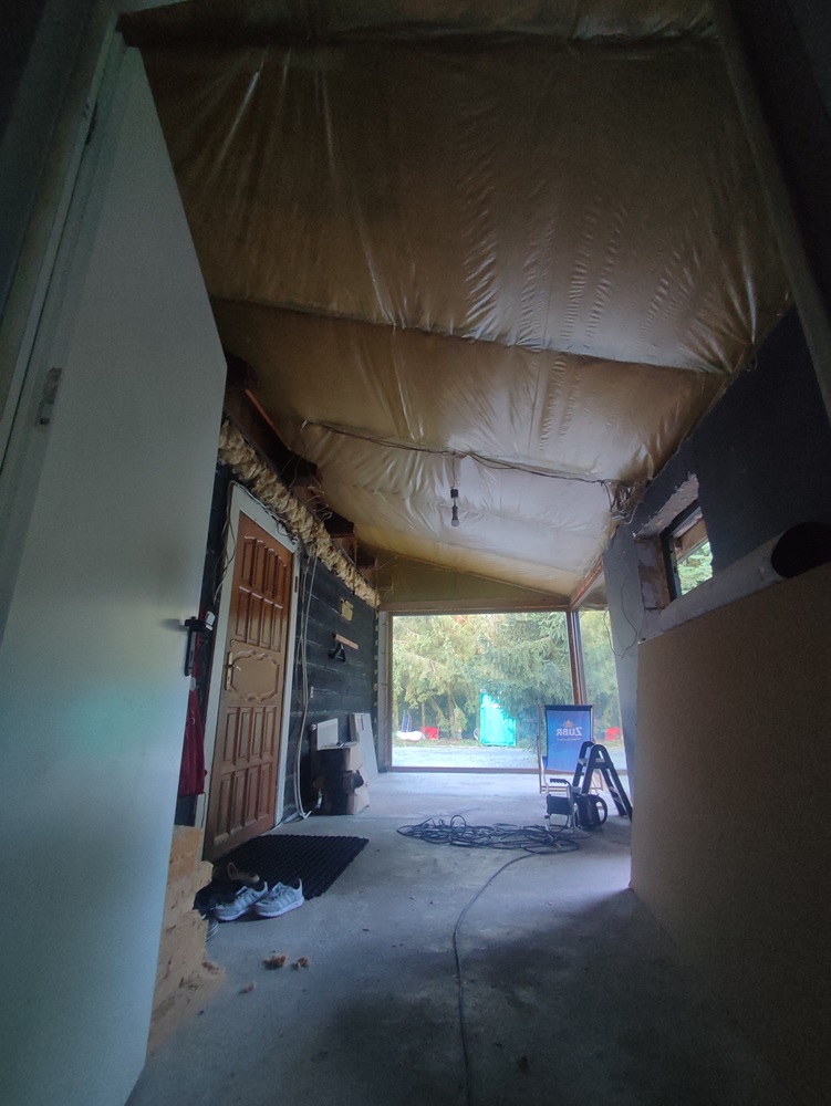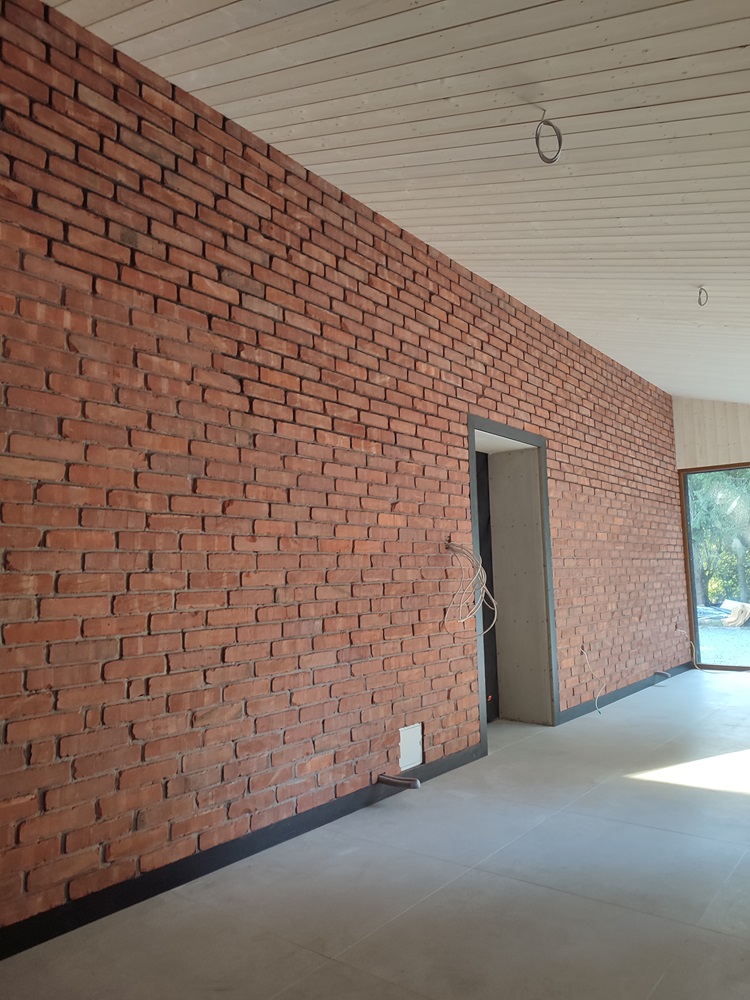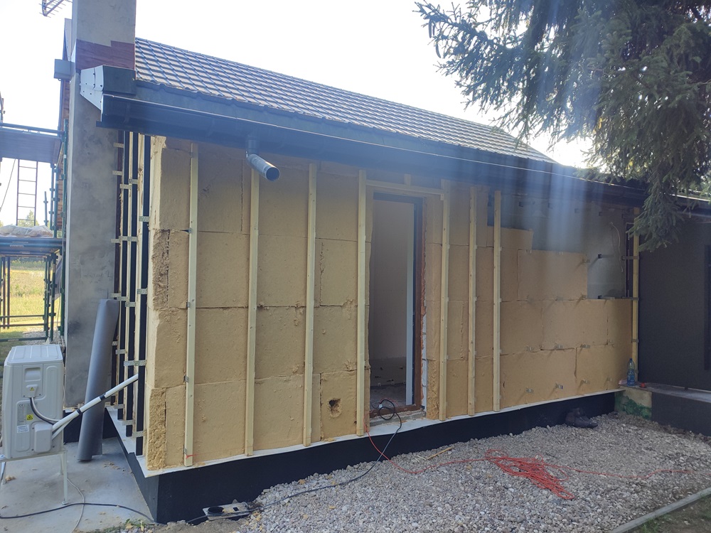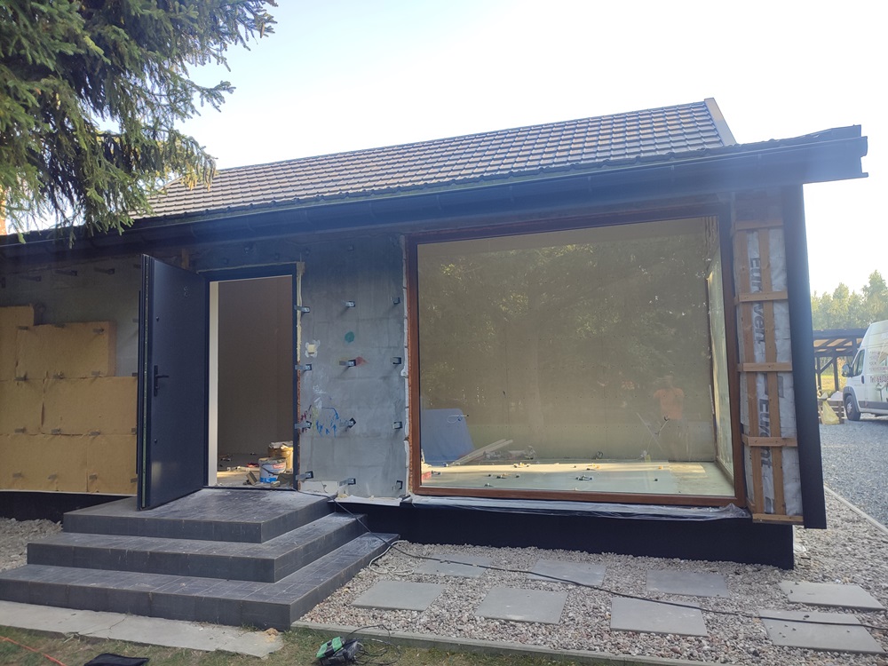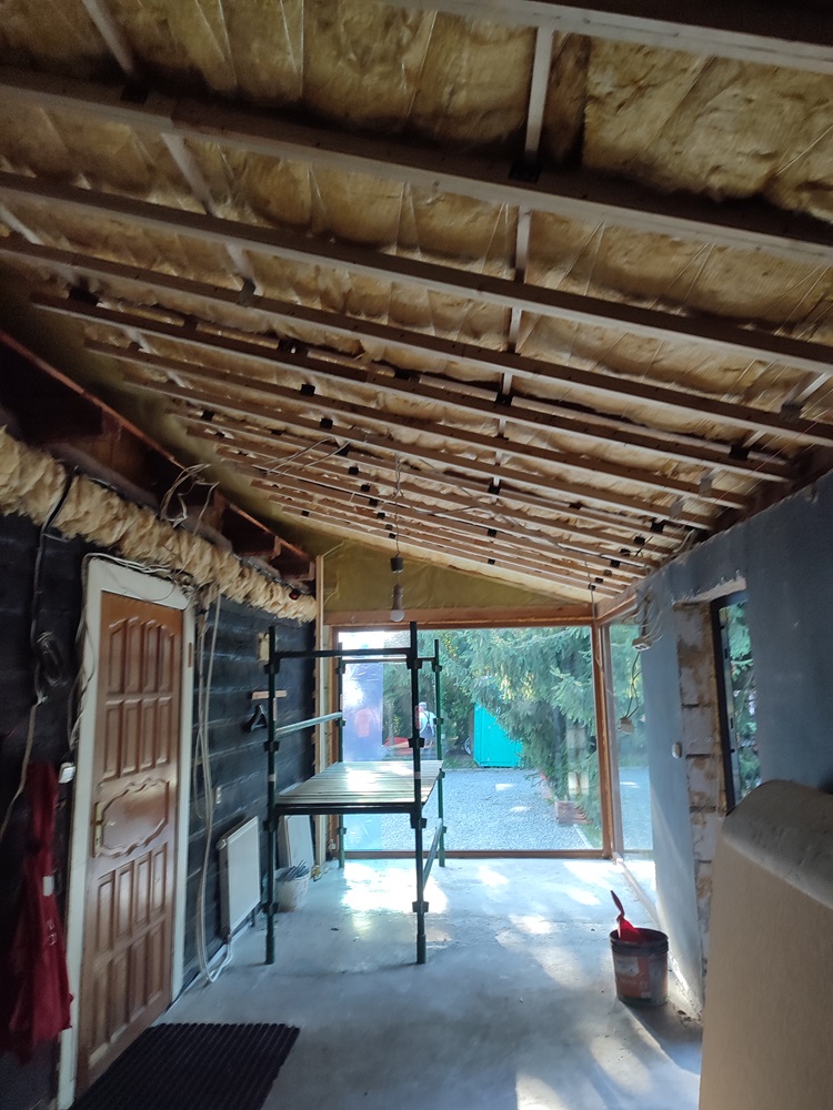 - wewnątrz stworzenie w domu ogrodu zimowego: montaż izolacji na jednej ze ścian oraz cegły licówki; budowa przepierzenia oddzielające ogród zimowy od pomieszczenia technicznego oraz montaż boazerii z desek bielonych na suficie,