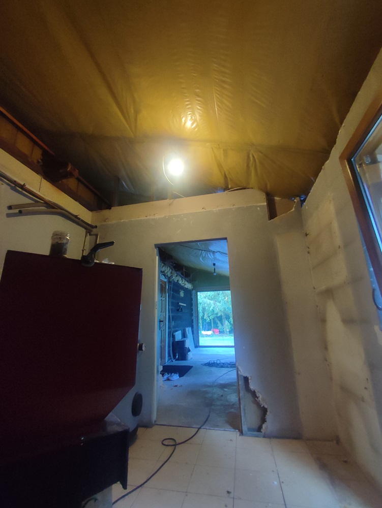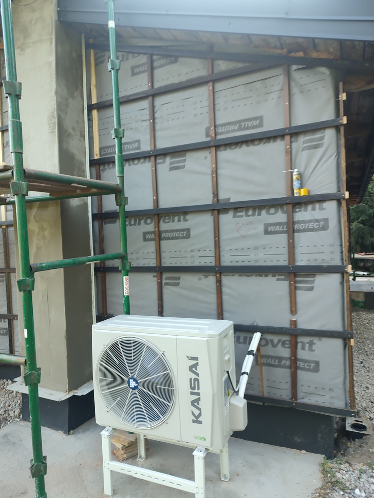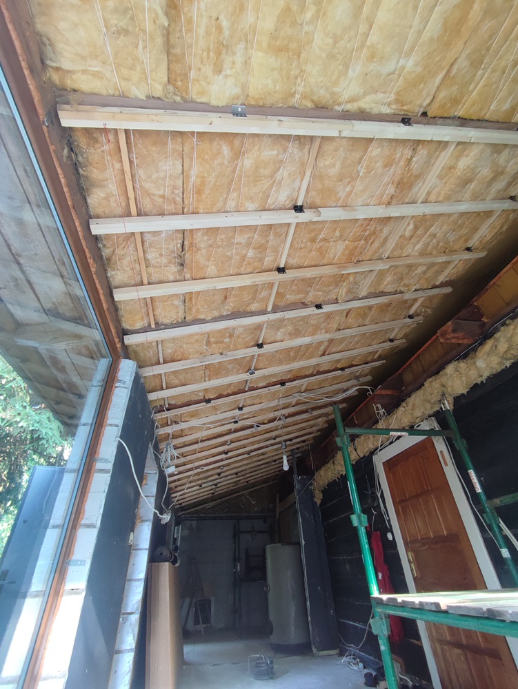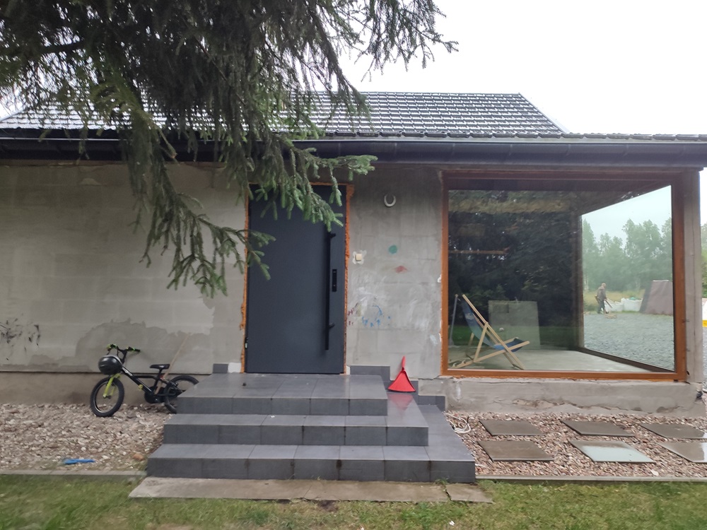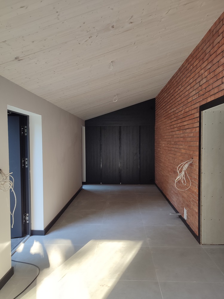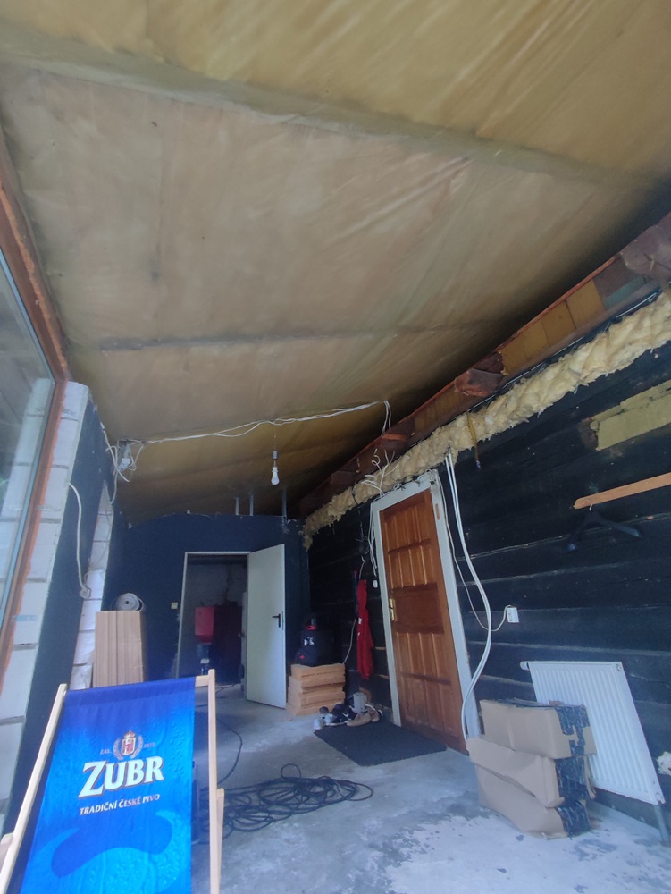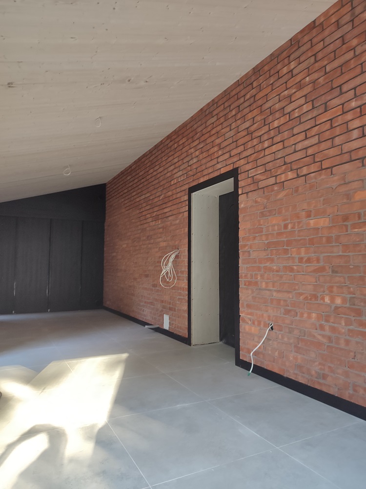 - wewnątrz stworzenie w domu ogrodu zimowego: montaż izolacji na jednej ze ścian oraz cegły licówki; budowa przepierzenia oddzielające ogród zimowy od pomieszczenia technicznego oraz montaż boazerii z desek bielonych na suficie,