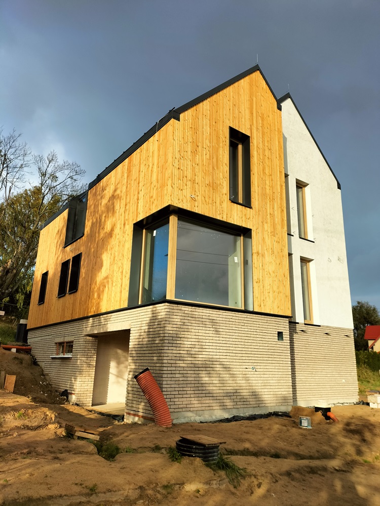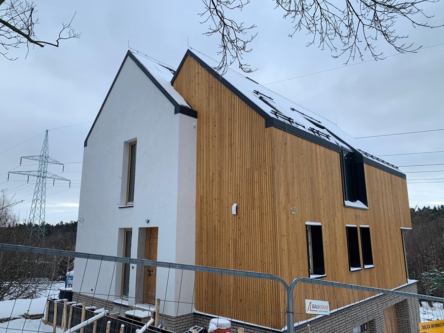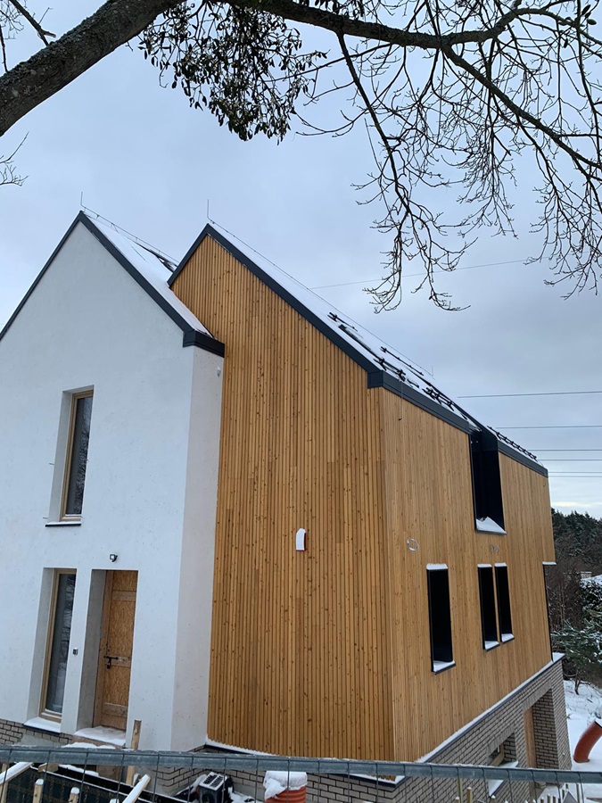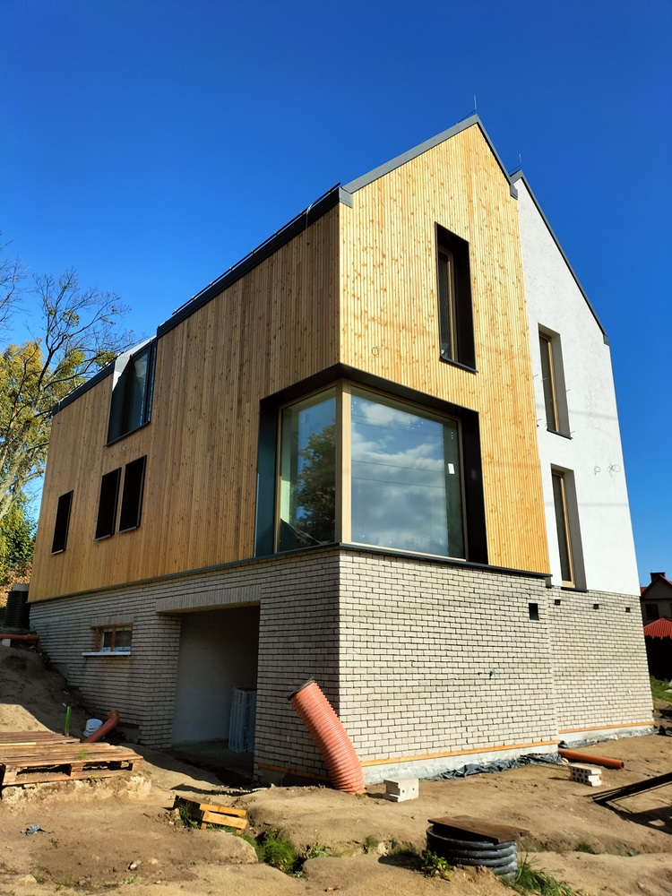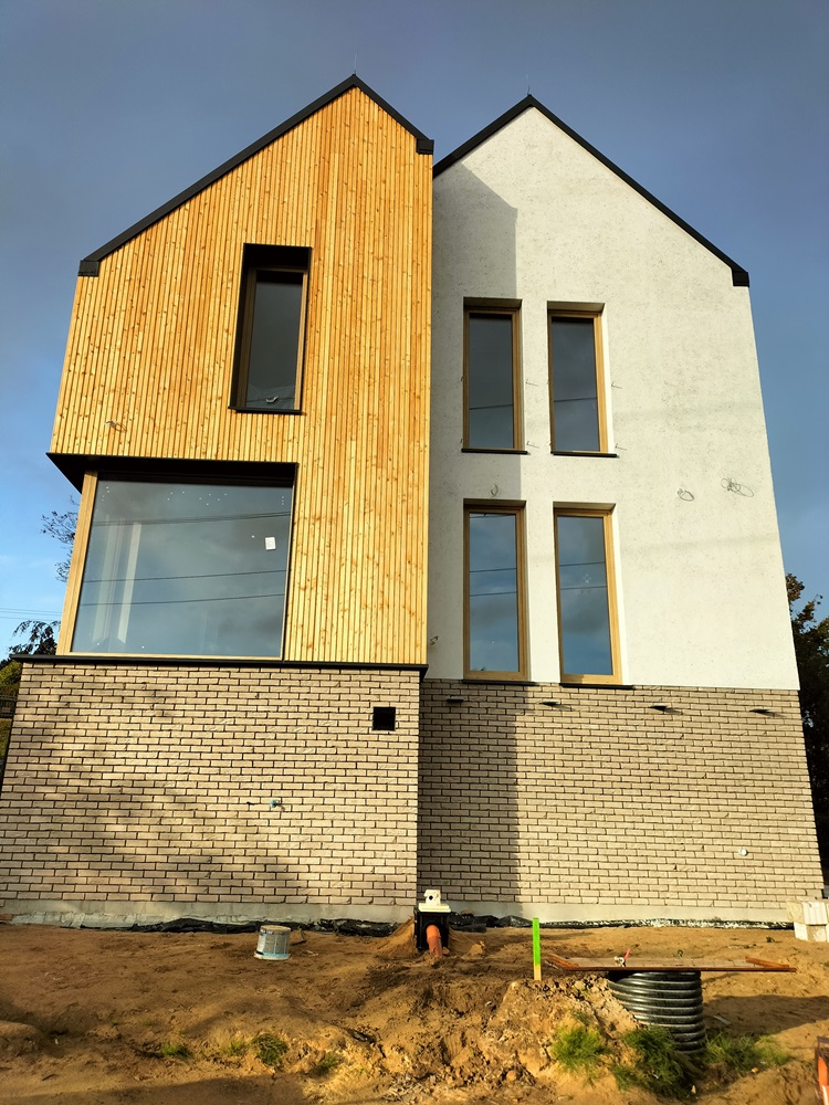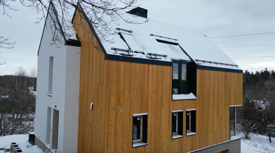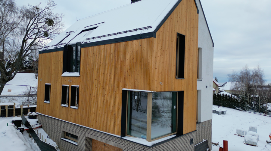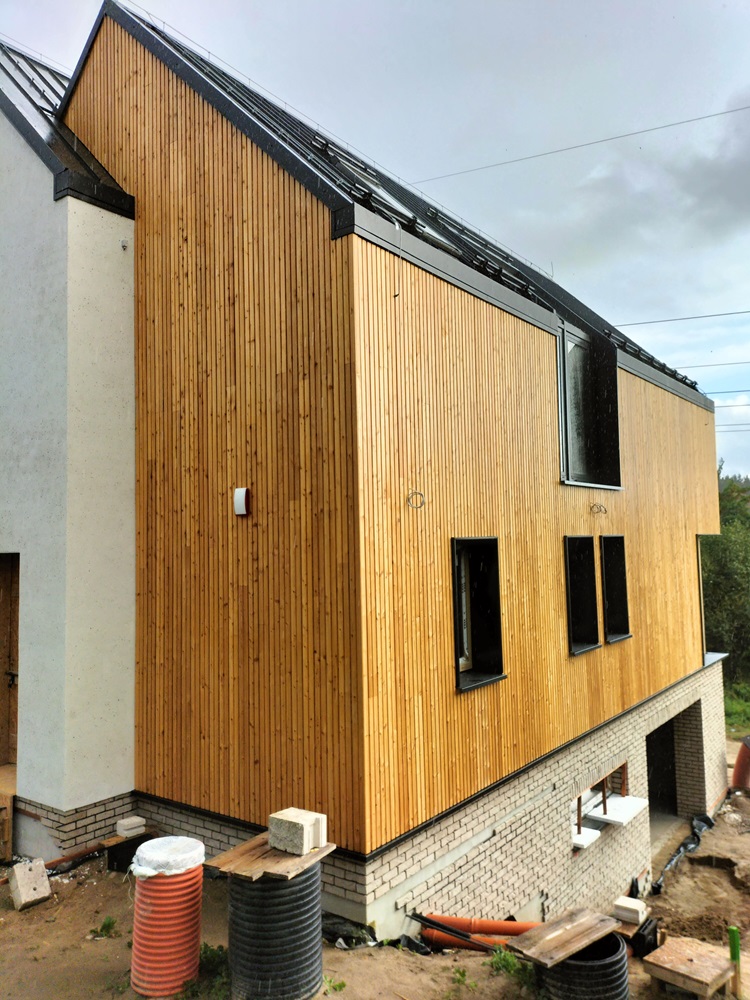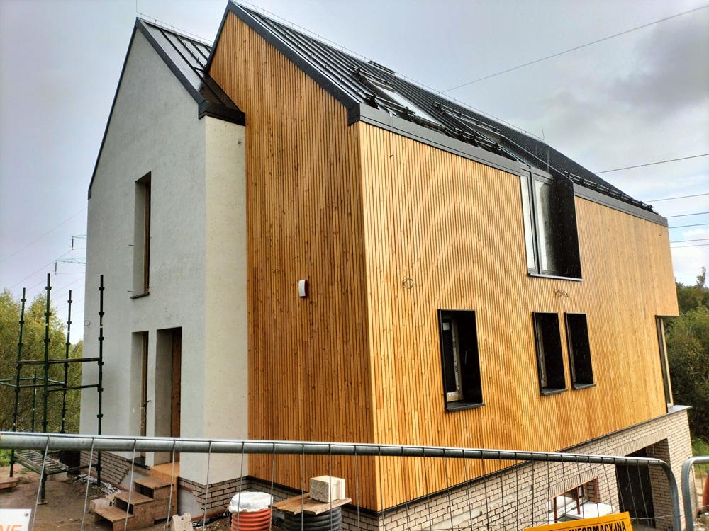 - część elewacji drewnianej, wentylowanej zbudowana jest z desek z modrzewia syberyjskiego,