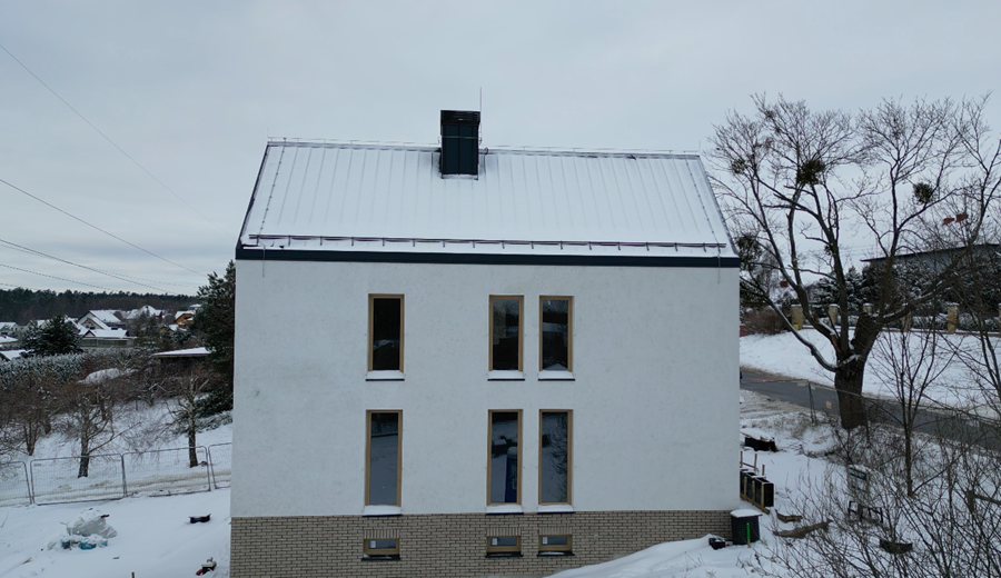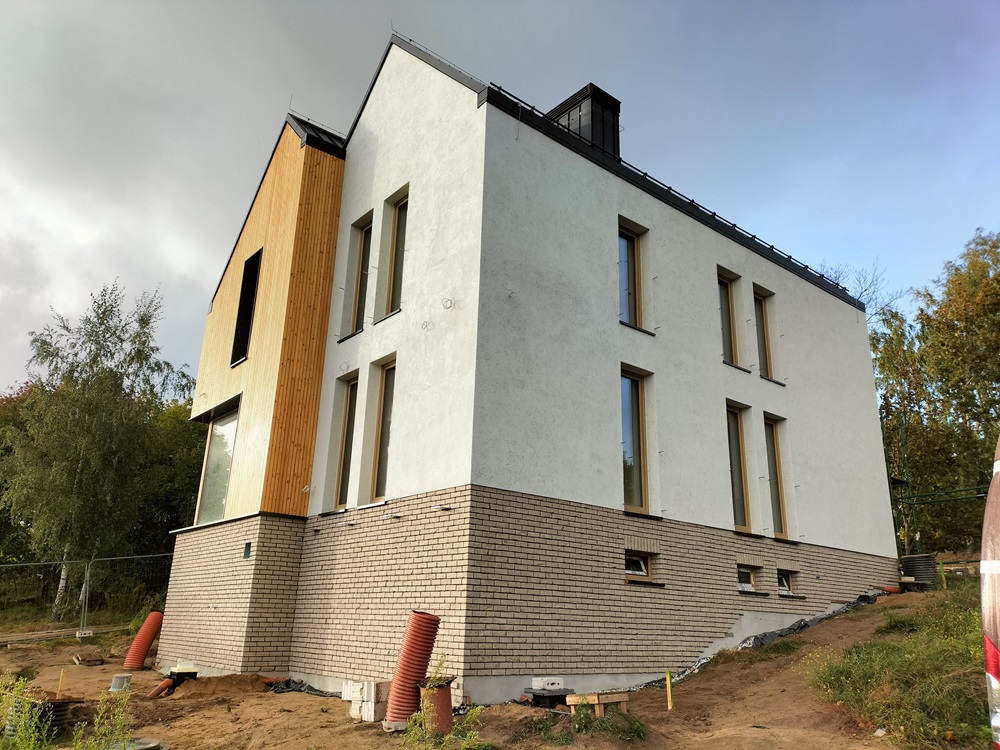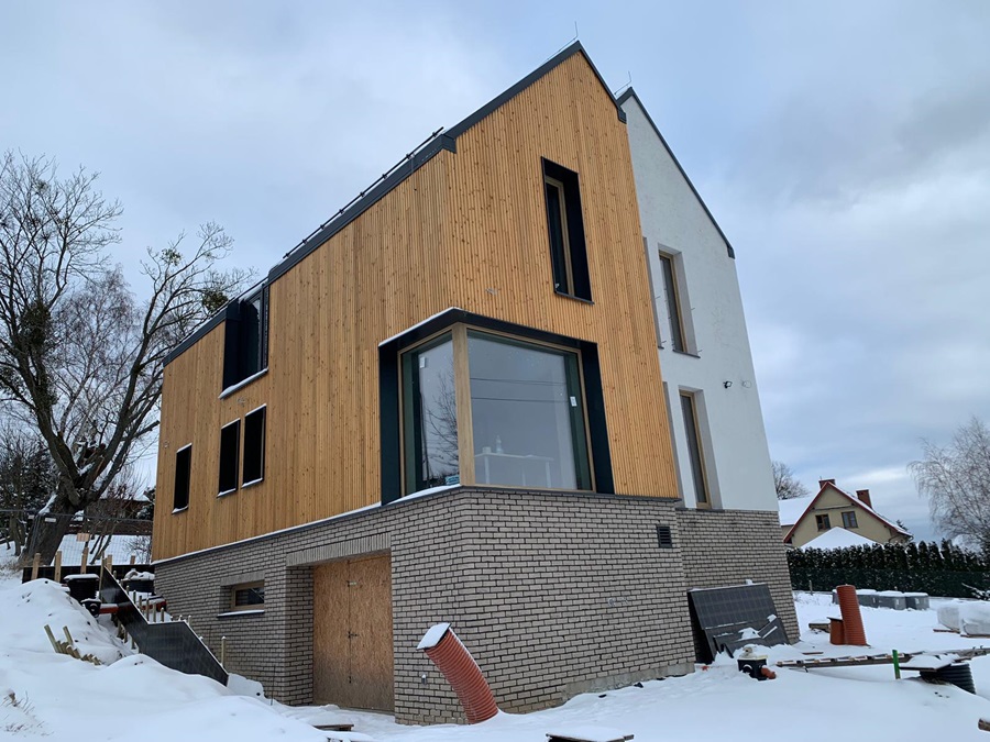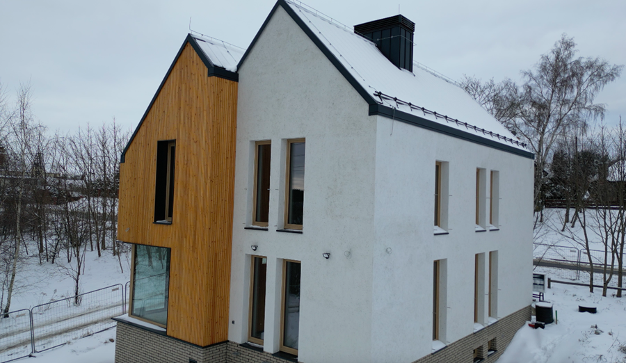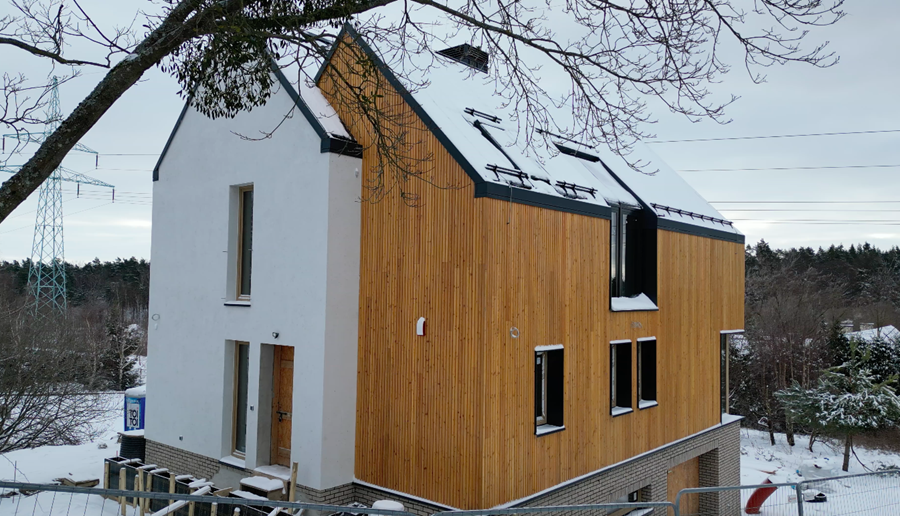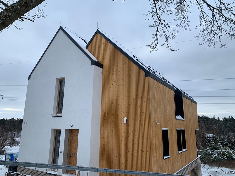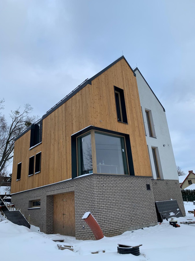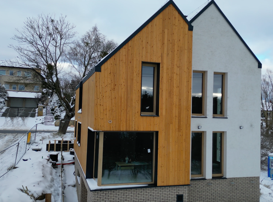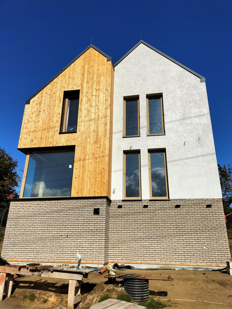 - część elewacji drewnianej, wentylowanej zbudowana jest z desek z modrzewia syberyjskiego,