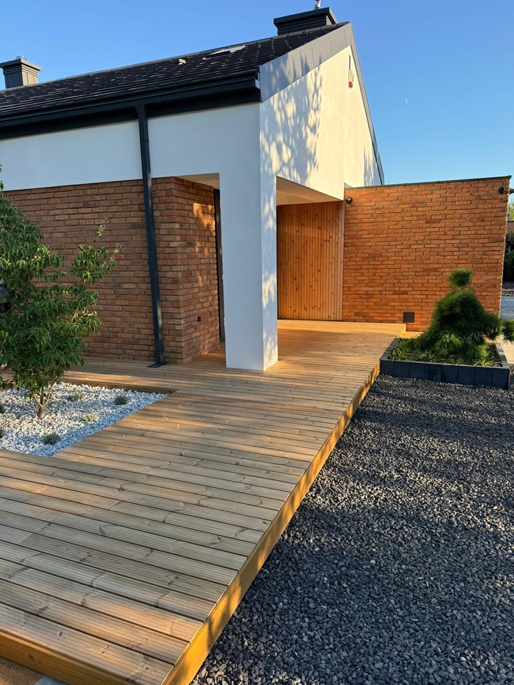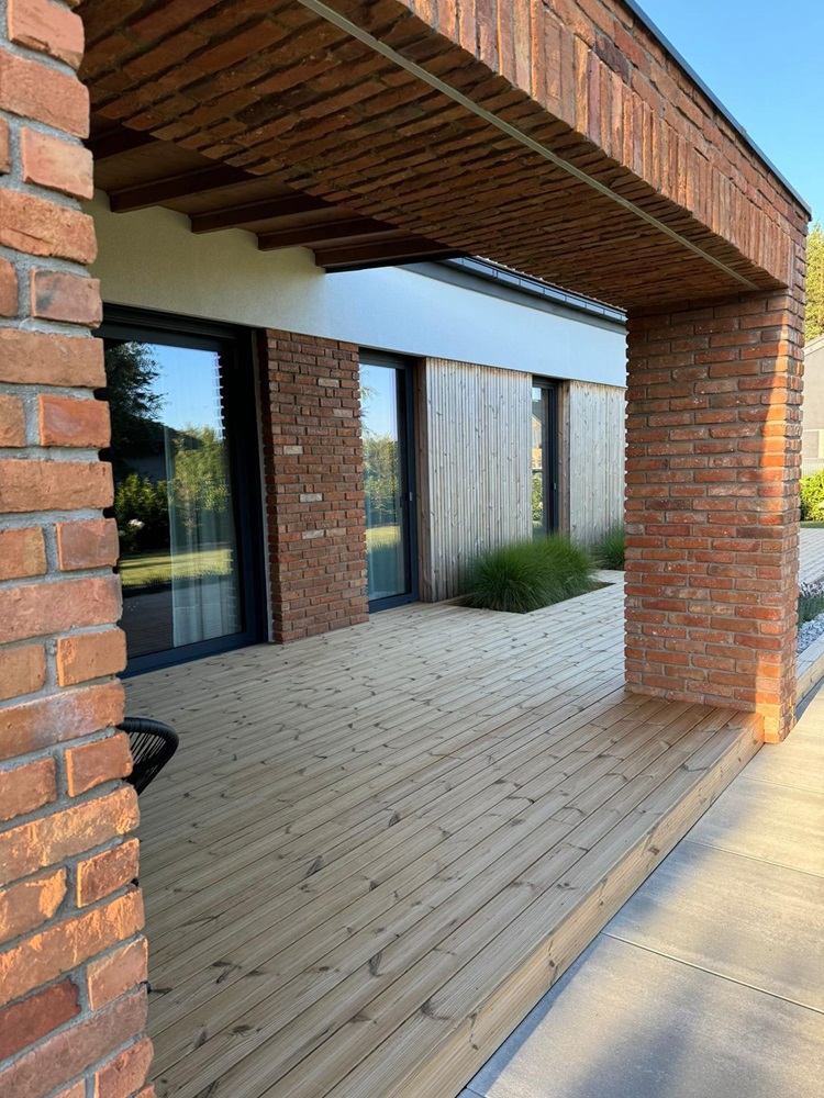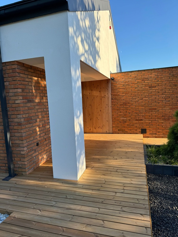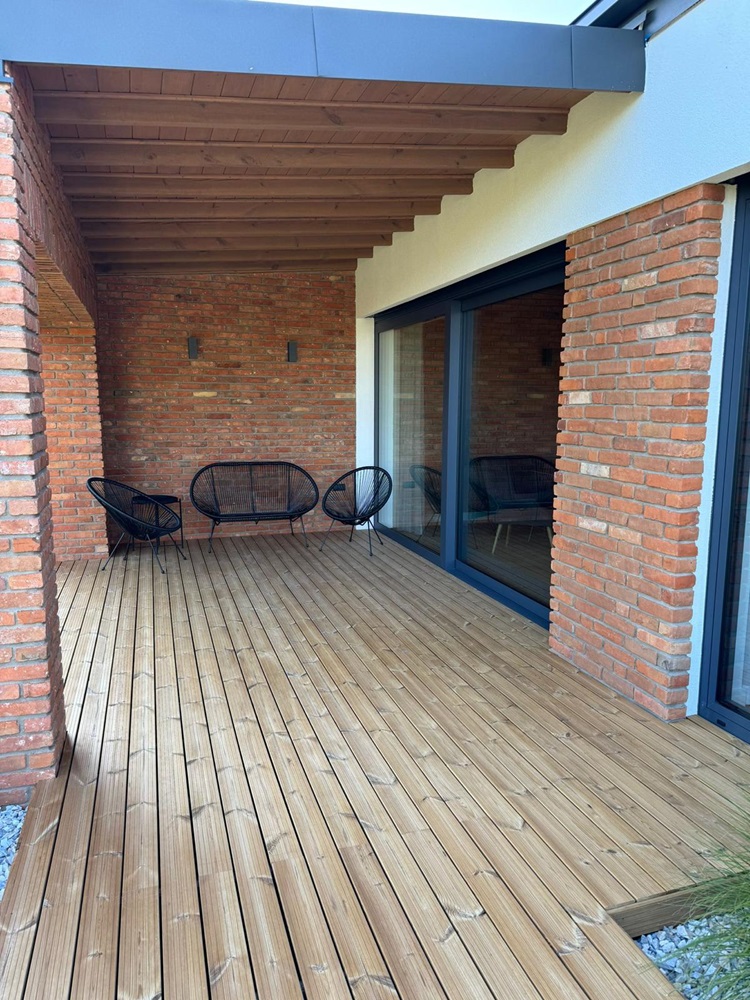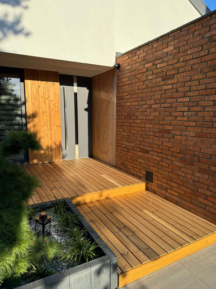 taras drewniany deska tarasowa thermo sosna elewacja drewno + cegła elewacja thermo sosna