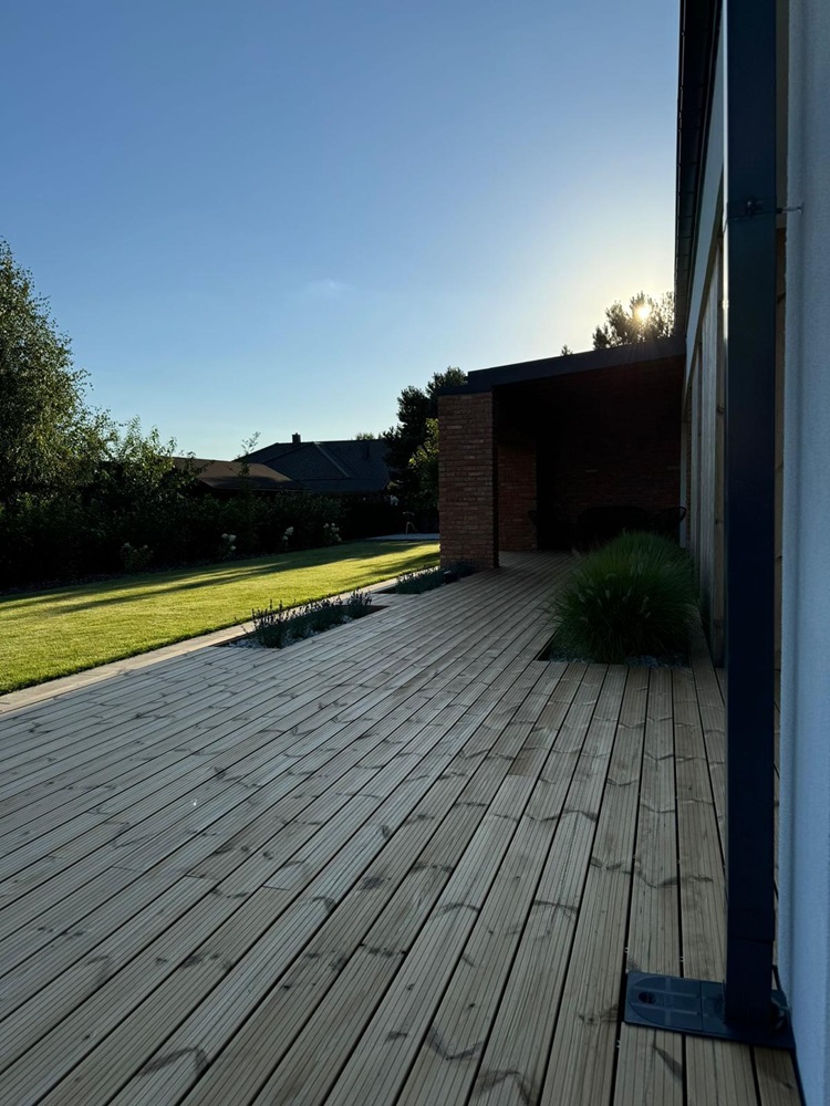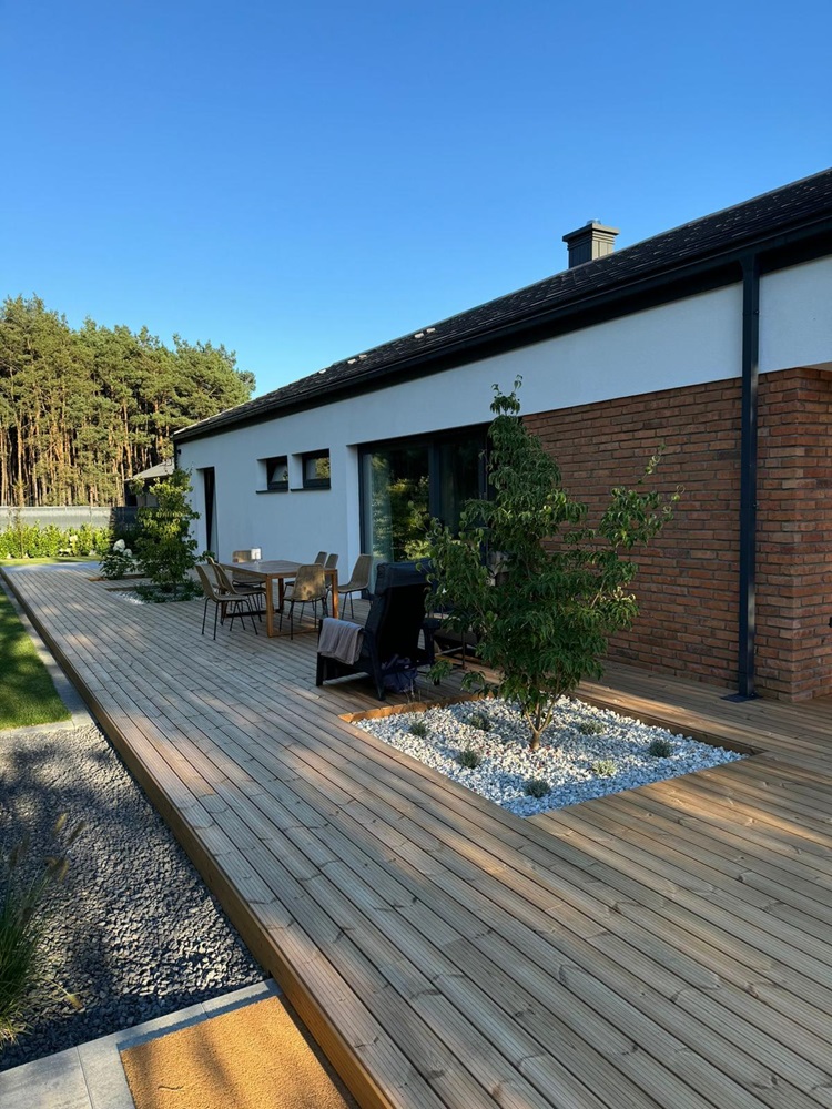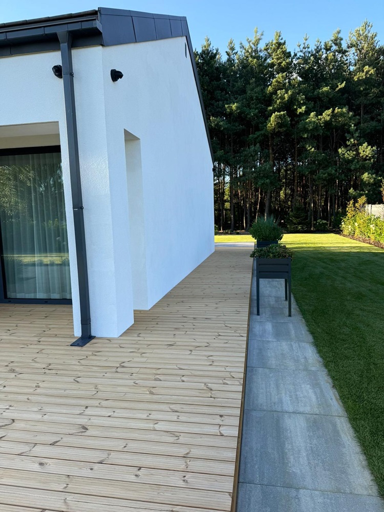 • drewniany taras przy domu jednorodzinnym zbudowaliśmy z desek z thermo sosny,