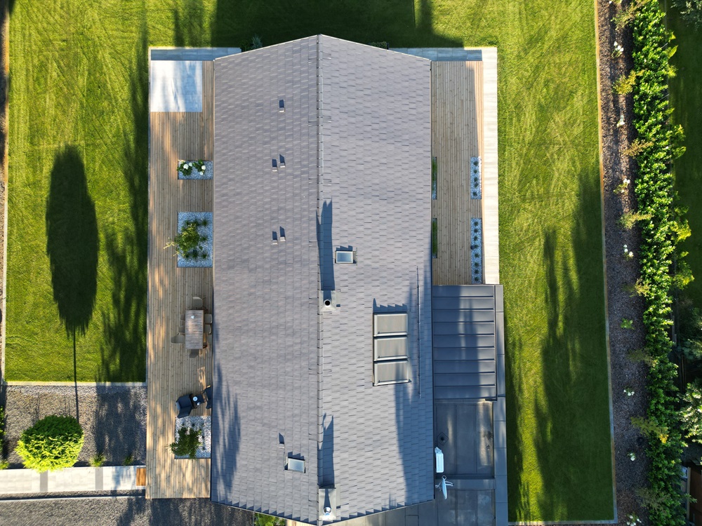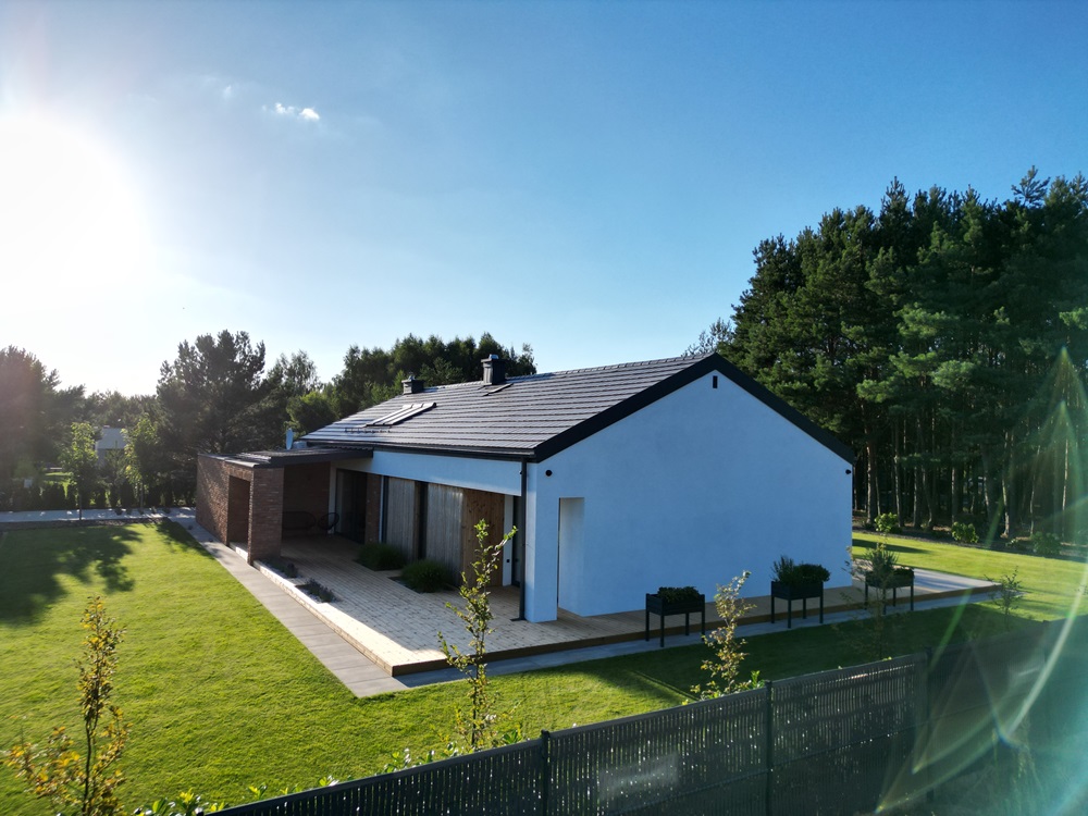 • wykonaliśmy też elewację typu drewno + cegła; zastosowaliśmy w tym celu deski elewacyjne z thermodrewna sosnowego i cegły licówki.